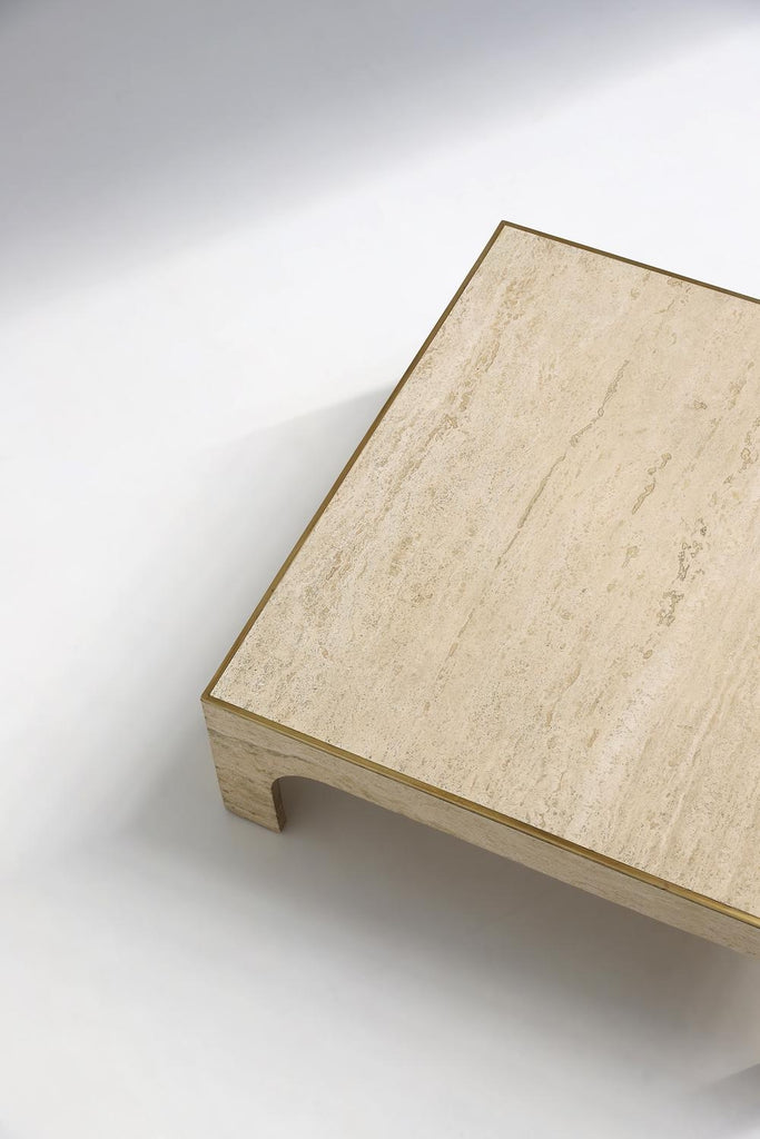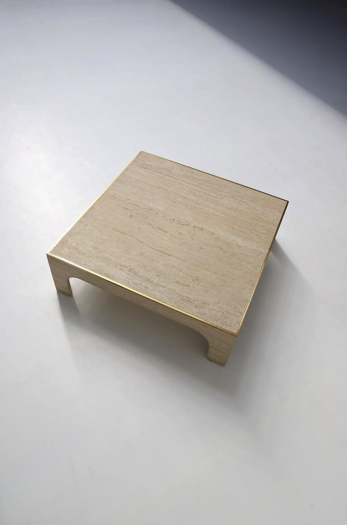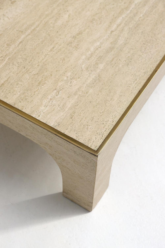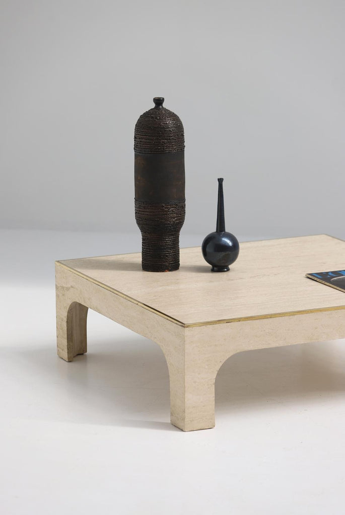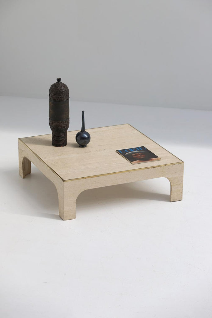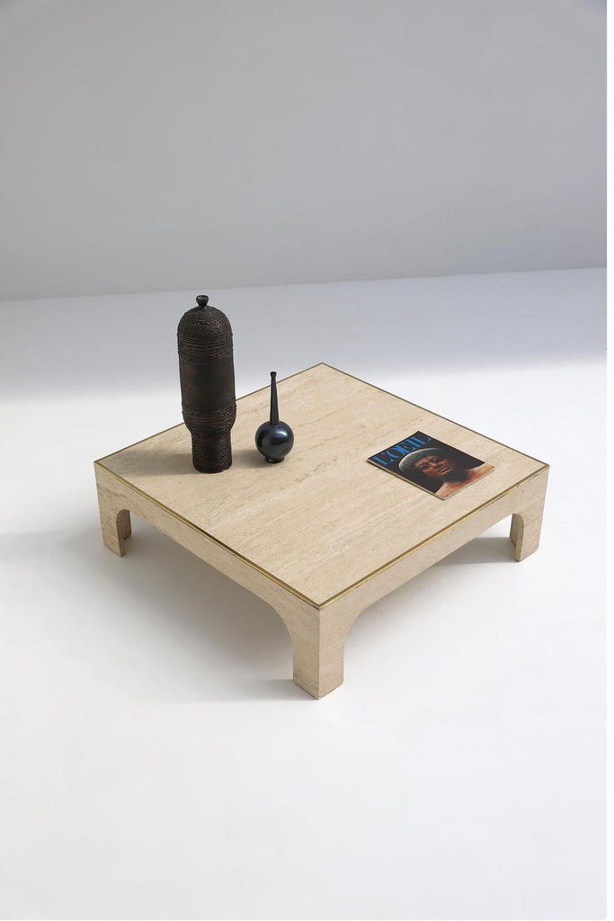 1970년대 Willy Rizzo 트래버틴 커피 테이블. 이 모델은 완전히 트래버틴으로 만들어졌으며 황동 라인으로 디테일합니다. 커피 테이블은 균열이나 자국 없이 아주 좋은 상태를 유지하고 있습니다.