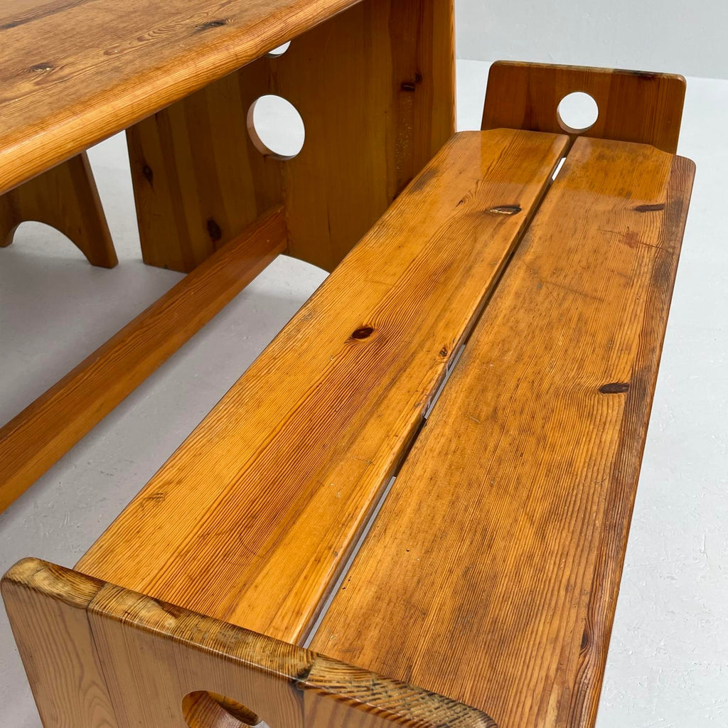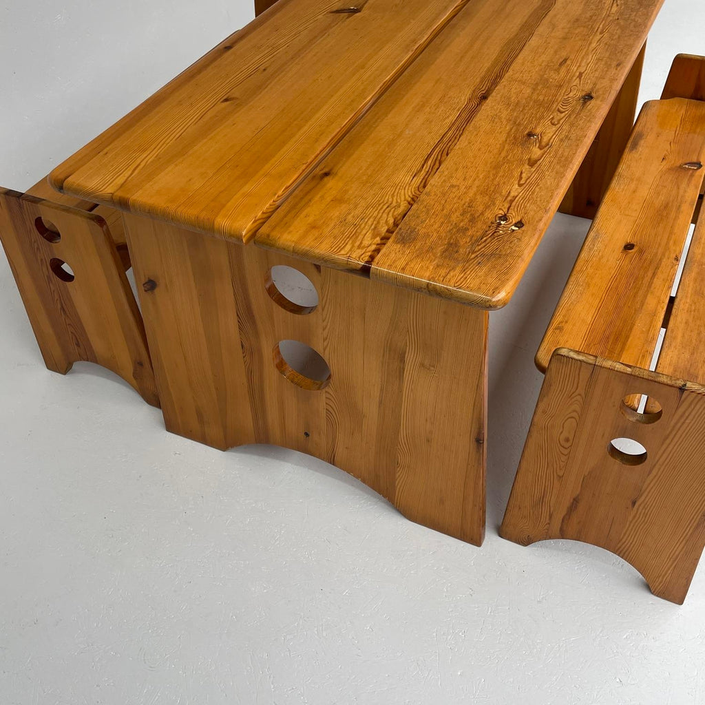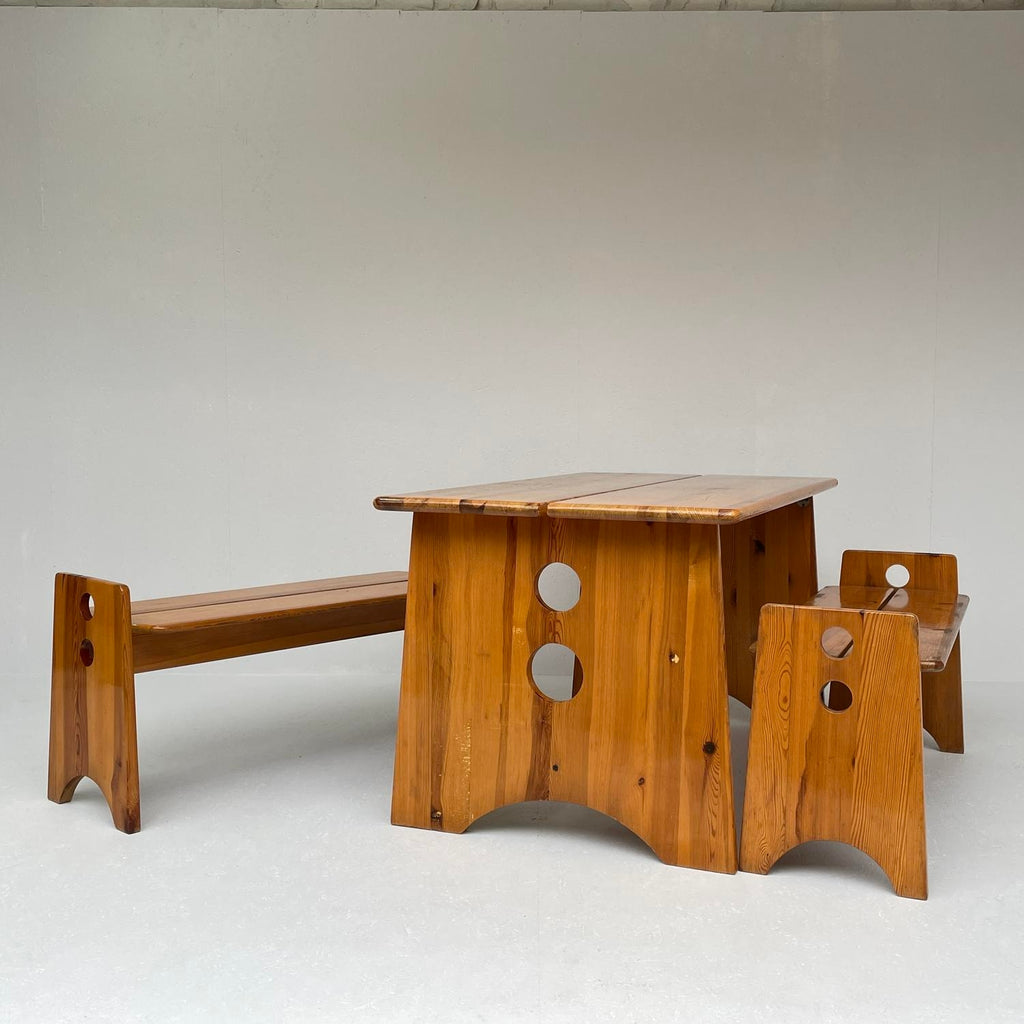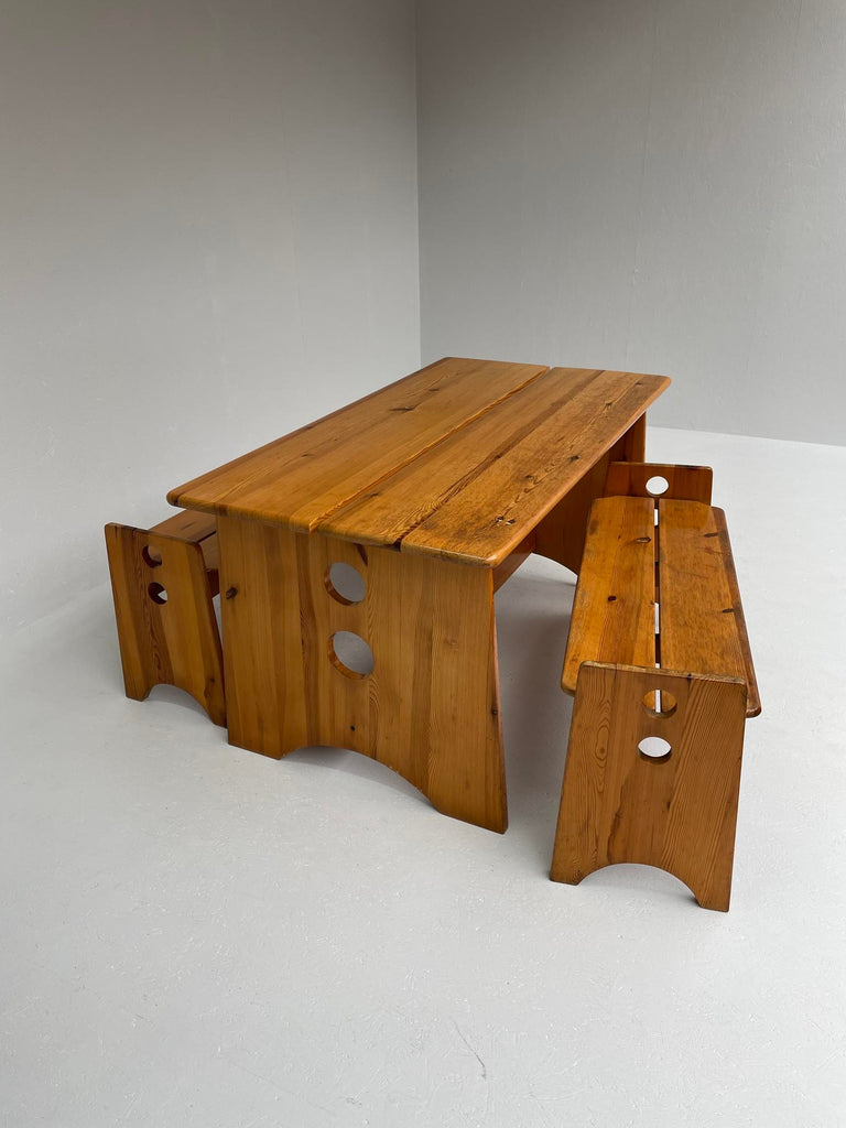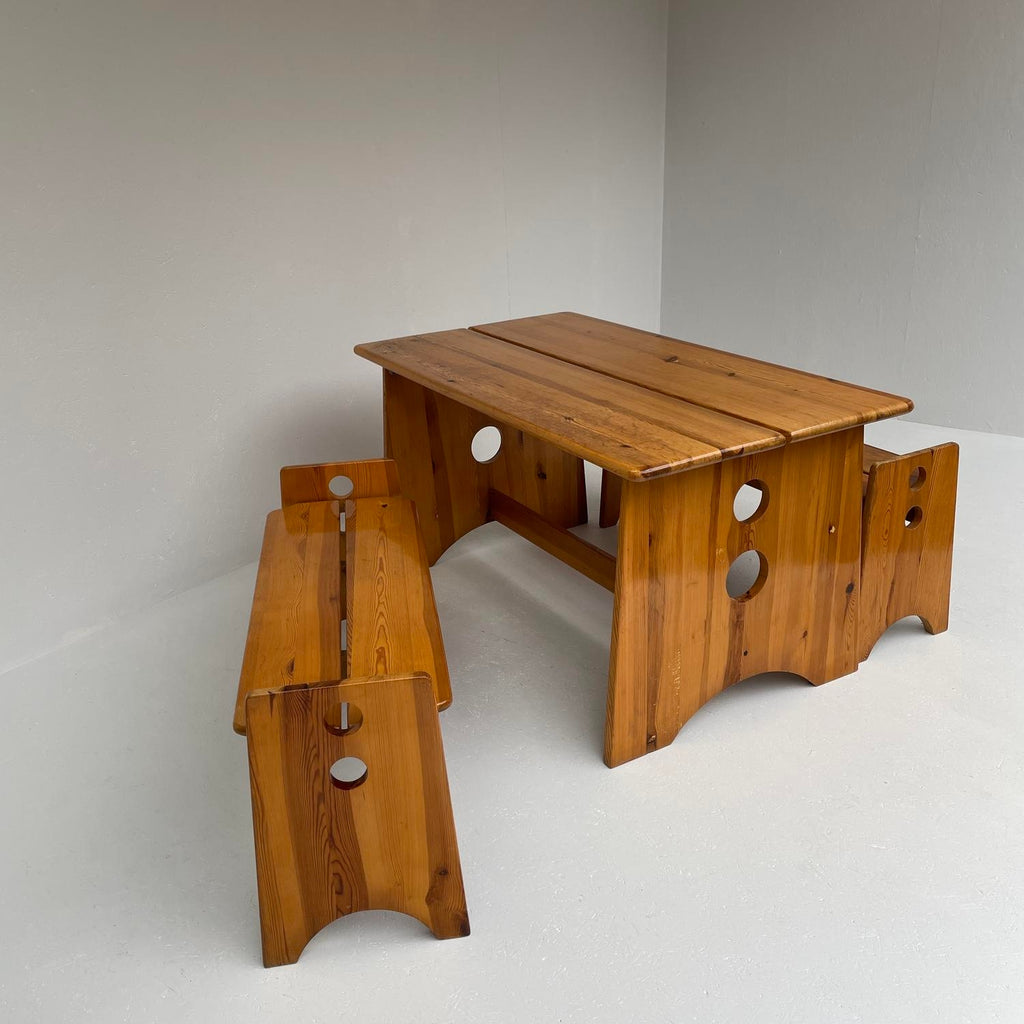 스웨덴산 원목 다이닝 세트. Furunickarn AB를 위한 Gilbert Marklund의 초안. 기간: 1969년. 이 빈티지 다이닝룸 세트에는 수제 물푸레나무 테이블과 어울리는 소파 2개가 포함되어 있습니다. 두 개의 벤치는 테이블 아래로 밀 수 있습니다. 작은 공간에 이상적입니다. 이 다이닝룸 세트는 아름다운 핀홀 연결로 수작업으로 제작되었습니다. 즐거운 식사, 게임 또는 작업. 크기: 테이블: H72 L139 W77; 벤치: L113 D35 SH45