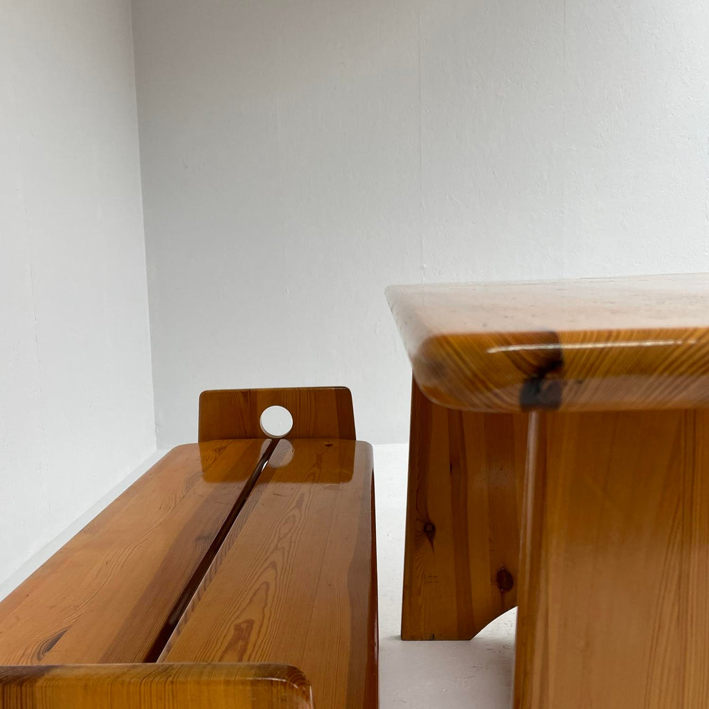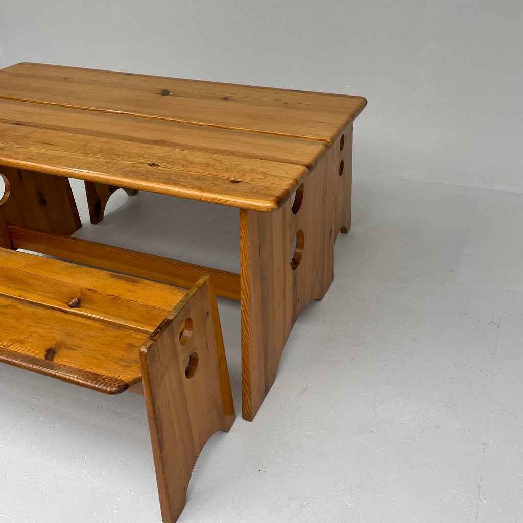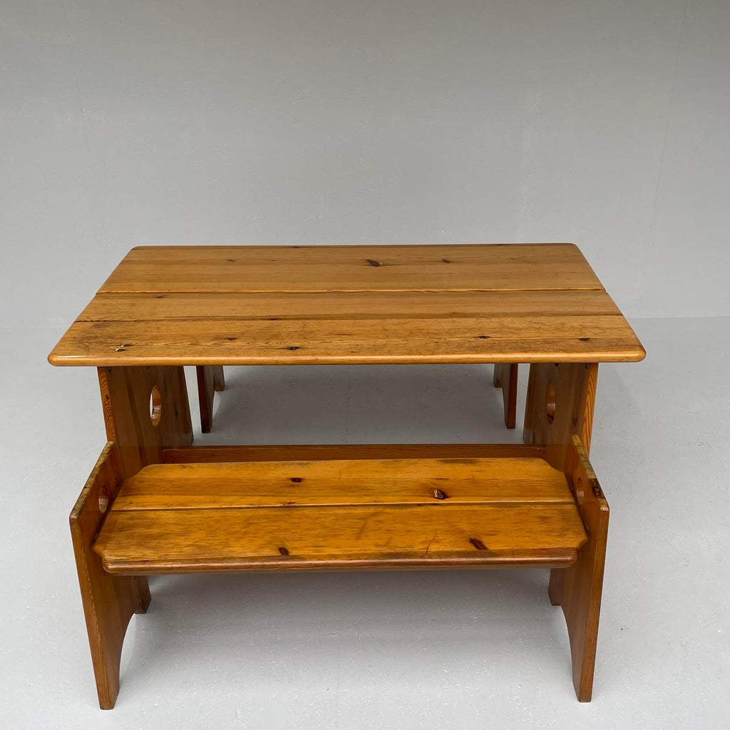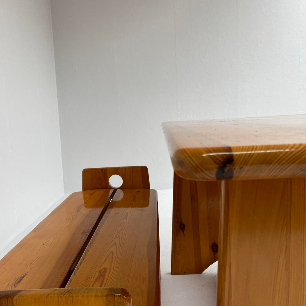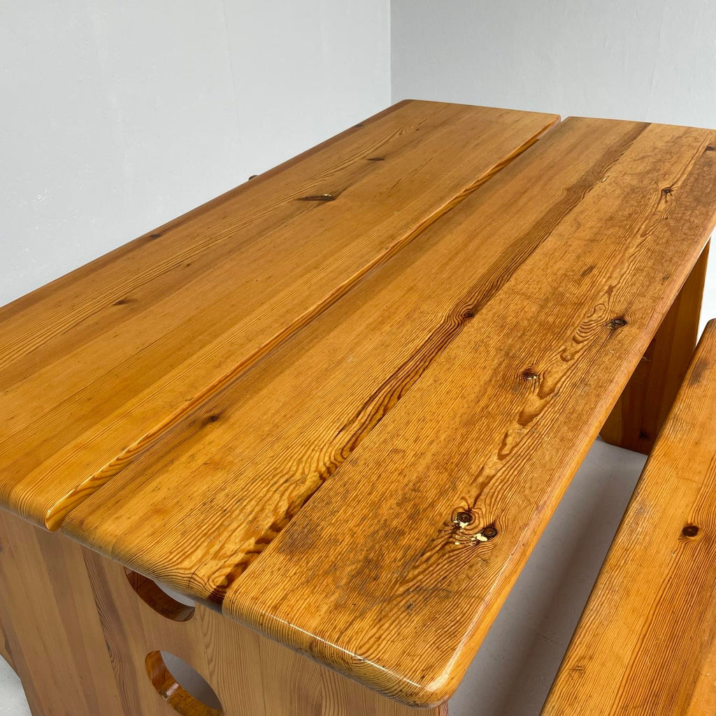 스웨덴산 원목 다이닝 세트. Furunickarn AB를 위한 Gilbert Marklund의 초안. 기간: 1969년. 이 빈티지 다이닝룸 세트에는 수제 물푸레나무 테이블과 어울리는 소파 2개가 포함되어 있습니다. 두 개의 벤치는 테이블 아래로 밀 수 있습니다. 작은 공간에 이상적입니다. 이 다이닝룸 세트는 아름다운 핀홀 연결로 수작업으로 제작되었습니다. 즐거운 식사, 게임 또는 작업. 크기: 테이블: H72 L139 W77; 벤치: L113 D35 SH45