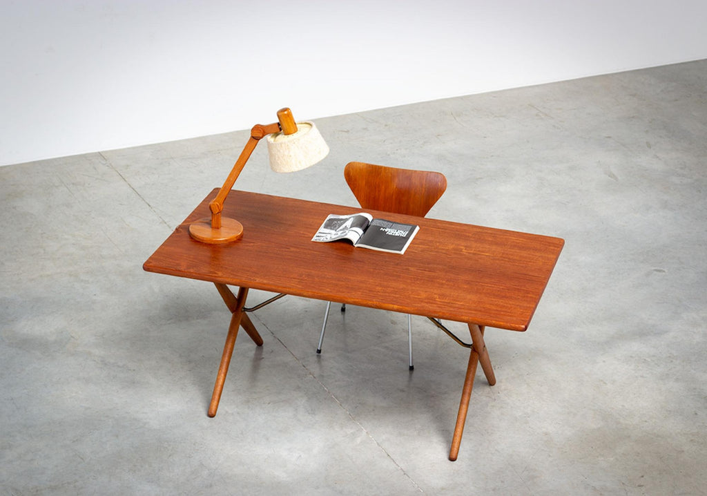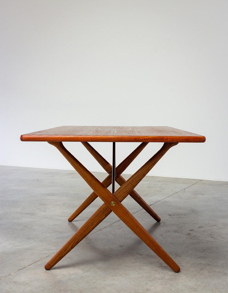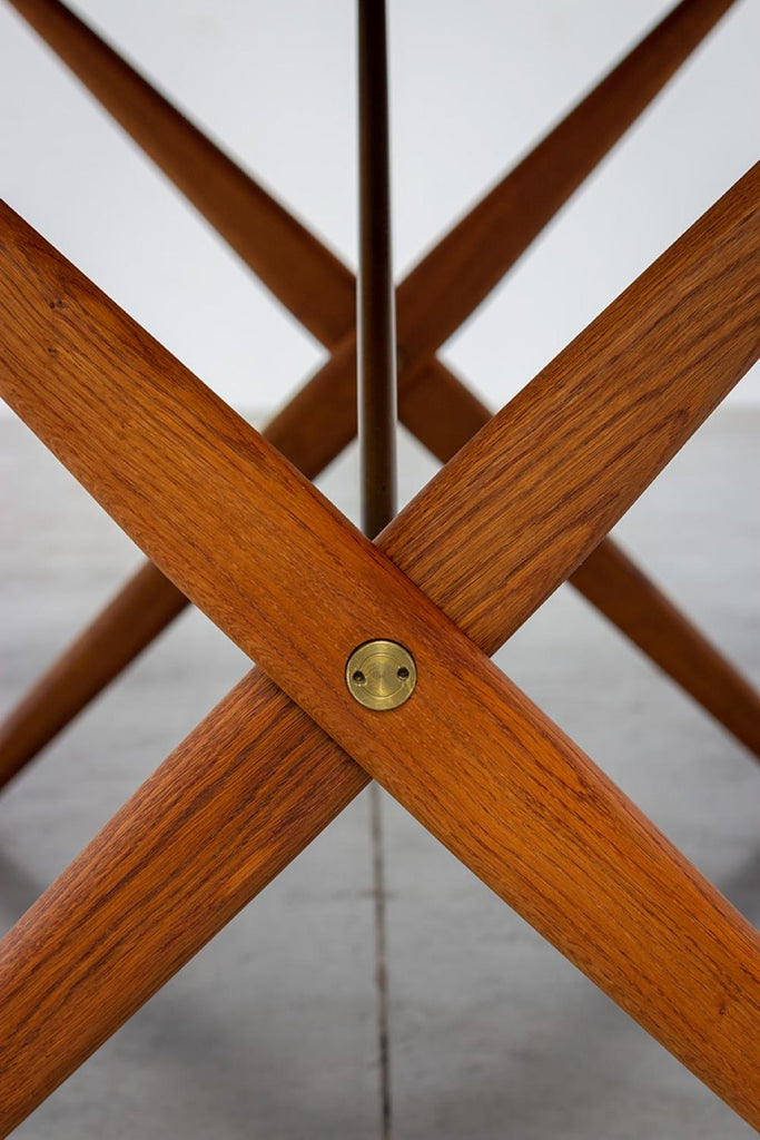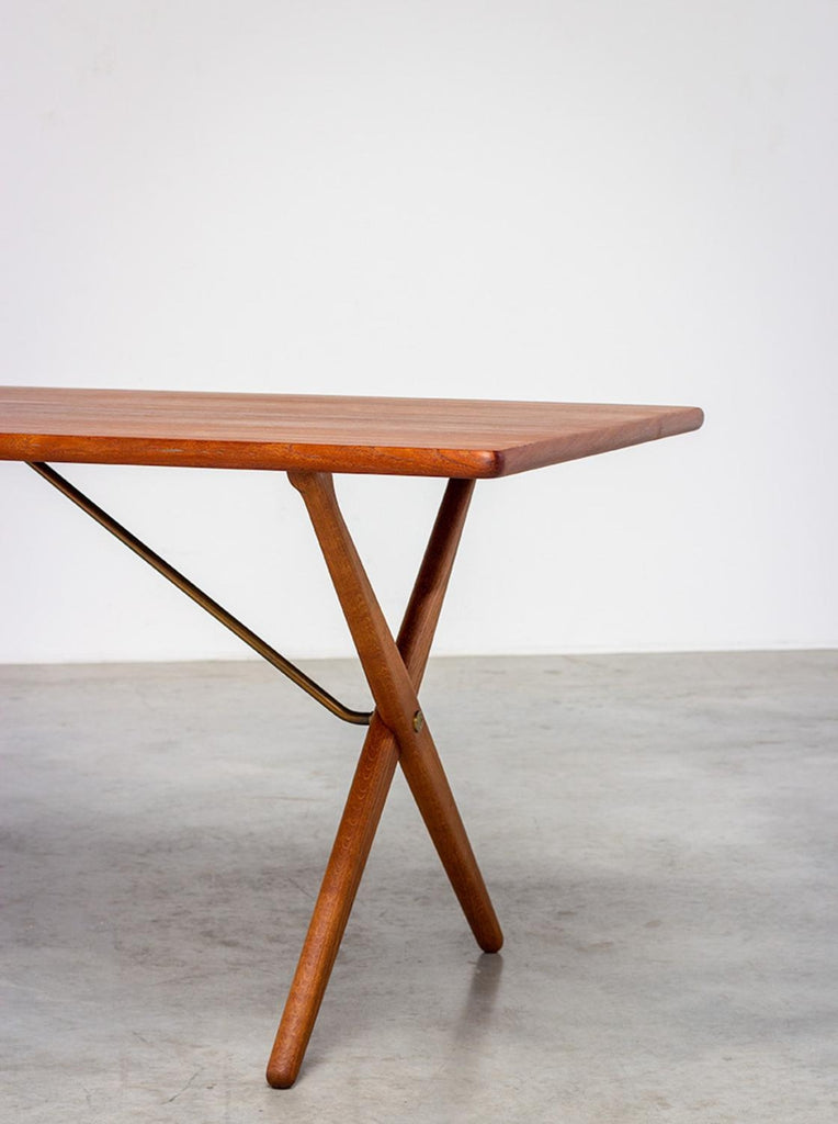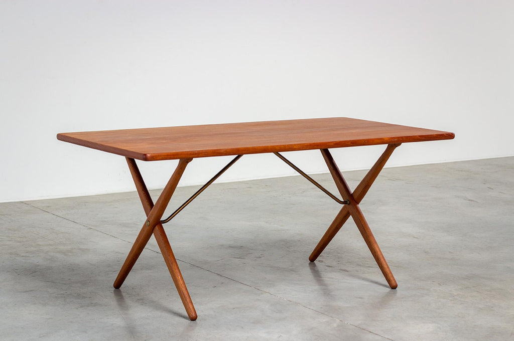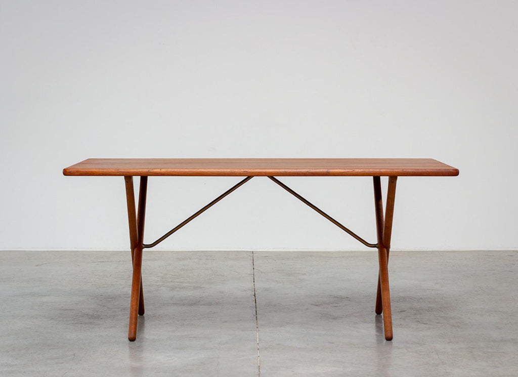 다이닝테이블, 모델 'AT 303' 또는 '목마 테이블'. 1955년 Hans Wegner가 디자인했습니다. 마스터 캐비닛 제작자 Andreas Tuck이 제작했습니다. 전체 티크 나무 버전 160cm 또는 63인치. 십자 모양의 다리를 함께 유지하는 브러시 처리된 관형 스템이 있는 플로팅 테이블 상판. 그 아래에는 'Fabrikat Andr. 턱. Arkitekt Hans J. Wegner 덴마크'. 미니멀한 외관과 형태와 기능에 중점을 둔 이 테이블은 스칸디나비아 모던 디자인의 좋은 예입니다. 이 테이블은 책상으로도 사용할 수 있습니다.