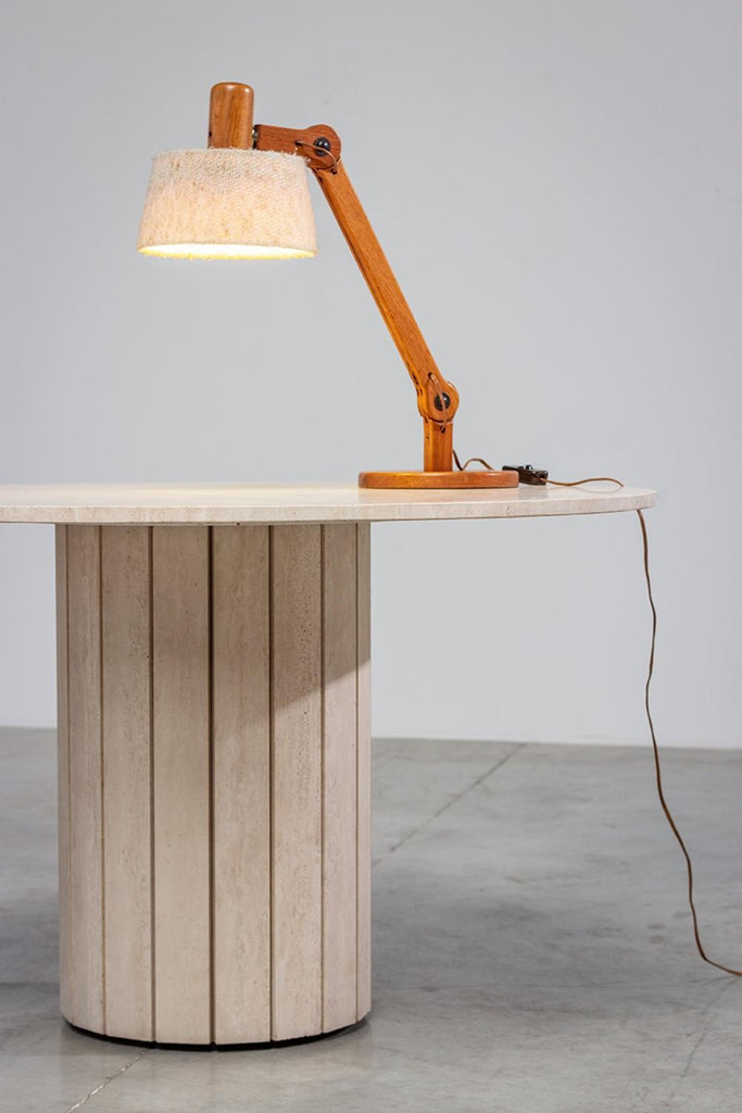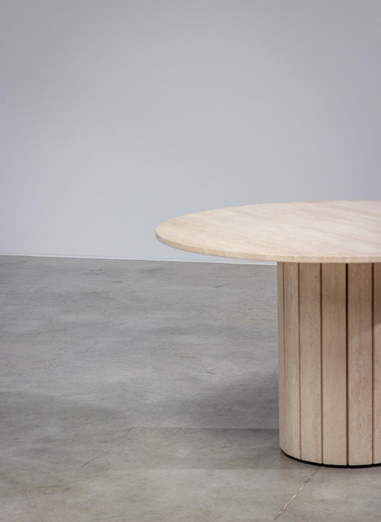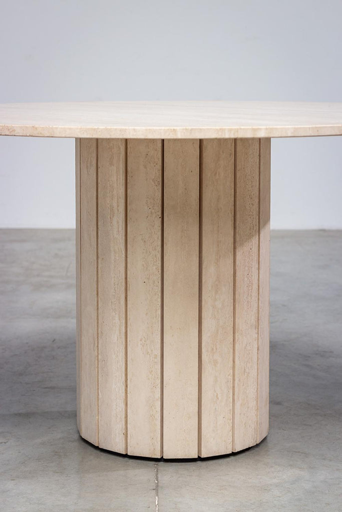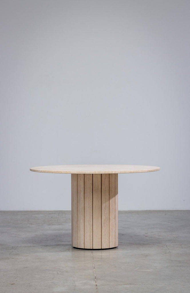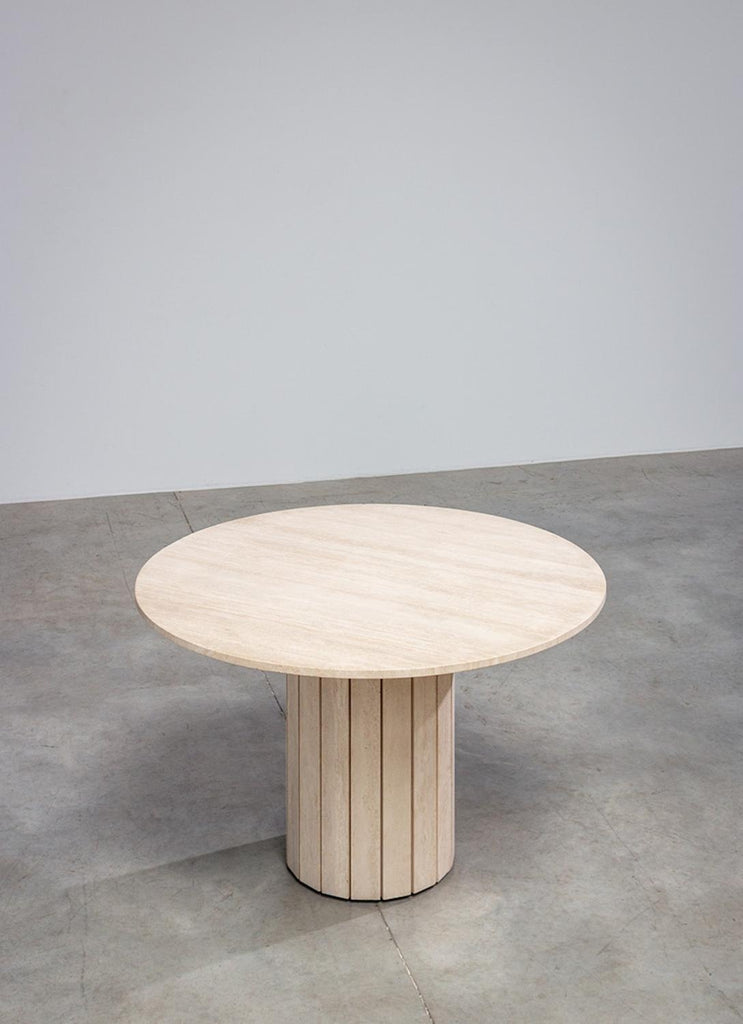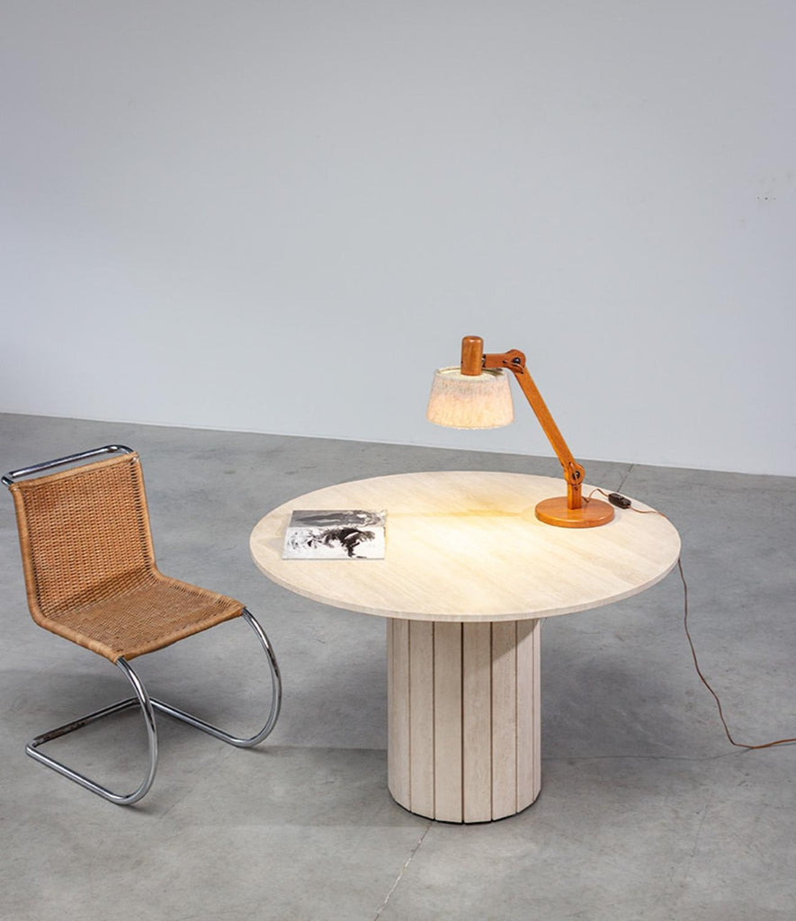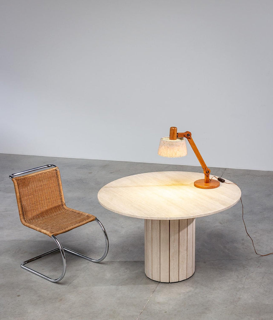 1970년경 제작된 빈티지 다이닝 테이블 이 테이블은 건축학적으로 무게감있는 원형 트래버틴 하부 기둥과 두꺼운 원형 트래버틴 테이블 상판이 특징입니다. 미학은 포스트모던 디자인의 전형이며 건축 양식을 참조합니다. 어느 공간에서든 멋스럽게 잘 어우러집니다.