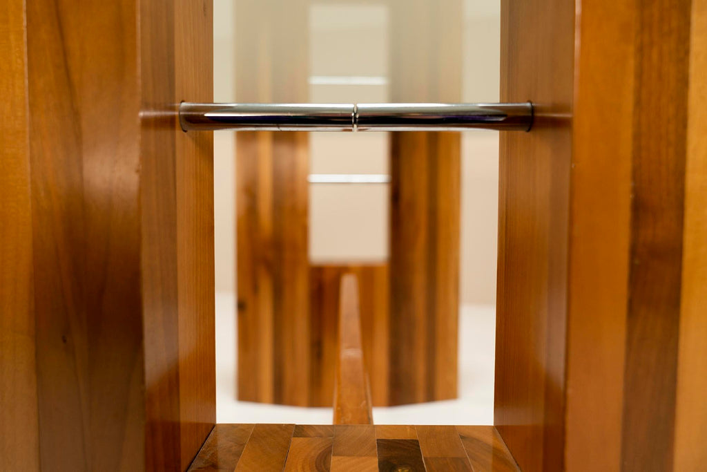 크기 때문에 책상으로도 사용할 수 있는 아름다운 이탈리안(콘솔) 테이블. 두 개의 큰 육각형 다리는 서로 단단히 연결된 호두 슬랫으로 구성됩니다. 다리 중앙에는 시스루가 있습니다. 패싯 가장자리가 있는 유리 상단 바로 아래 다리는 두 개의 알루미늄 실린더로 강화됩니다. 칸막이가 무작위 순서로 배치되어 있기 때문에 이 테이블에서는 다양한 색조의 호두나무가 돋보입니다. 블론드 노트는 어두운 톤으로 갑자기 번갈아 가며 여기저기서 일종의 자연스러운 장식으로 매듭이 보입니다. 따뜻함과 품격을 풍기는 우아한 광경입니다. 그 프레임은 네 부분으로 구성되고 다월 연결로 다리에 가라앉는 가로대에 의해 중앙에서 지지됩니다. 사용하기 쉬운 비율과 보기 좋은 외관으로 방이나 설정에 쉽게 적응할 수 있는 아이템입니다. 그 상태는 전적으로 연령과 사용에 따라 다릅니다. 다리에는 여기저기 약간의 작은 표면 긁힘과 다리 바닥에 약간의 변색이 보입니다. 모두 멋진 빈티지 룩에 기여합니다.