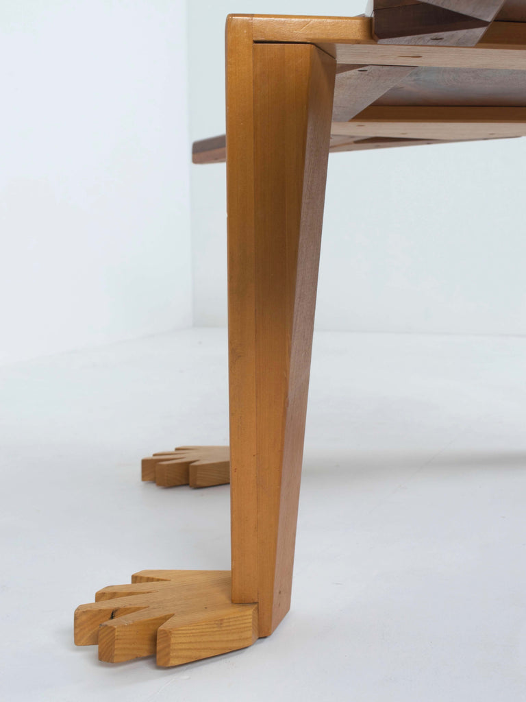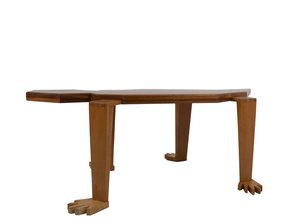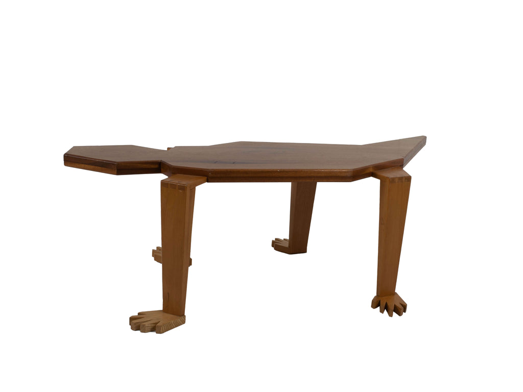 장인의 나무 '도마뱀' 커피 테이블, 아마도 1980년대. 이 테이블은 종류가 독특하고 손으로 만들어졌으며 인테리어에서 진정한 눈길을 사로 잡습니다. 도마뱀의 몸에는 두 겹의 나무 층이 있습니다. 다리에는 더브테일 조인트가 있습니다. 약간의 사용감이 있지만, 이것이 이 작품의 진정성과 수공예품에 추가되는 요소라고 생각합니다.