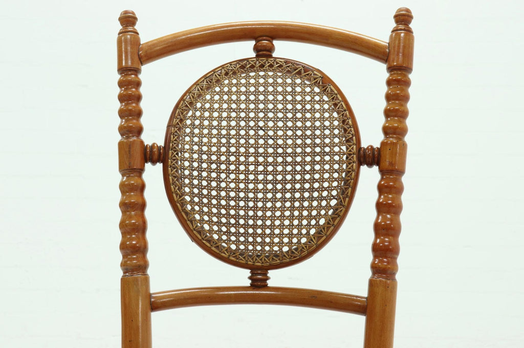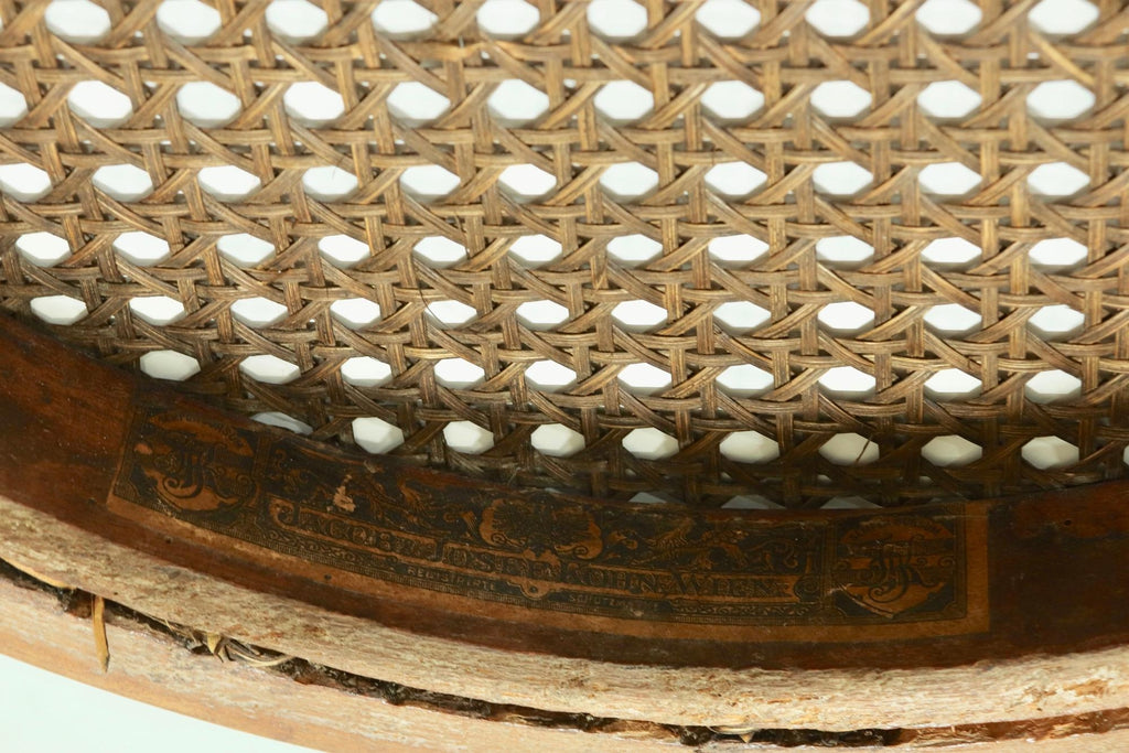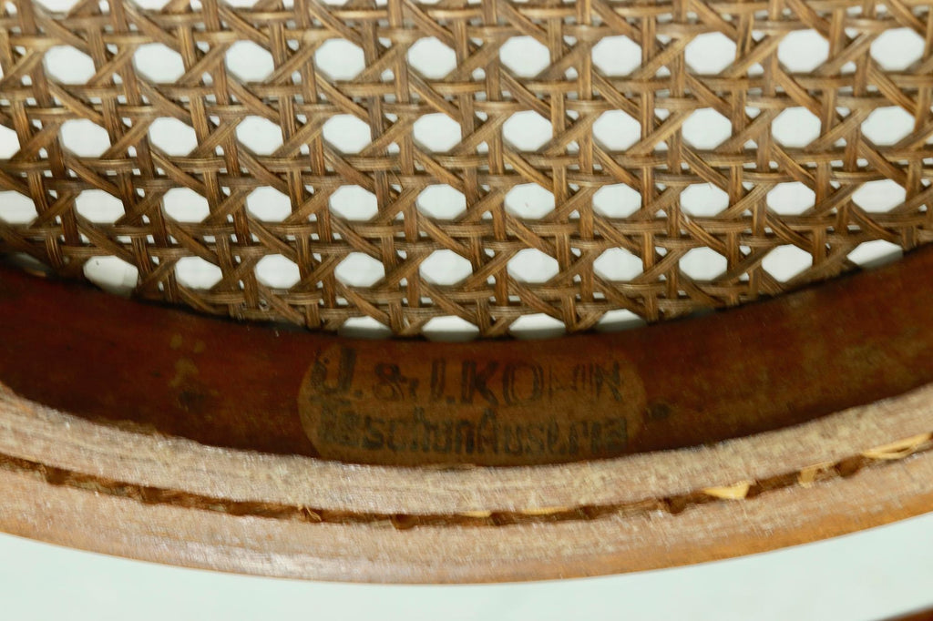 1900년대 오스트리아 가구 제조업체 Jacob & Josef Kohn의 앤티크 구부러진 나무 의자. 원래의 등나무 좌석과 등받이는 잘 보존되어 있으며 손상 없이 매우 좋은 상태를 유지하고 있습니다. 몇 가지 오래된 나무벌레의 흔적이 있습니다. 우리는 그것을 시간의 표시로 계속 볼 수 있도록 하기로 결정했습니다. 활동적인 나무벌레가 없습니다.