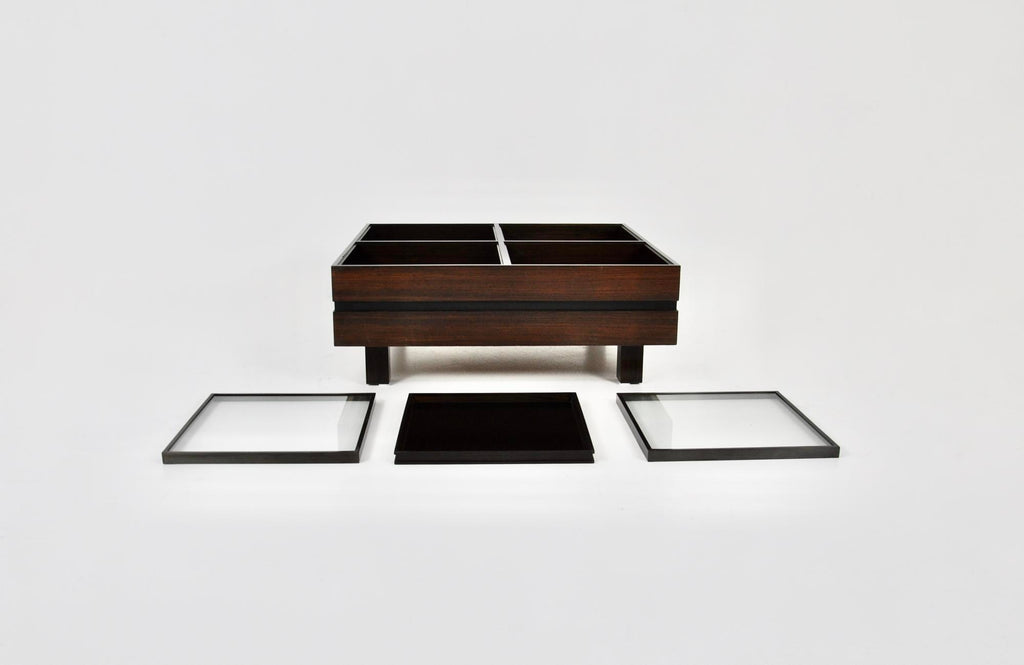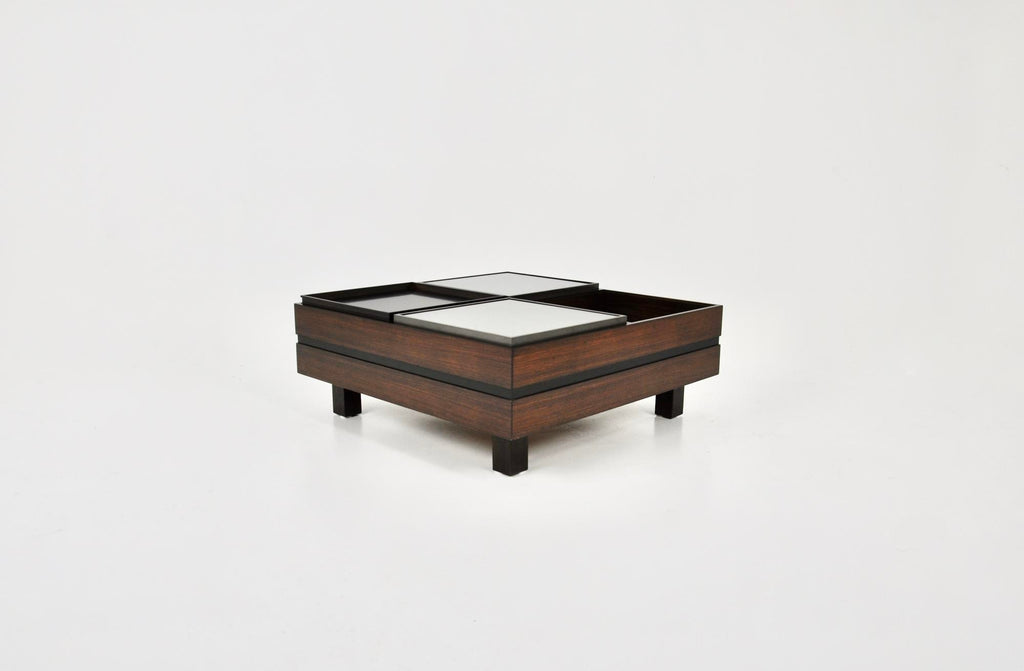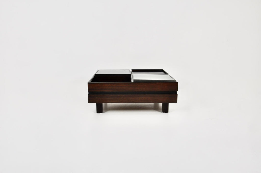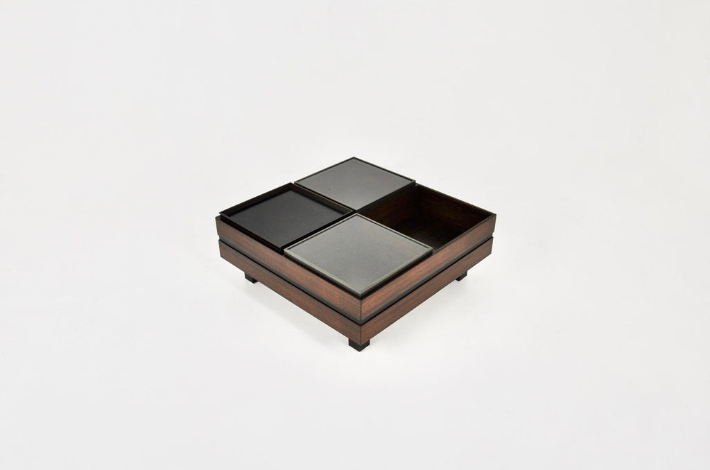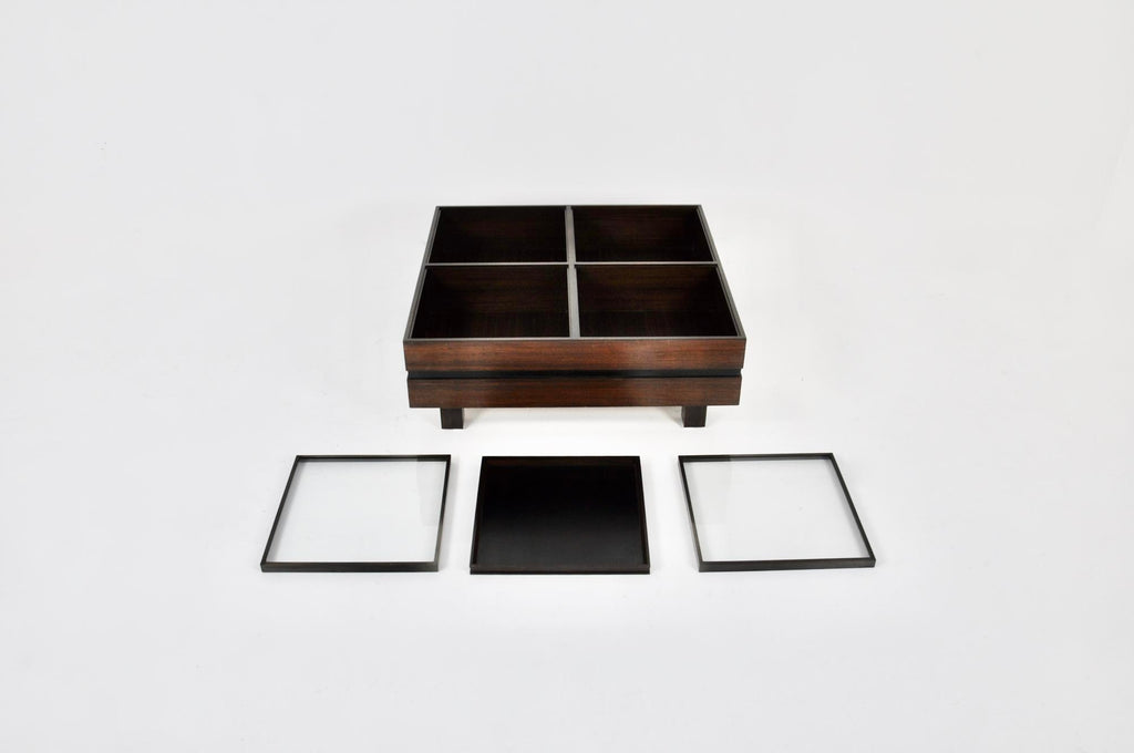 4개의 수납 공간이 있는 원목 커피 테이블. 상단과 2개의 유리 패널이 있습니다. 모든 것이 모듈식입니다. 커피 테이블의 시간과 나이로 인한 마모.