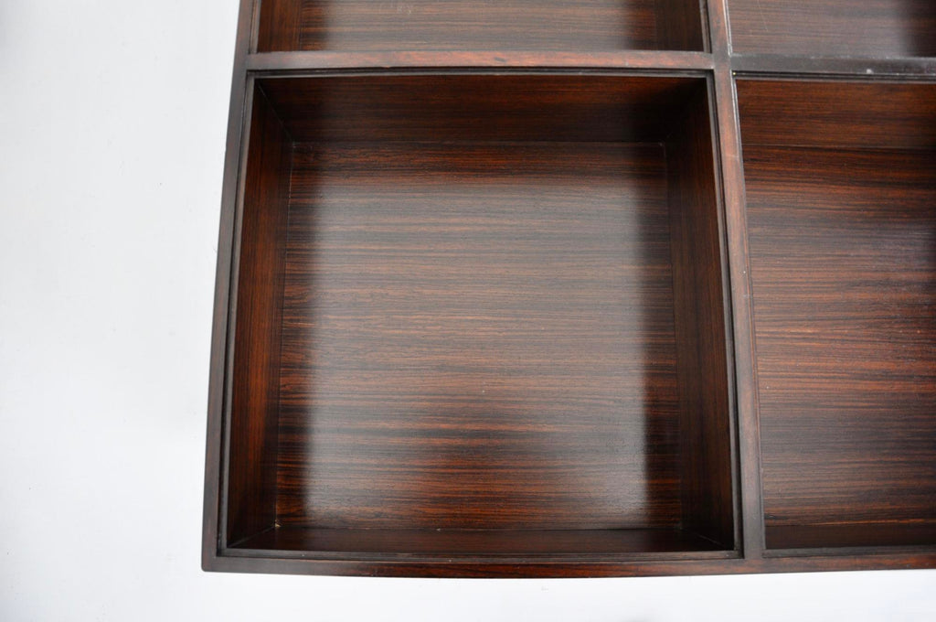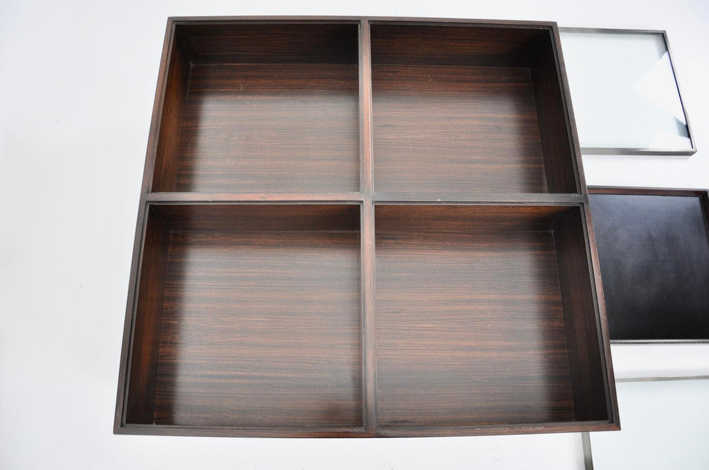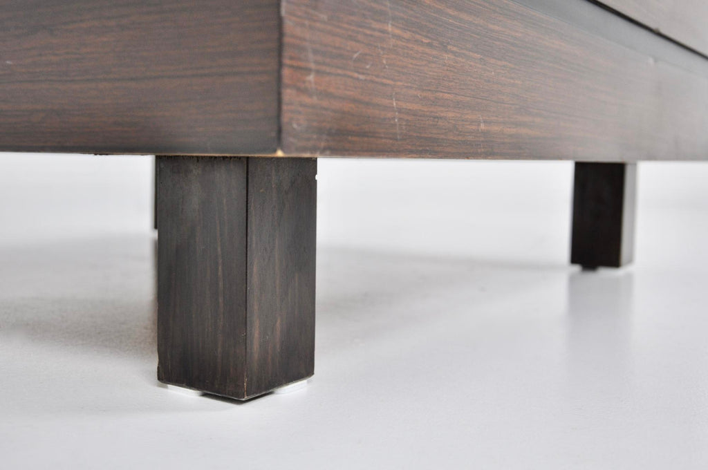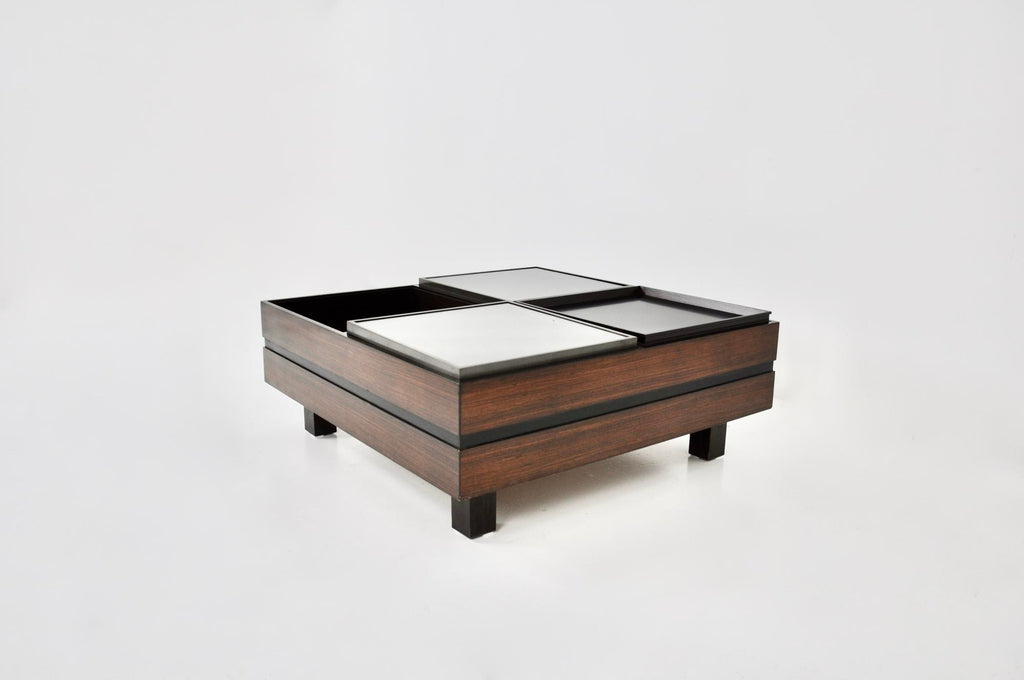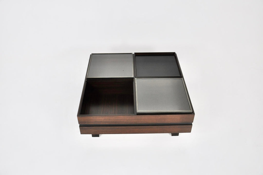 4개의 수납 공간이 있는 원목 커피 테이블. 상단과 2개의 유리 패널이 있습니다. 모든 것이 모듈식입니다. 커피 테이블의 시간과 나이로 인한 마모.