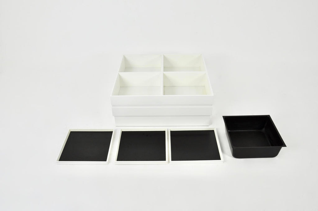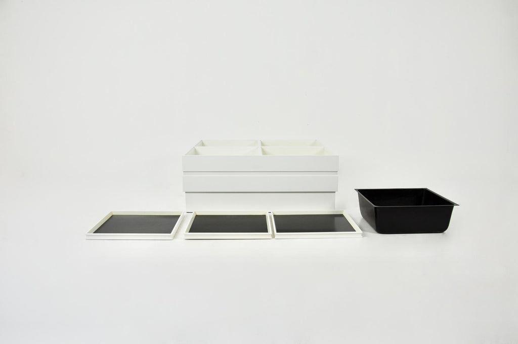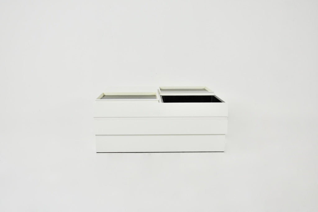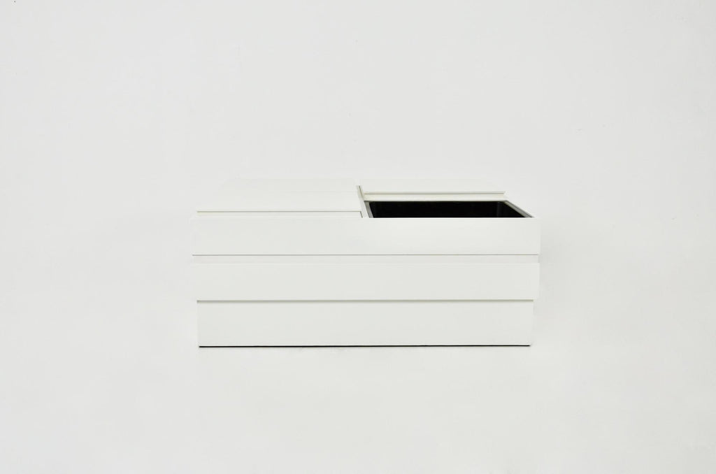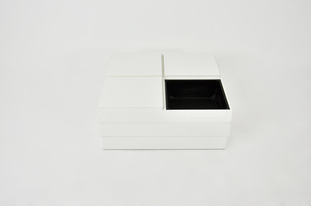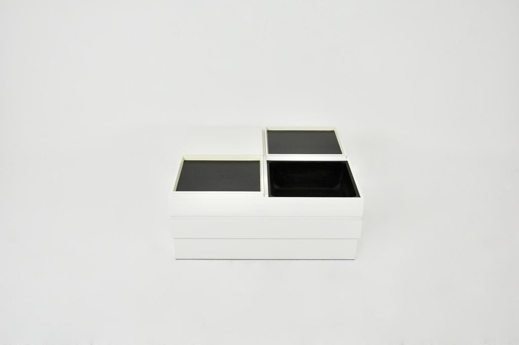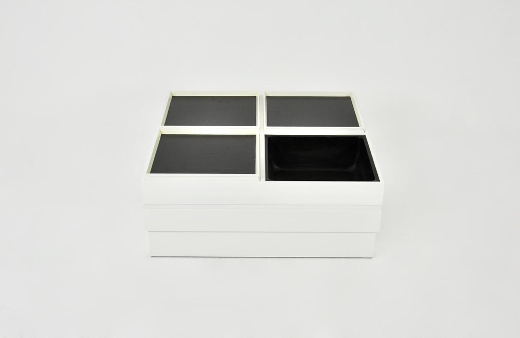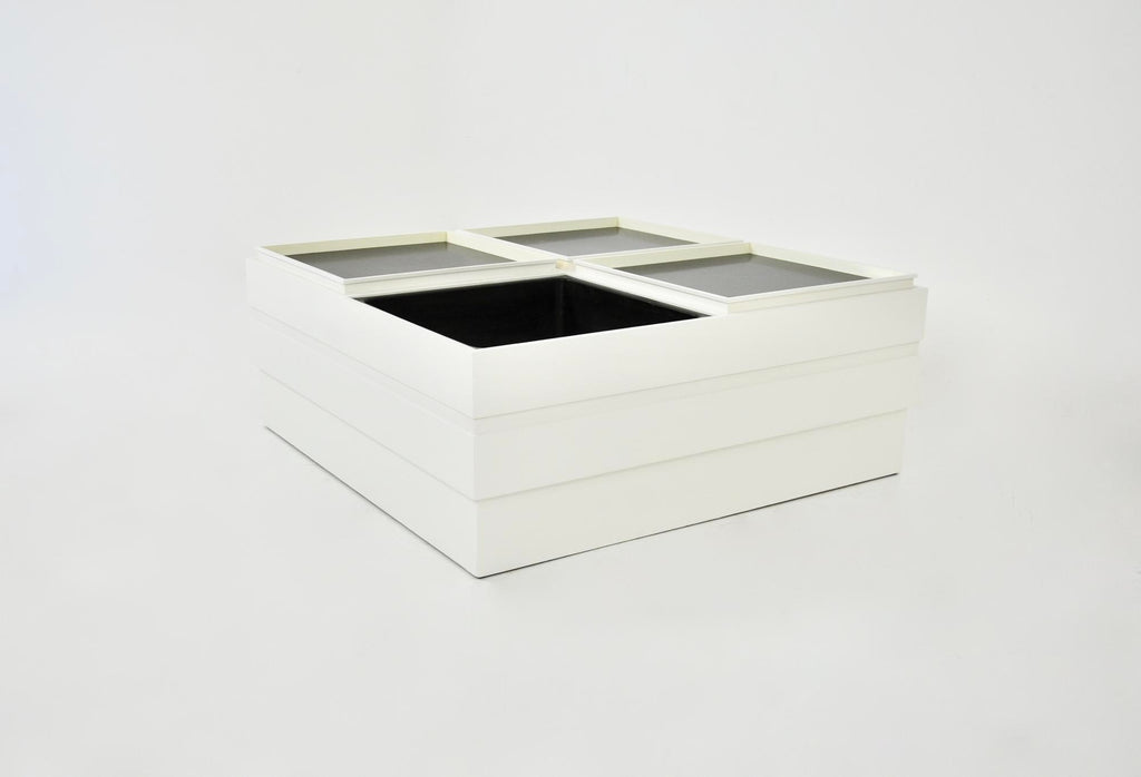 4개의 수납 공간이 있는 화이트 원목 커피 테이블. 트레이 3개와 휴지통이 있습니다. 세트는 모듈식입니다. 커피 테이블의 시간과 나이로 인한 마모.