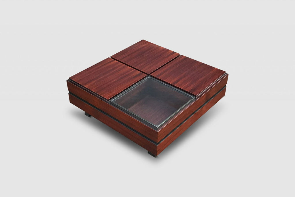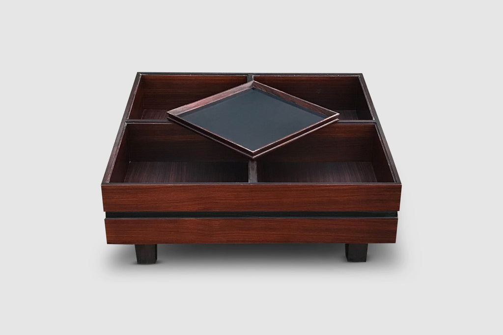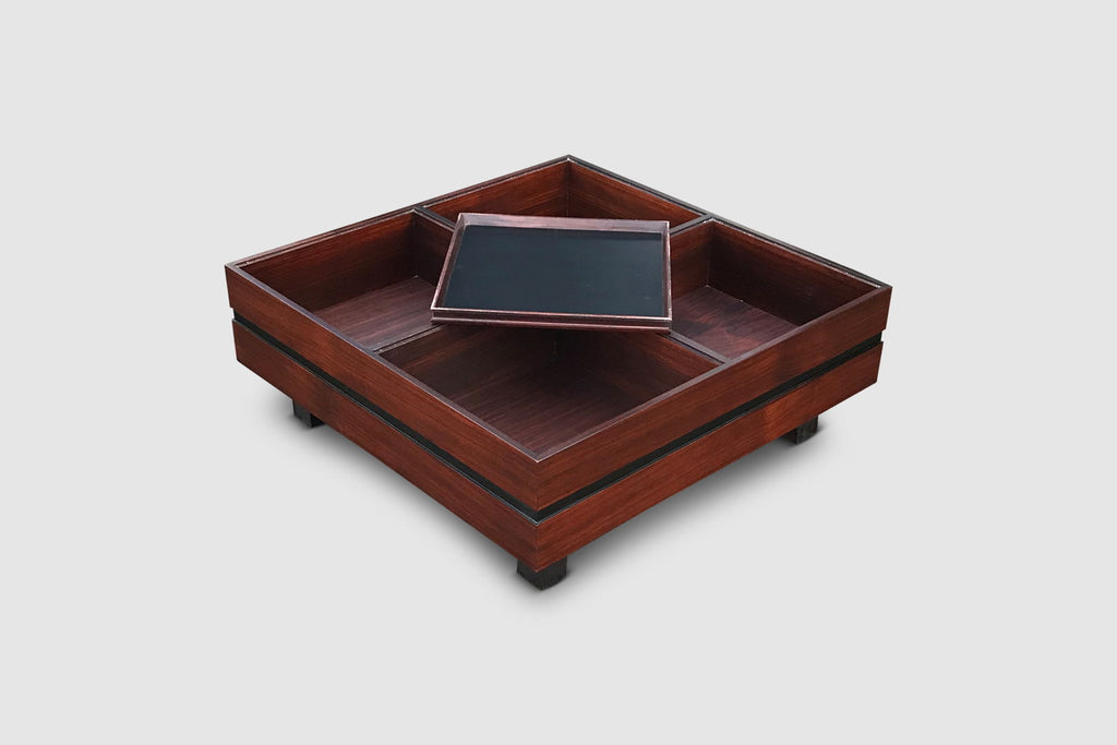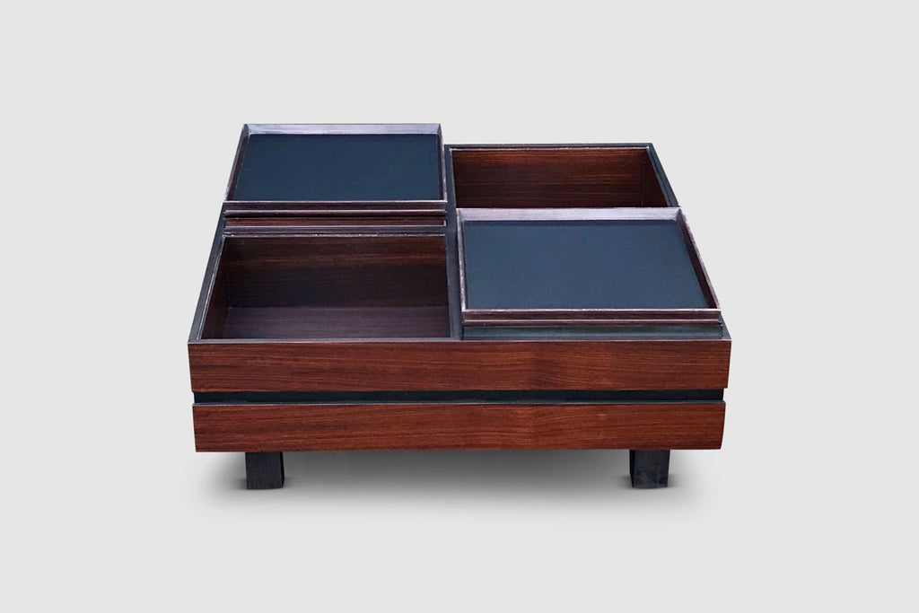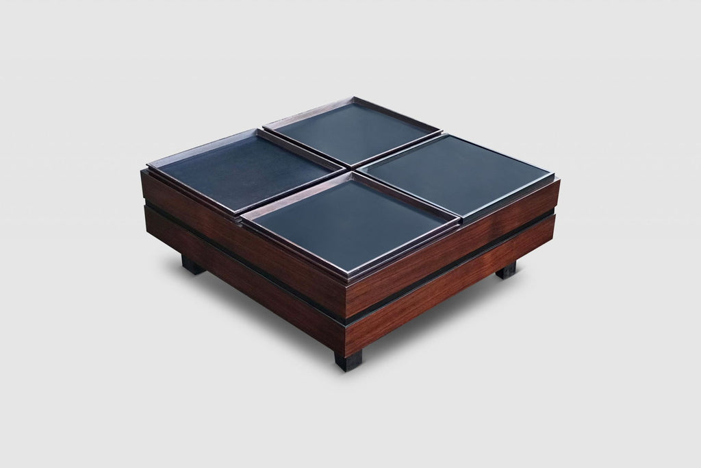 The table is compartmented into 4 different segments, each segment can be used as a storage compartment thereby providing practicality. Each storage compartment has its own separate lid. A total of 4 lids are included, consisting of 3 wood lids and 1 glass lid. The lids can be used as serving trays as well, enhancing the functionality of the table.