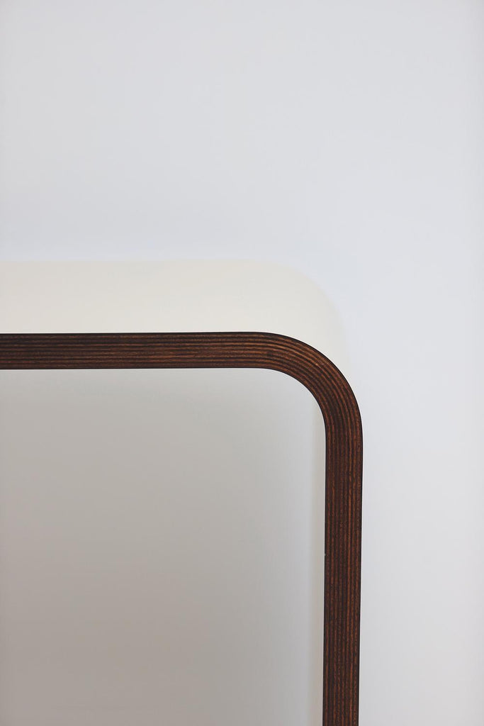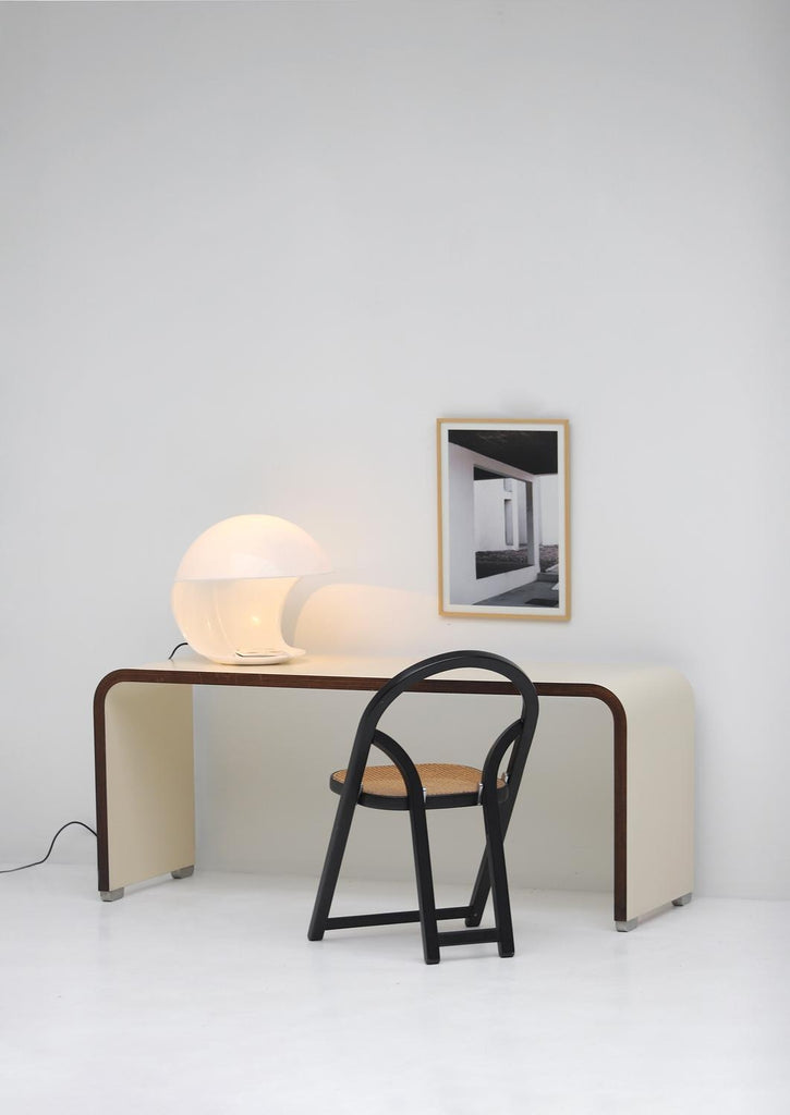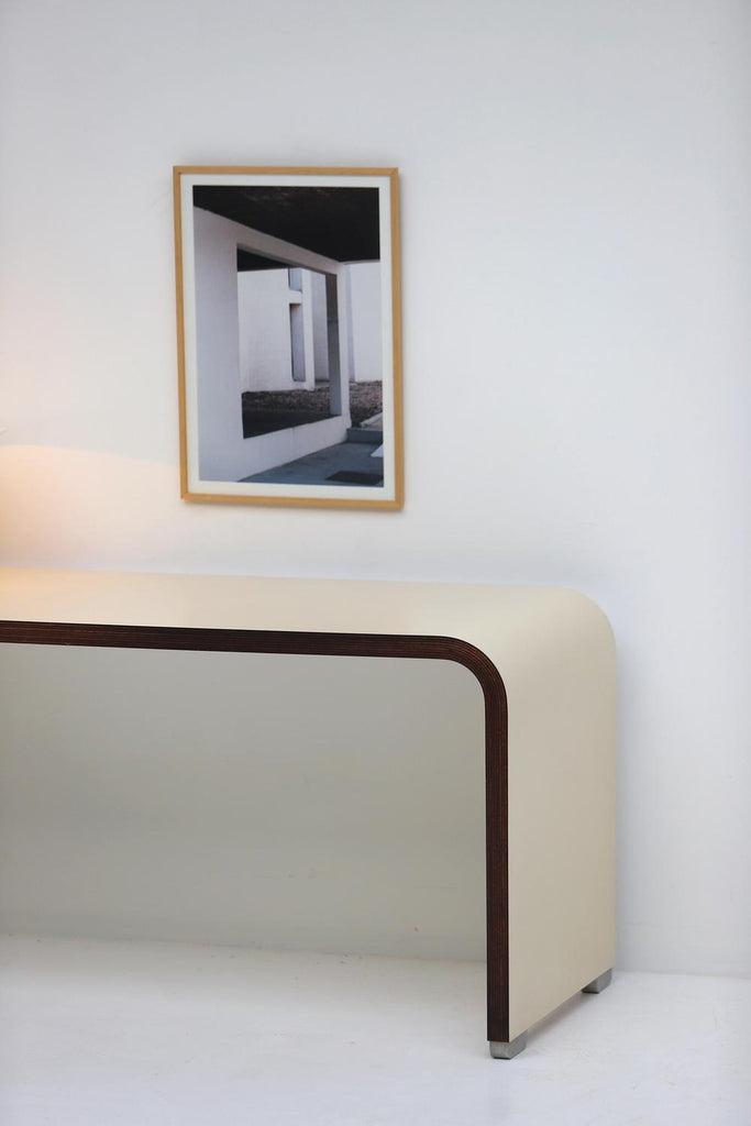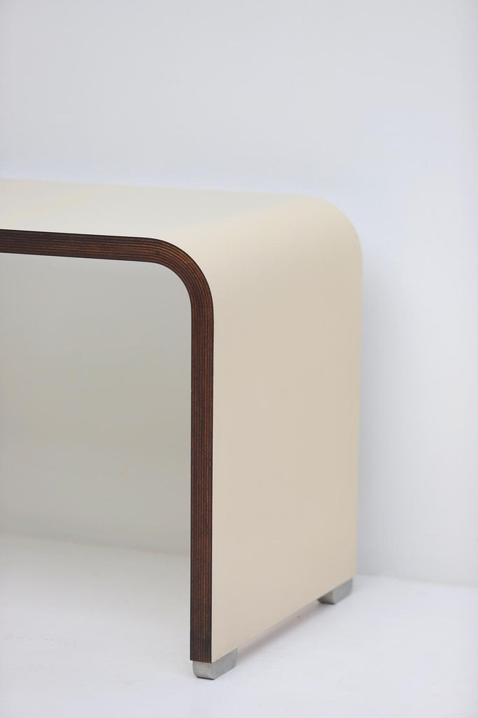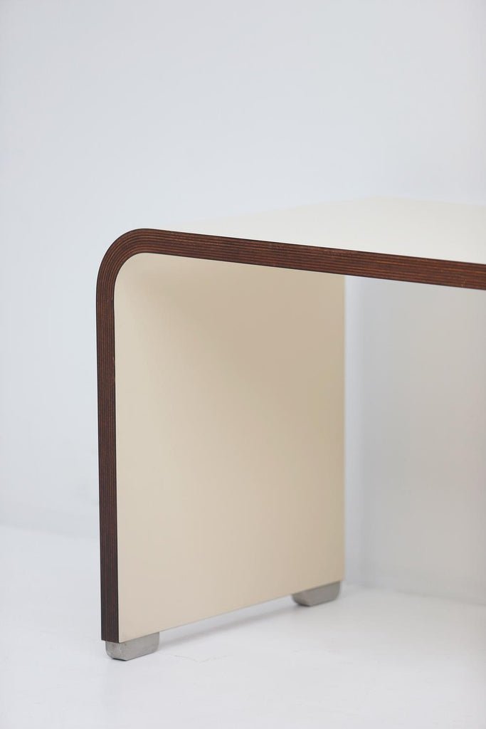 1970년대 벨기에 회사 Bergwood에서 생산한 콘솔/사이드 데스크. Bergwood는 Jules Wabbes의 작품으로 유명합니다. 'Jules Wabbes - Interior Architect'라는 책에 실린 스케치에 따르면 이 디자인이 그의 이름으로 어떻게 진행되었는지는 명확하지 않습니다. 그럼에도 불구하고 구부러진 합판과 포미카를 사용한 미니멀한 디자인은 어떤 장식 인테리어에도 통합할 수 있습니다. 멀티플렉스 스테인드 우드 사이드 라인은 아이보리 색상의 포미카와 아름답게 대조됩니다. 책상은 책상, 콘솔 또는 어린 이용 책상과 같은 다양한 용도를 가질 수 있습니다. 미미한 사용 흔적이 있는 양호하고 잘 관리된 상태입니다.