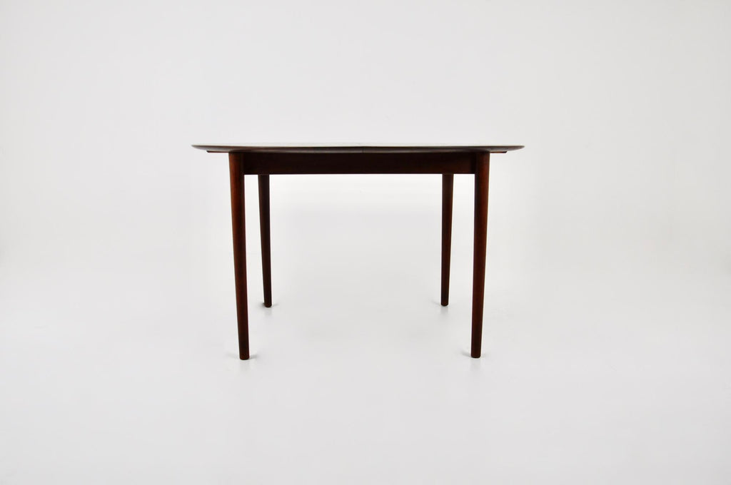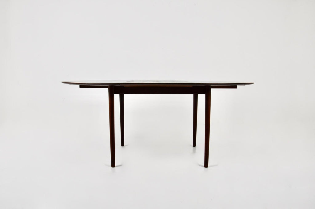 의자 6개와 확장 테이블이 있는 세트. 오픈 테이블 치수: W: 180cm D: 116cm H: 73cm 의자 치수: H 74cm, W 58cm, D 41cm. 좌석 높이 44cm. 각 단위 아래에 스탬프가 찍혀 있습니다. 시간과 나이로 인한 마모.