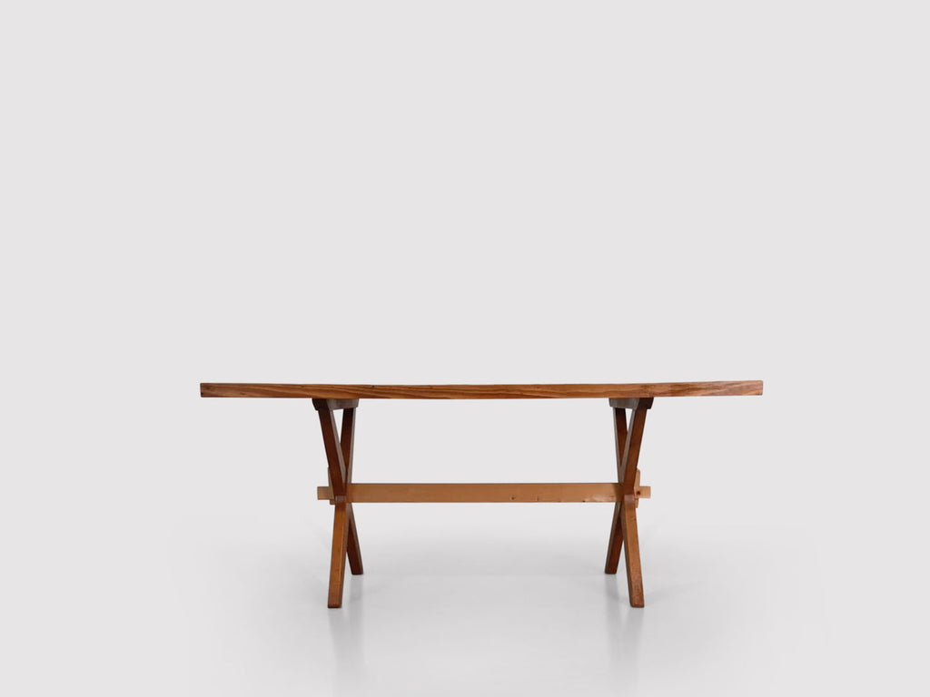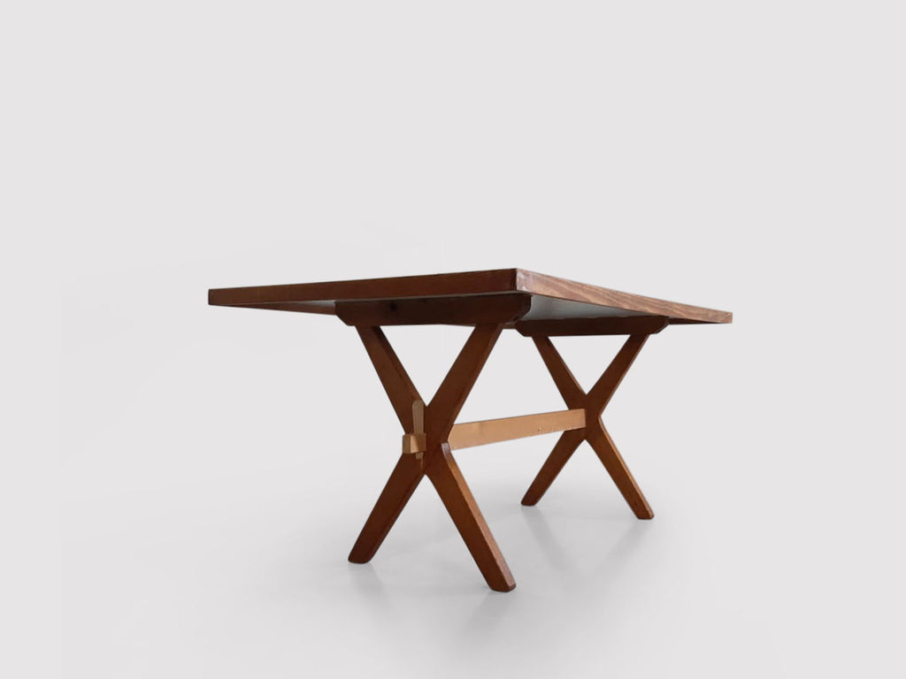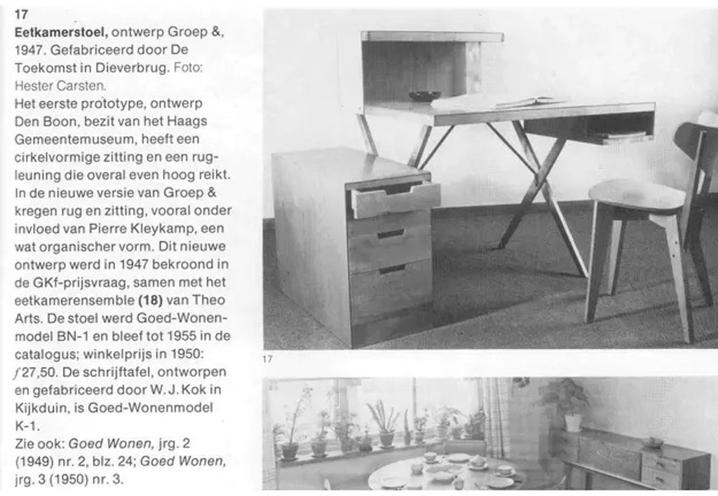 This design can only be traced back in the edition of the Goed Wonen catalog 1950. The model is here shown in a different K1 desk setup alteration. The desk is here shown as a W.J. Kok design, designed and produced by W.J. Kok for Goed Wonen. The scissor construction was redesigned/remade by Wim den Boon, while adding the horizontal beam, to make it more suitable for a dining table. It’s unclear whether this table is a one-off design by Wim den Boon or if it was produced in (small) numbers.