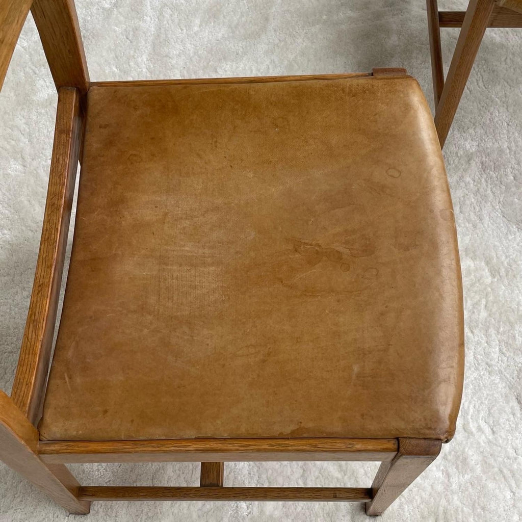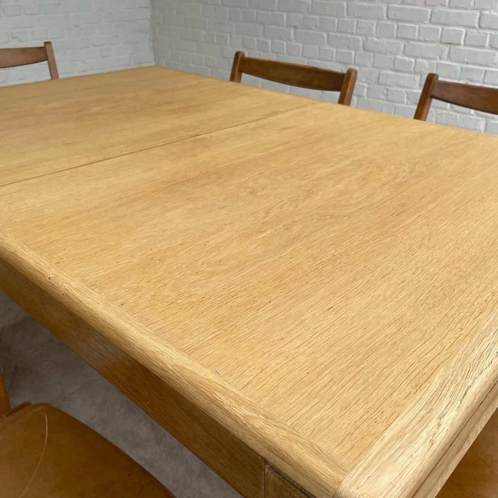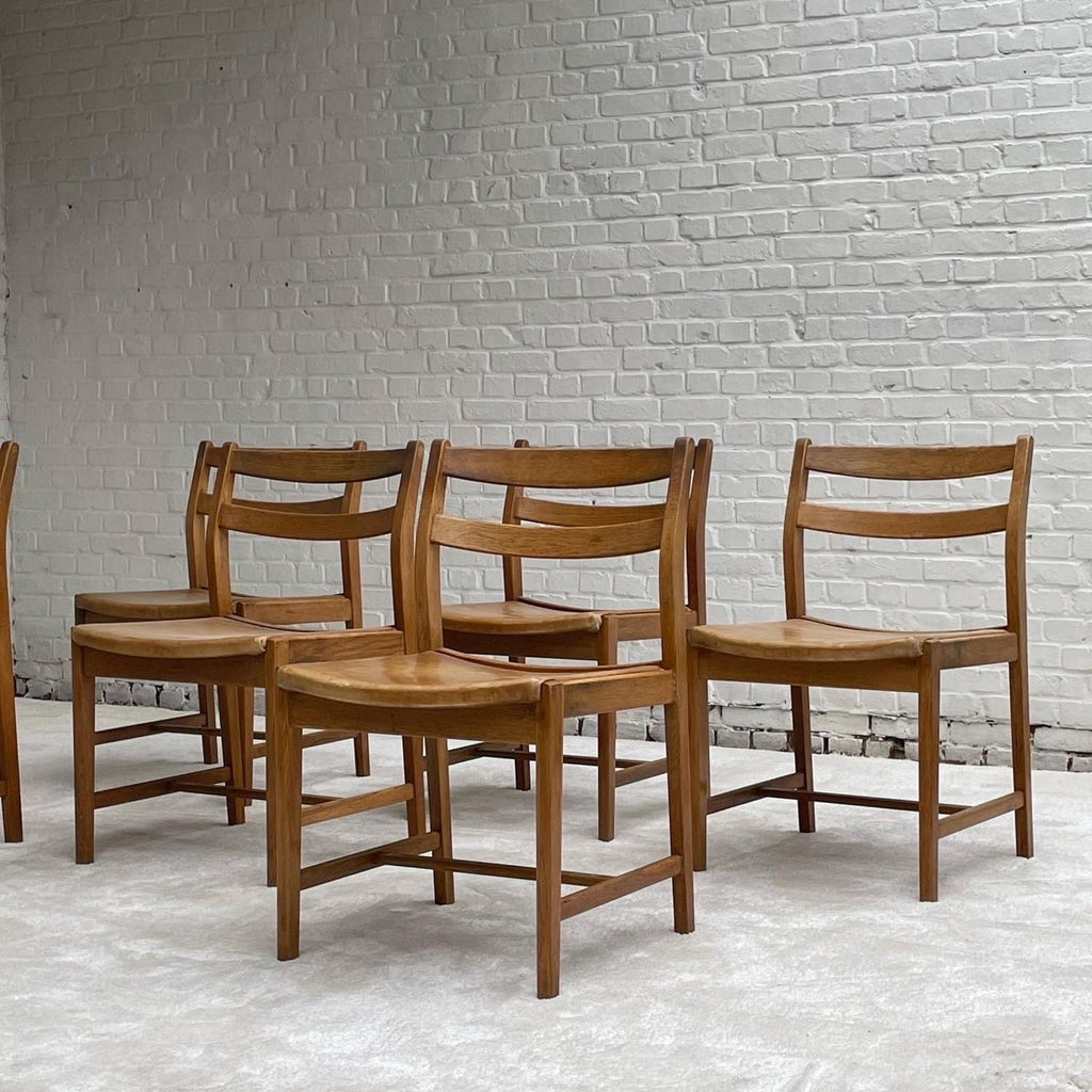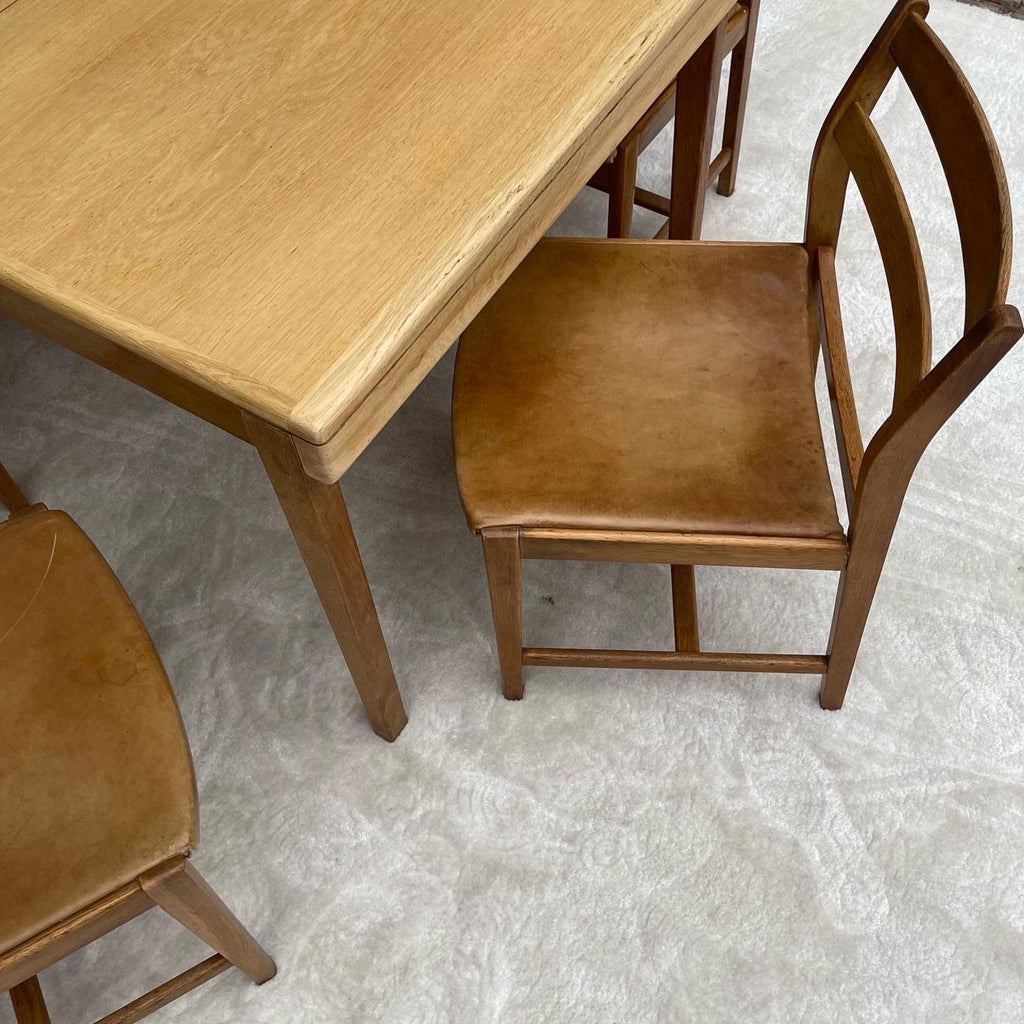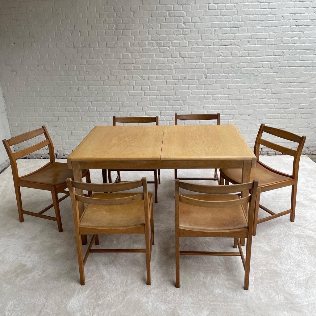 Eric wørts 다이닝 세트 가죽 의자가 있는 6개의 나무 의자가 있는 확장형 오크 테이블. 가죽은 아름다운 파티나를 가지고 있으며 세트는 최상의 상태입니다. 크기 테이블: H73, W85, L130 의자: H76, W45, D46, SH43