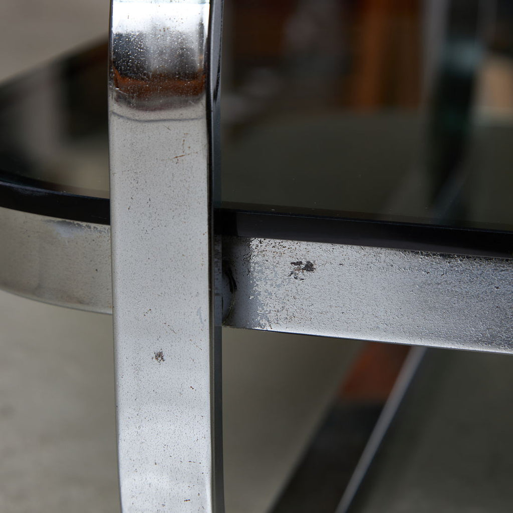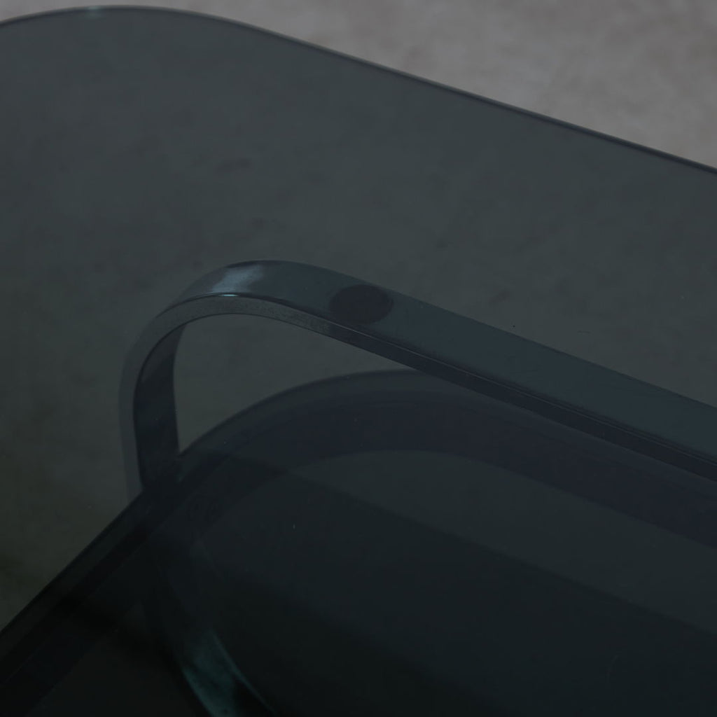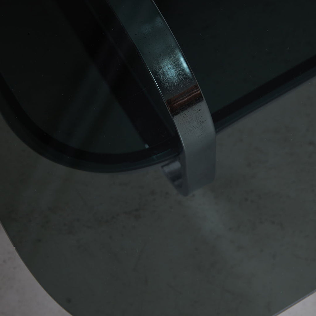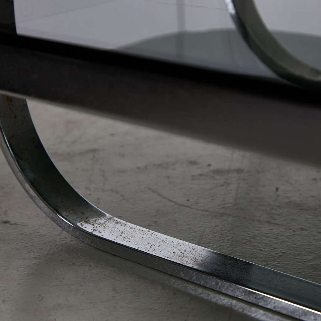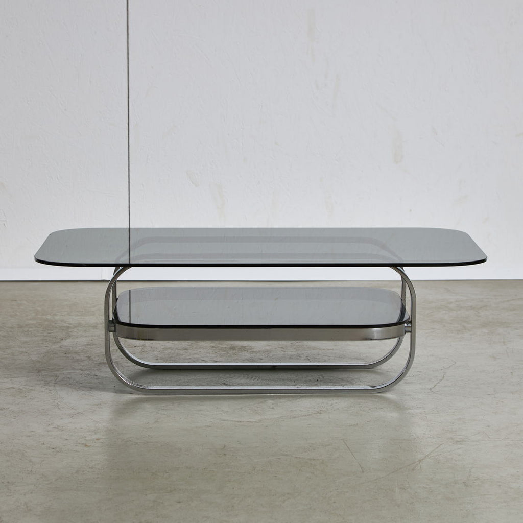 Flat, Rounded Bar-shaped Coffee Table on Chrome Base with Two Smoked Glass Tops