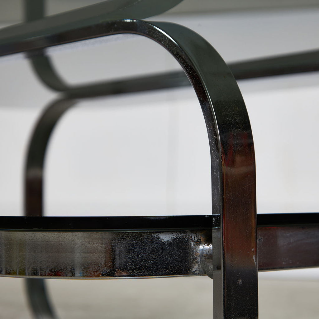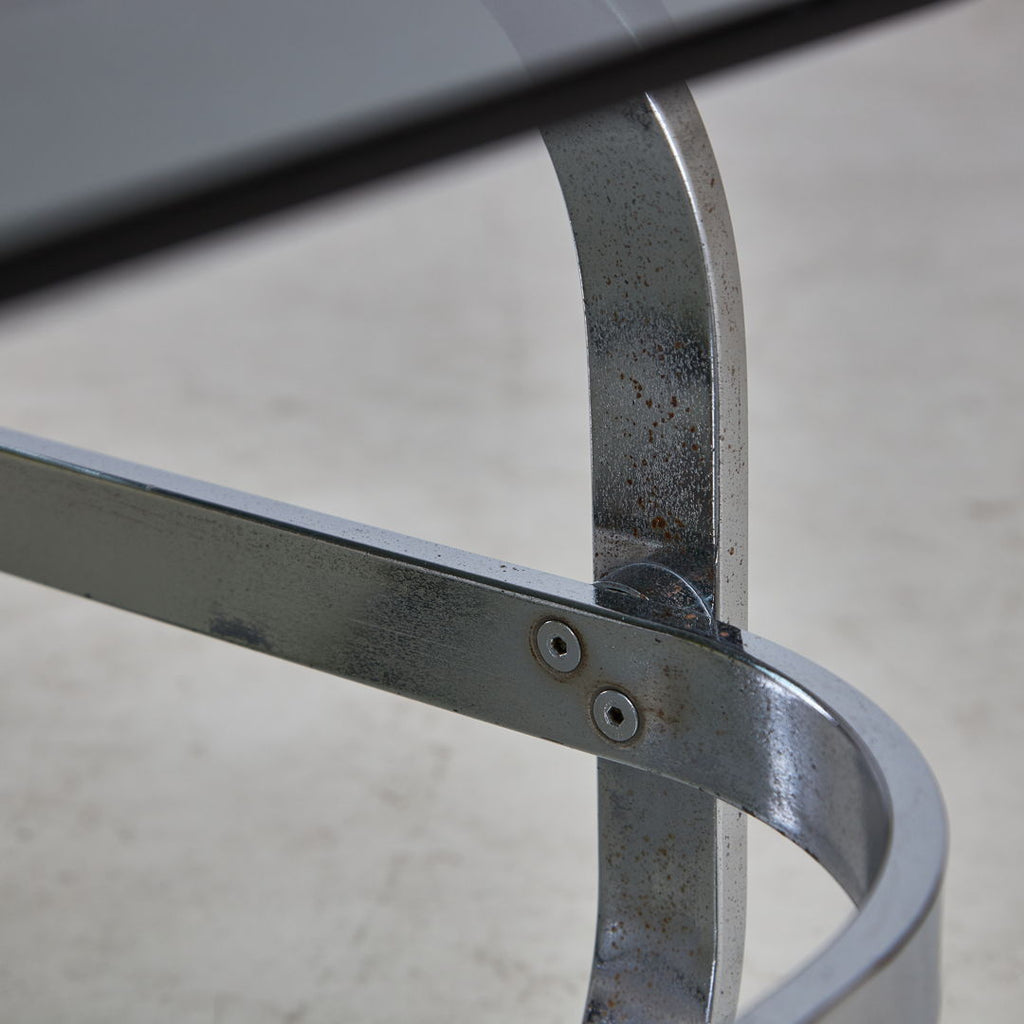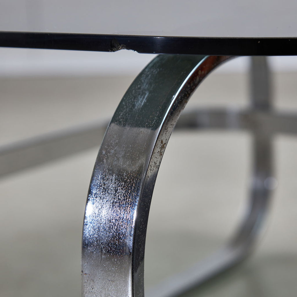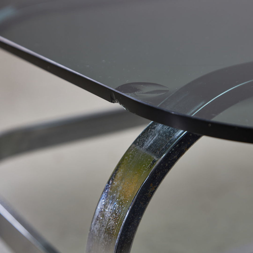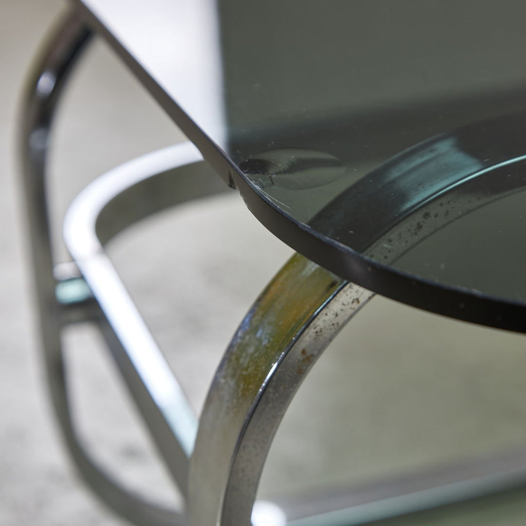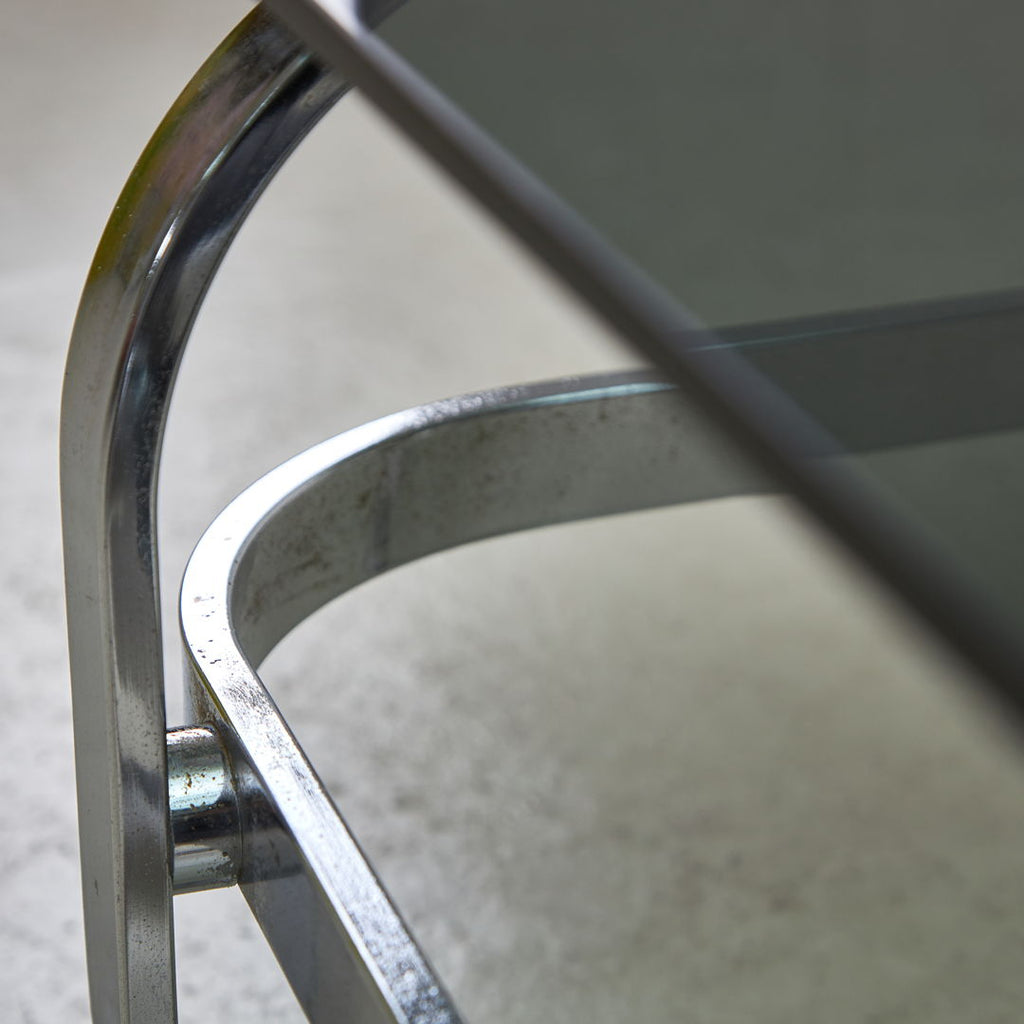 Flat, Rounded Bar-shaped Coffee Table on Chrome Base with Two Smoked Glass Tops