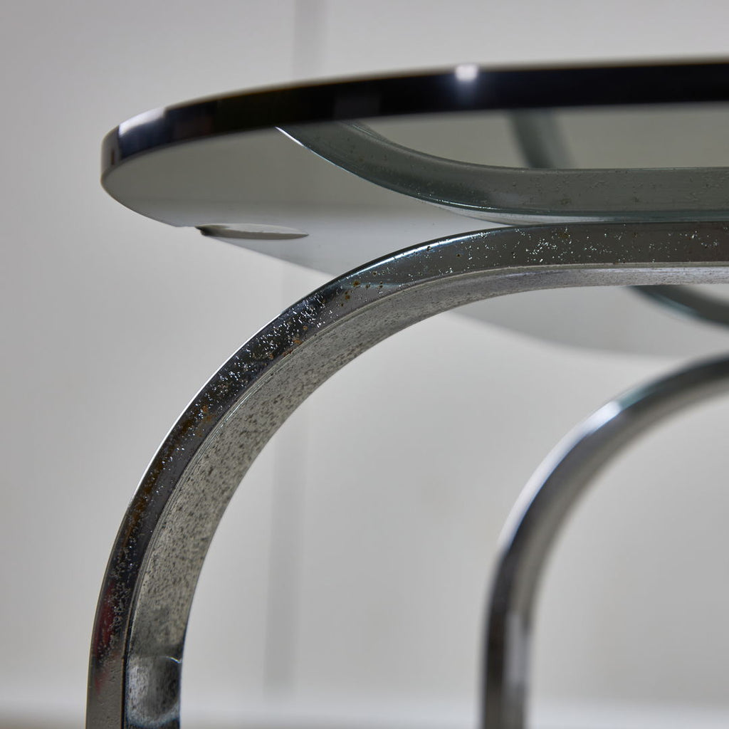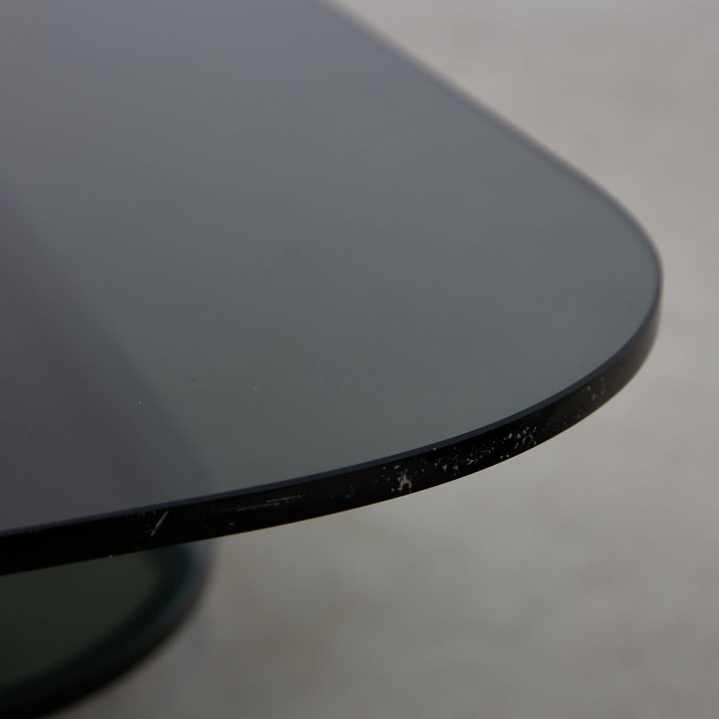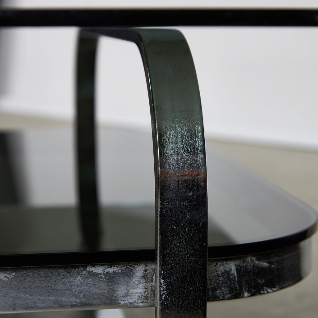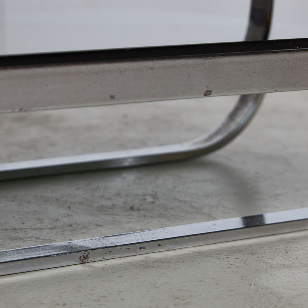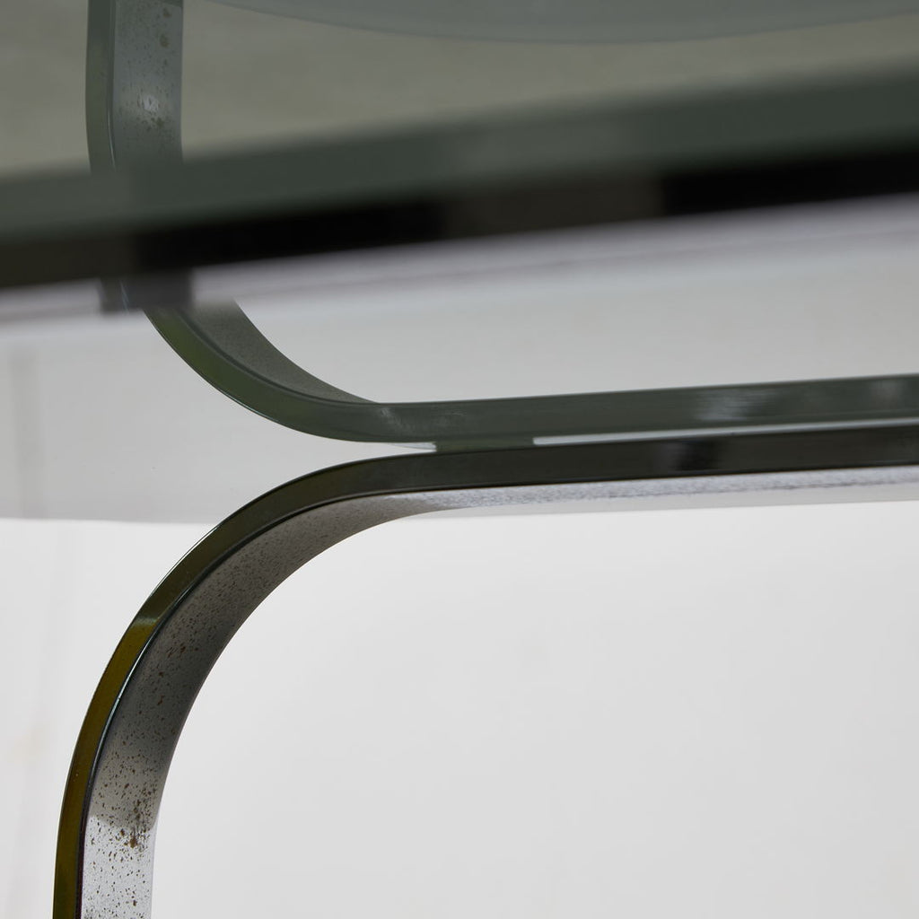 Flat, Rounded Bar-shaped Coffee Table on Chrome Base with Two Smoked Glass Tops