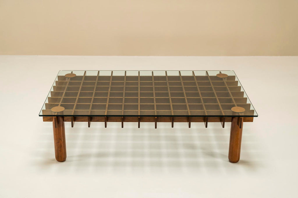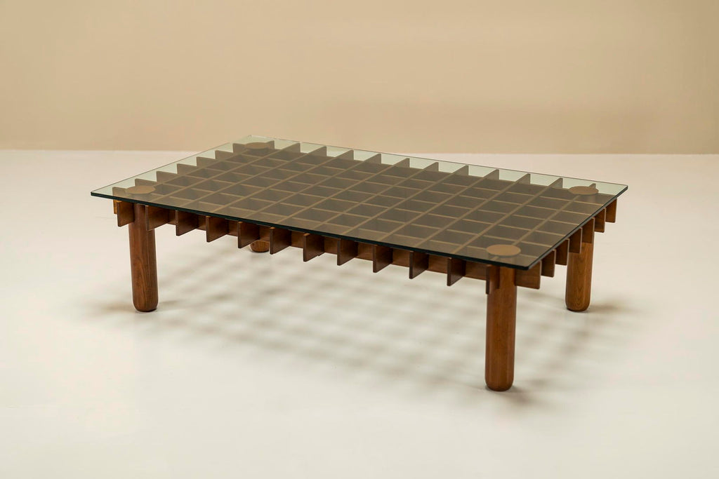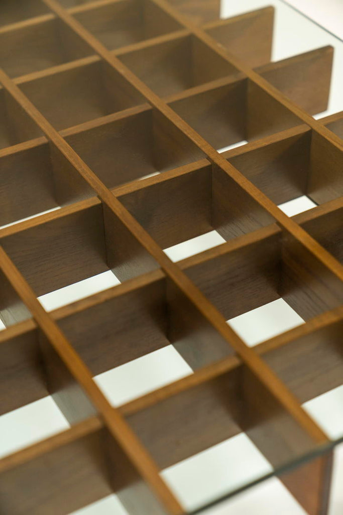 Topping the composition is a sleek glass surface, which delicately balances the leather accents and the wooden grid. The glass allows the beauty of the underlying craftsmanship to shine through, while simultaneously offering a practical platform for showcasing.