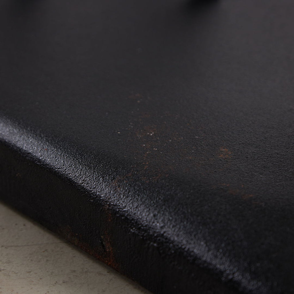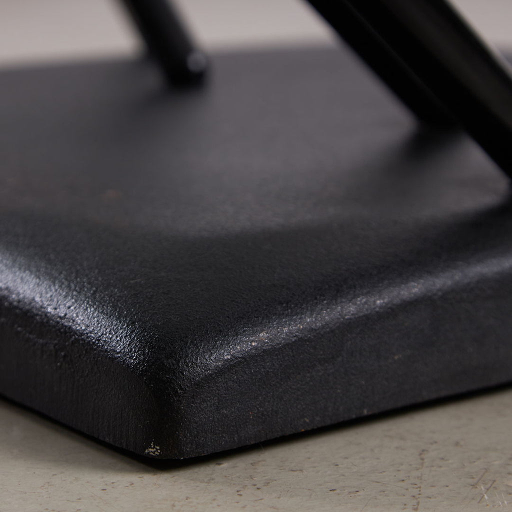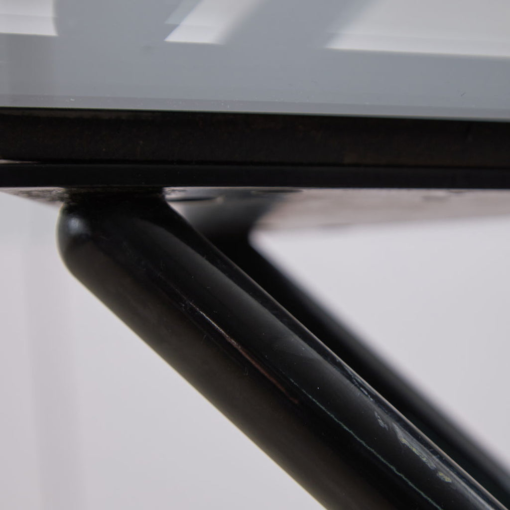 Bellato를 위해 디자인된 1980년대 블랙 메탈 프레임의 이탈리안 포스트모던 묵직한 커피 테이블입니다. 정사각형 베이스에는 삼각형으로 끝나는 두 개의 막대가 유리 시트를 고정합니다. 이 아이템은 베이스에 가벼운 마모가 있는 매우 좋은 빈티지 상태입니다.