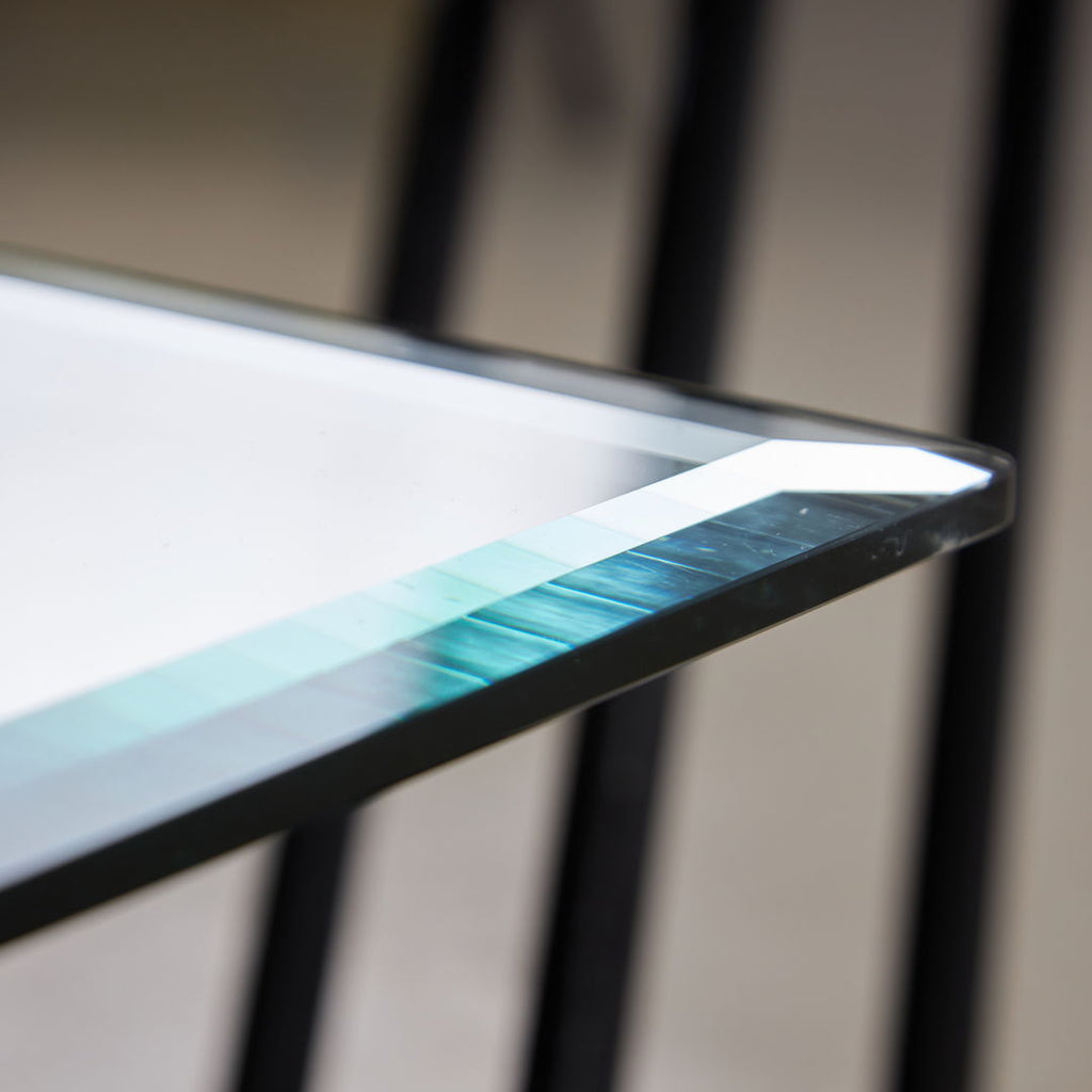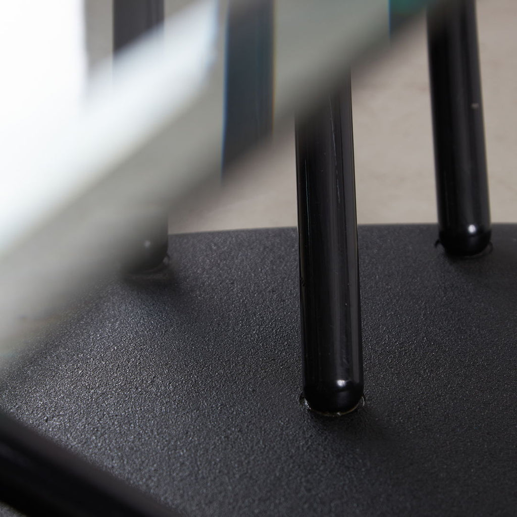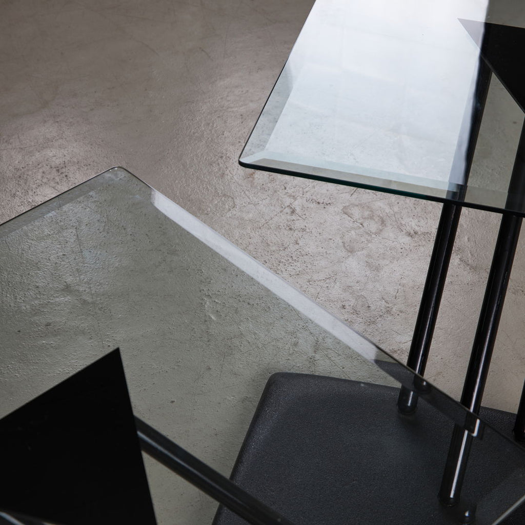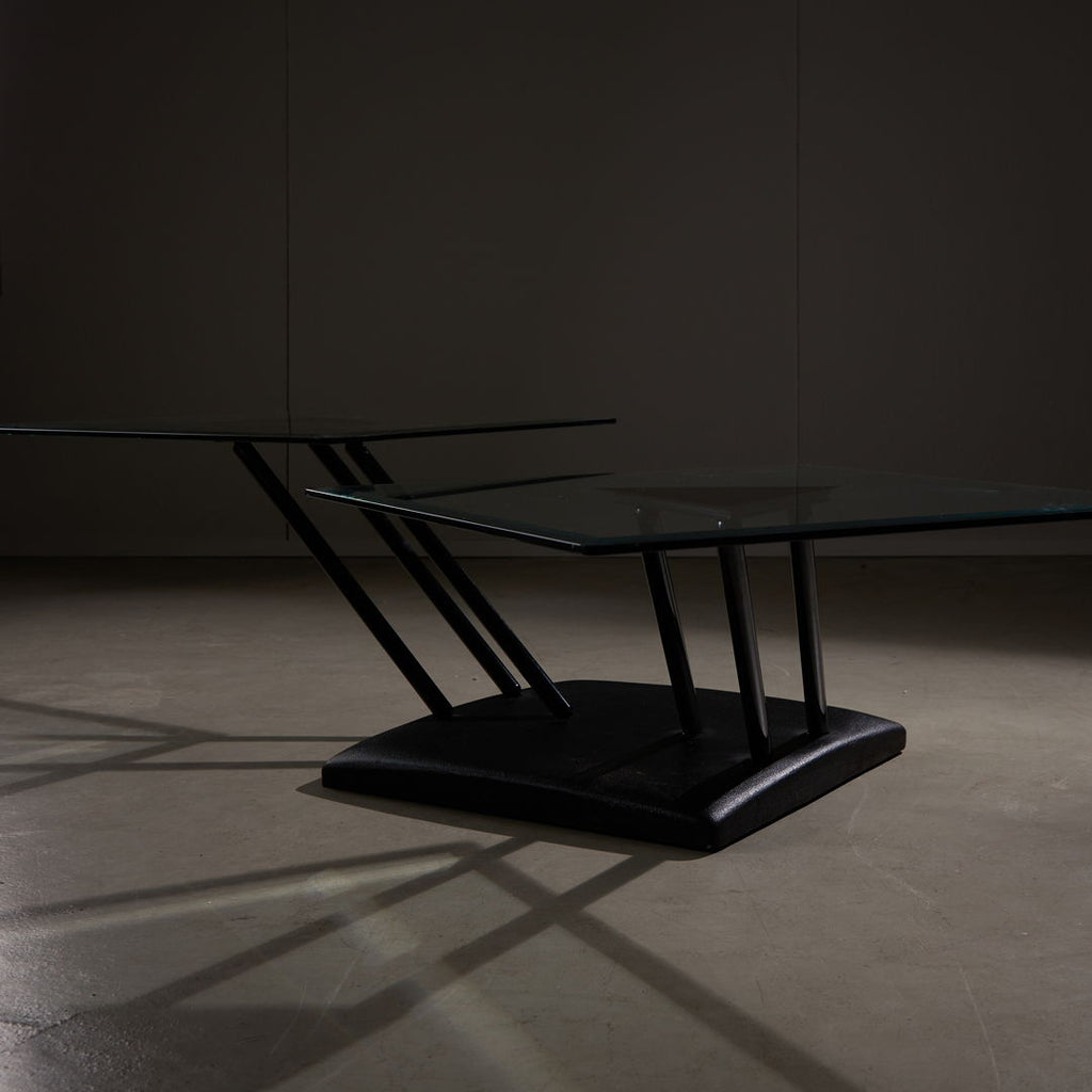 Italian post-modern, heavy coffee table with black metal frame from the 1980s, designed for Bellato. On the square base, two rods ending in triangles hold the glass sheets. This item is in a very nice vintage condition with light wear on the base.