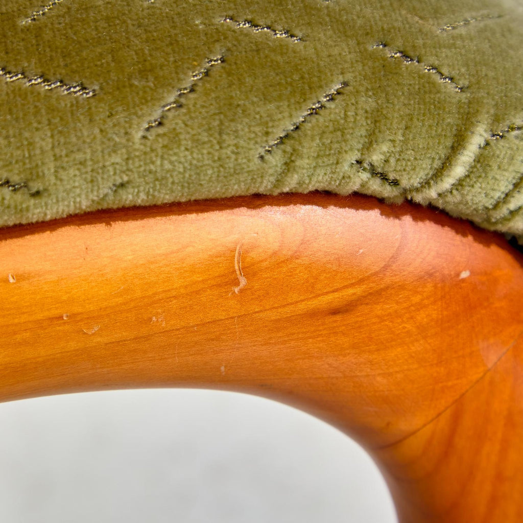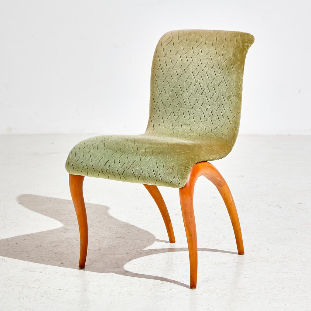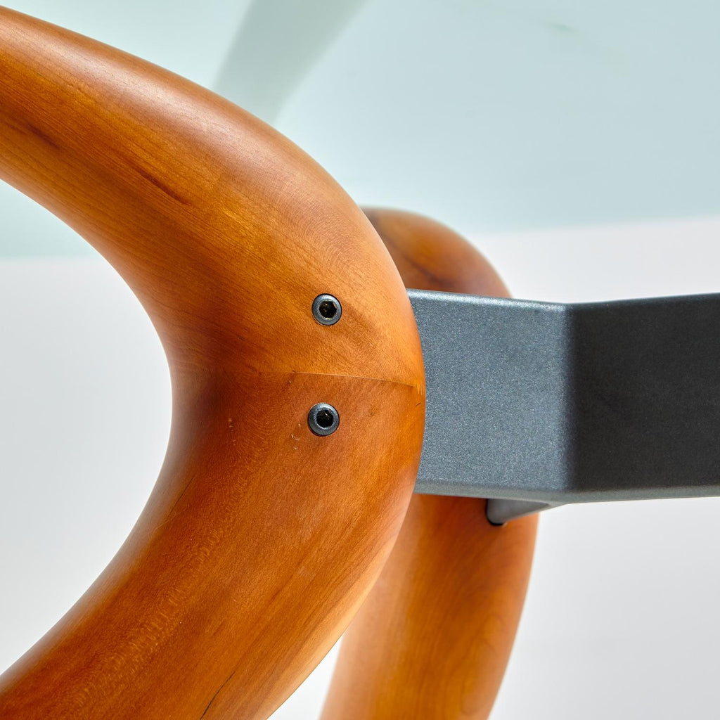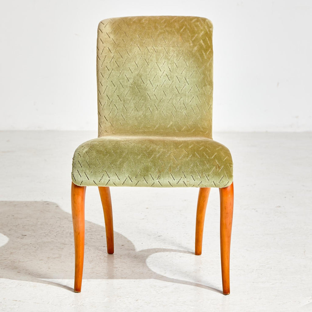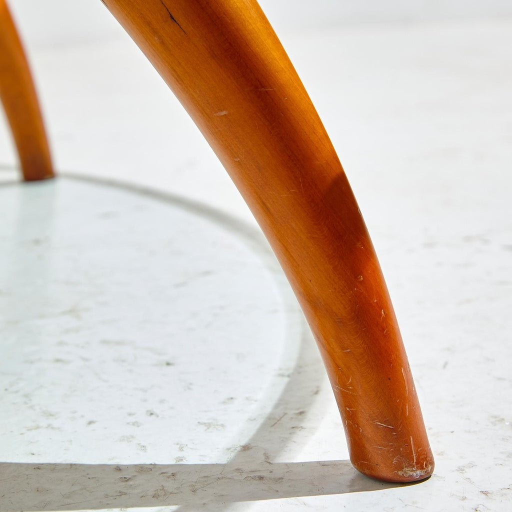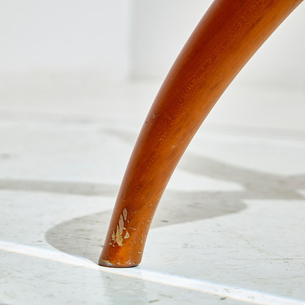 Maurizio Marconato와 Terry Zappa가 Porada를 위해 디자인한 2000년대 곡선형 호두 다리로 만든 이탈리아 '복고풍' 다이닝 세트입니다. 나무와 유리 부분에 약간의 표면 긁힘과 마모가 있고 텍스타일 덮개에 얼룩이 있습니다. 유리 상단에 작은 칩이 있습니다. 크기: 식탁: 205x73x100 cm /// 식탁 의자: 47x82x40 cm, 높이: 50 cm