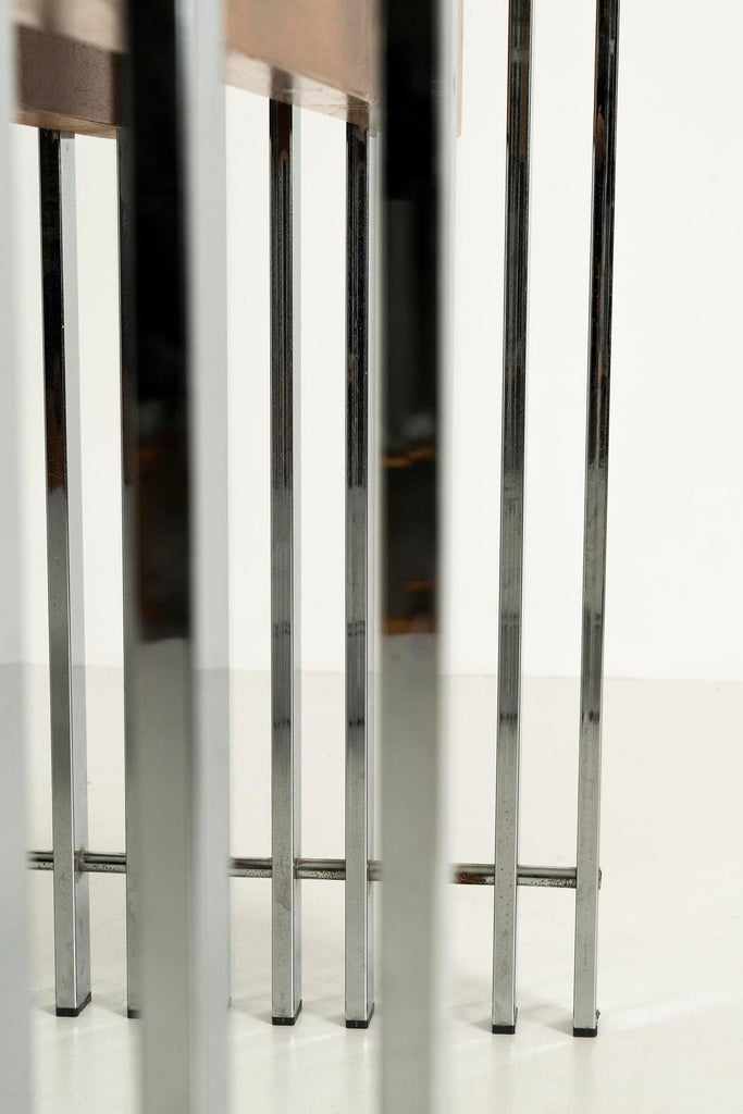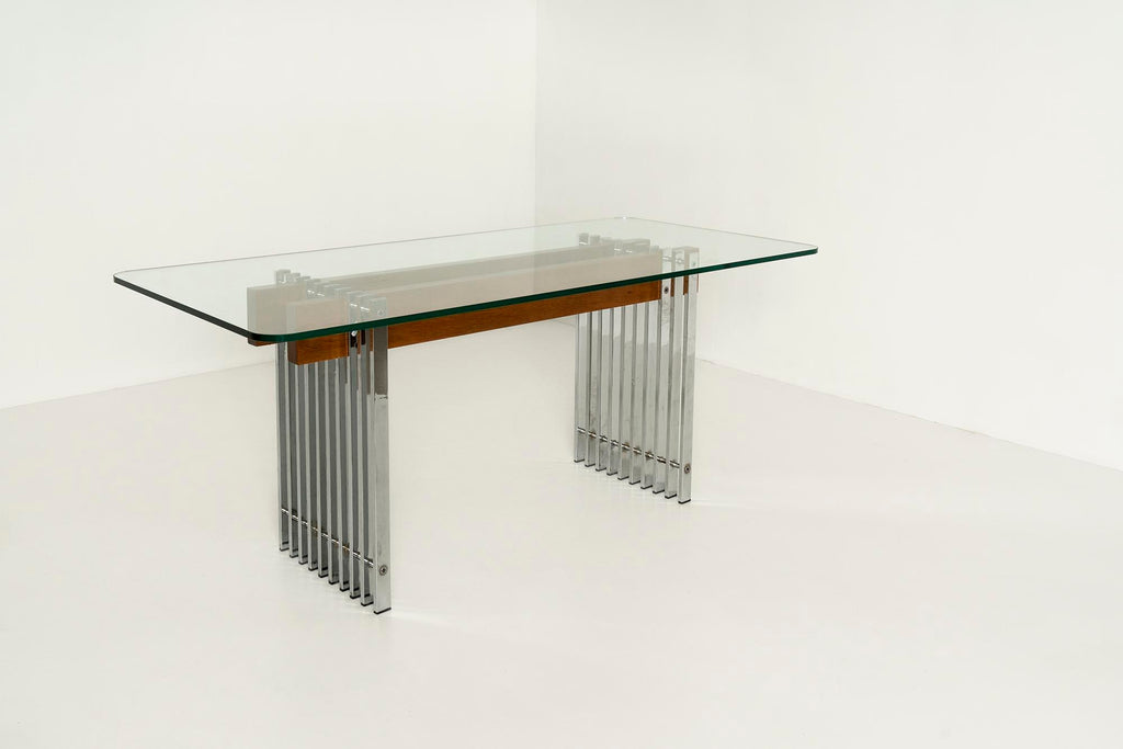 이 아름다운 1970년대 이탈리아 식탁에는 목재, 금속 및 유리 소재가 유쾌한 비율로 결합되어 있습니다. 테이블의 금속 다리는 10개의 연결된 막대 구조로 구성되어 있습니다. 가운데에는 균형 잡힌 두 개의 티크 목재 들보가 있는데, 이 들보가 막대 구조로 지지되고 있습니다. 그 위에는 이 테이블의 형태 언어에서 나무 기둥과 금속 다리의 직선에 대한 좋은 대답을 제공하는 멋지게 둥근 유리 상판이 놓여 있습니다. 솔직한 성격으로 이 테이블은 다양한 인테리어 스타일의 자산이 될 것입니다. 이 테이블을 만들 때 그들은 비율뿐만 아니라 외관도 고려했습니다. 강한 재료는 기교를 느끼게 합니다. 상태 매우 양호하며 세월의 흔적과 사용감이 일치합니다. 프레임에 작은 흠집과 얼룩이 보이지만 인상적인 식탁의 외관에는 영향을 미치지 않습니다.