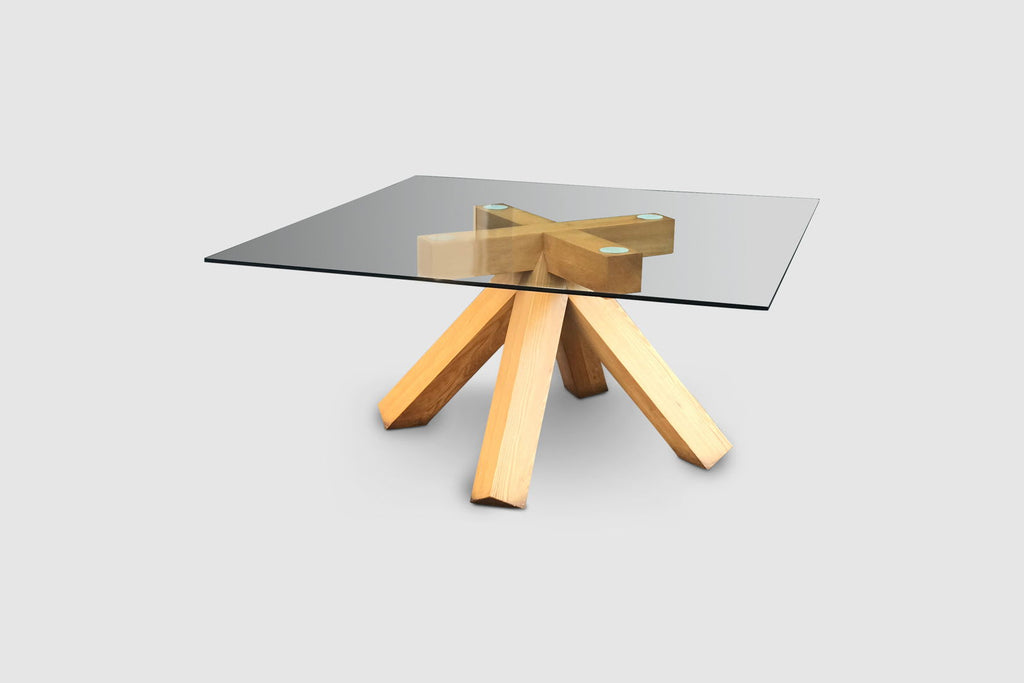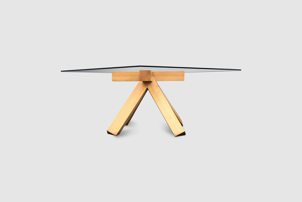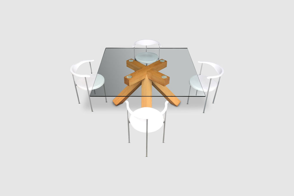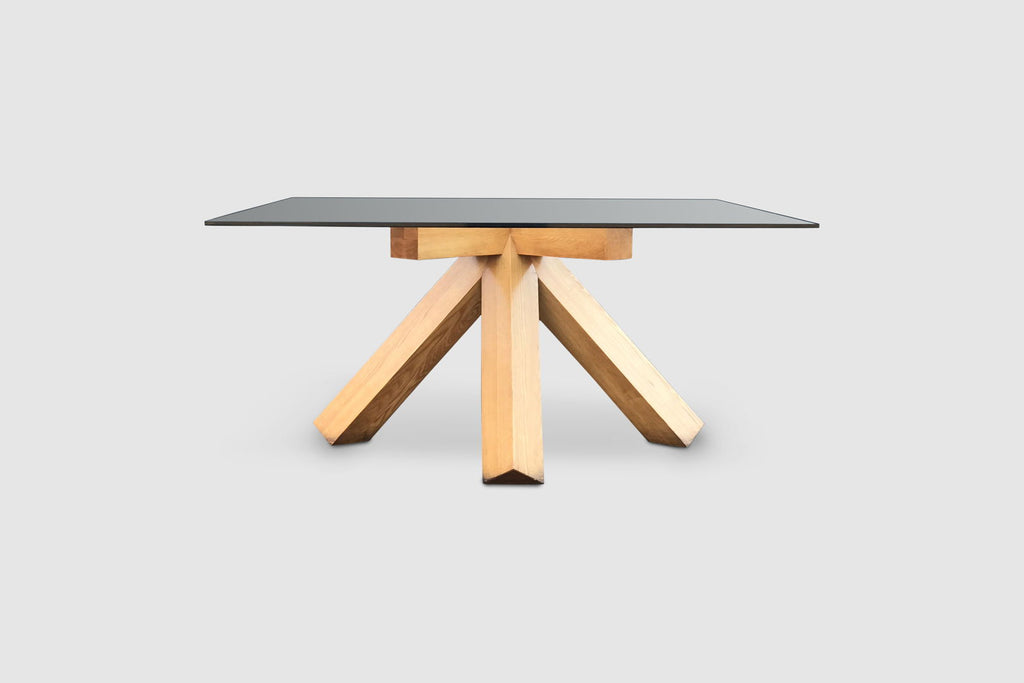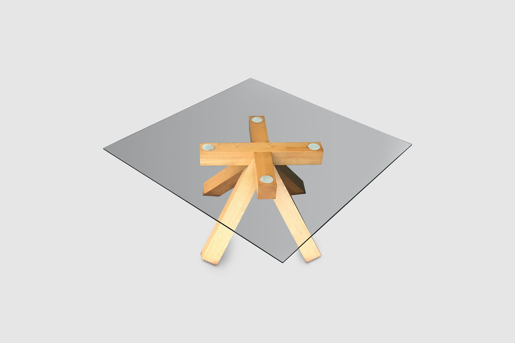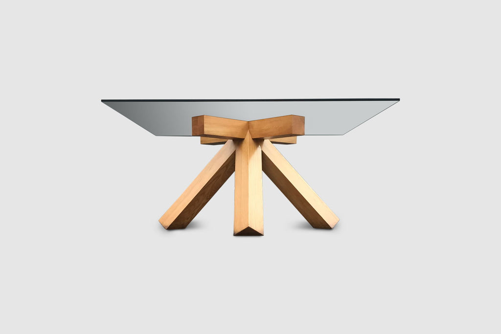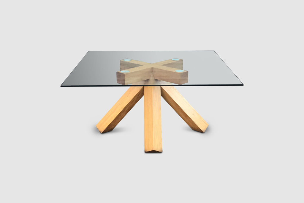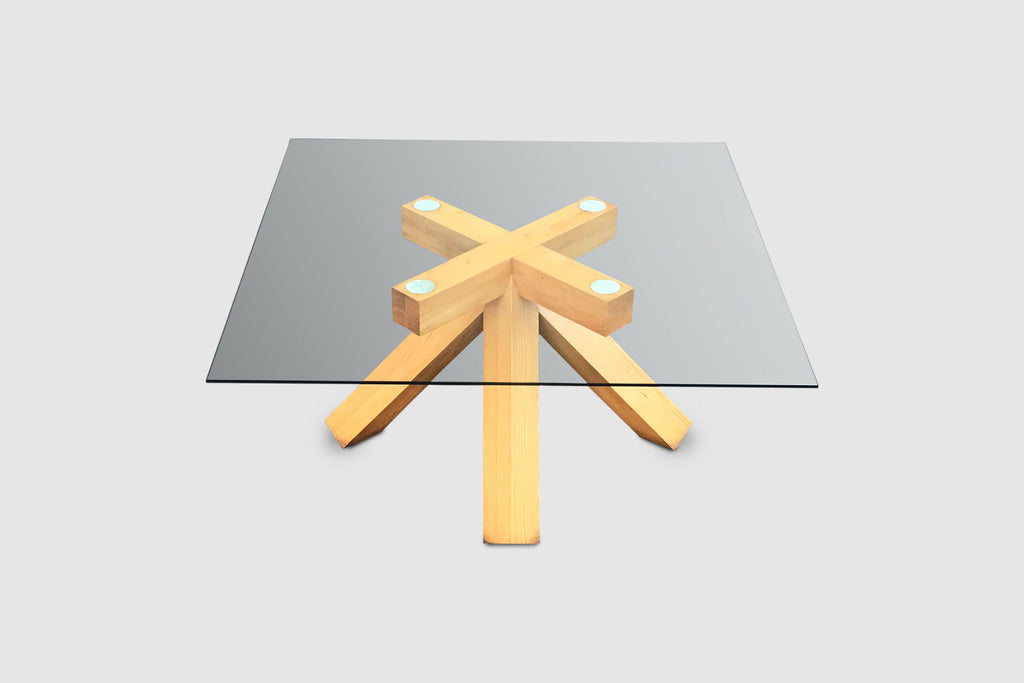 The table features an impressive solid bare walnut wood 4 legged cross foot that evolves into four large crossed patterned arms supporting the glass plate. Although the foot has a relatively simple geometry, the result is impressive. The table has a strong stance and due to the simple geometry and thick legs certainly has a brutalist feeling to it. Provided sufficient space in the right environment, this table will be an absolute highlight. The top glass plate consists of layered glass and measures 165 cm diameter, providing room for at least 10 persons.