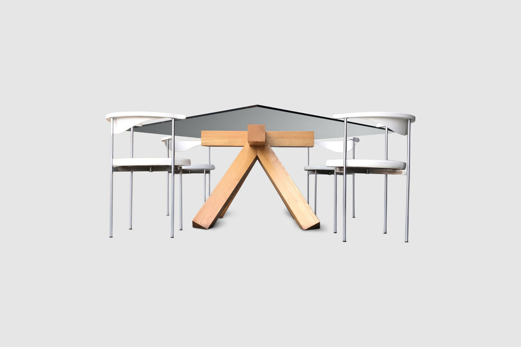 Mario Bellini가 Cassina를 위해 만든 극히 드문 디자인입니다. La Corte 식탁은 매우 한정된 수량으로만 생산되었습니다. 유명한 전시회 'Italy: The New Domestic Landscape' 이후 Bellini는 가구 디자인의 절대적인 기본으로 돌아가는 여정을 시작했습니다. 이 테이블은 이 여정의 결과입니다. 이 테이블은 1976년 이탈리아에서만 판매되었습니다. 벨리니 손의 다른 식탁과 달리 이 식탁은 더 이상 생산되지 않습니다. 따라서 독점성이 보호됩니다. 이 테이블은 유리판을 지지하는 4개의 큰 교차 패턴 암으로 진화하는 인상적인 단단한 맨 호두나무 4개의 다리가 있는 크로스 풋을 특징으로 합니다. 발의 형상은 비교적 단순하지만 결과는 인상적입니다. 테이블은 강한 자세를 가지고 있으며 단순한 기하학과 두꺼운 다리로 인해 확실히 잔인한 느낌을 줍니다. 올바른 환경에 충분한 공간이 제공되면 이 테이블이 절대적인 하이라이트가 될 것입니다. 상단 유리판은 적층 유리로 구성되어 있으며 직경은 165cm로 최소 10명을 수용할 수 있습니다. 테이블의 진위를 인증하는 출처가 제공됩니다. 문학: Morteo, Enrico. 마리오 벨리니. 가구, 기계 및 물건. 런던: Phaidon, 2008, p. 176. 탁자는 최상의 상태입니다.