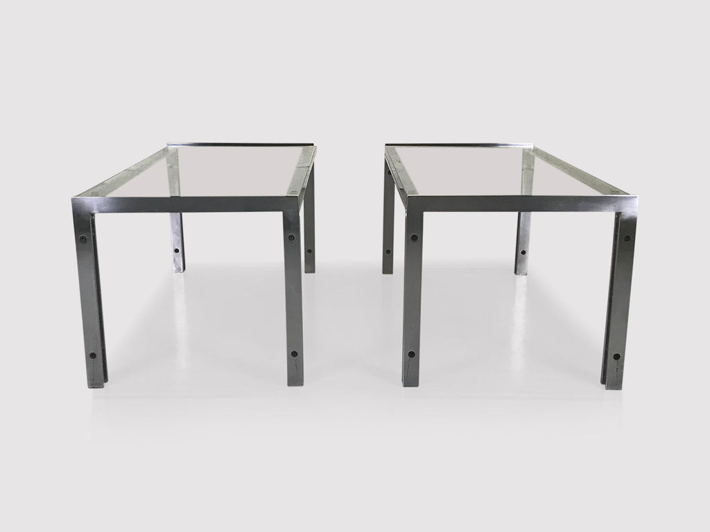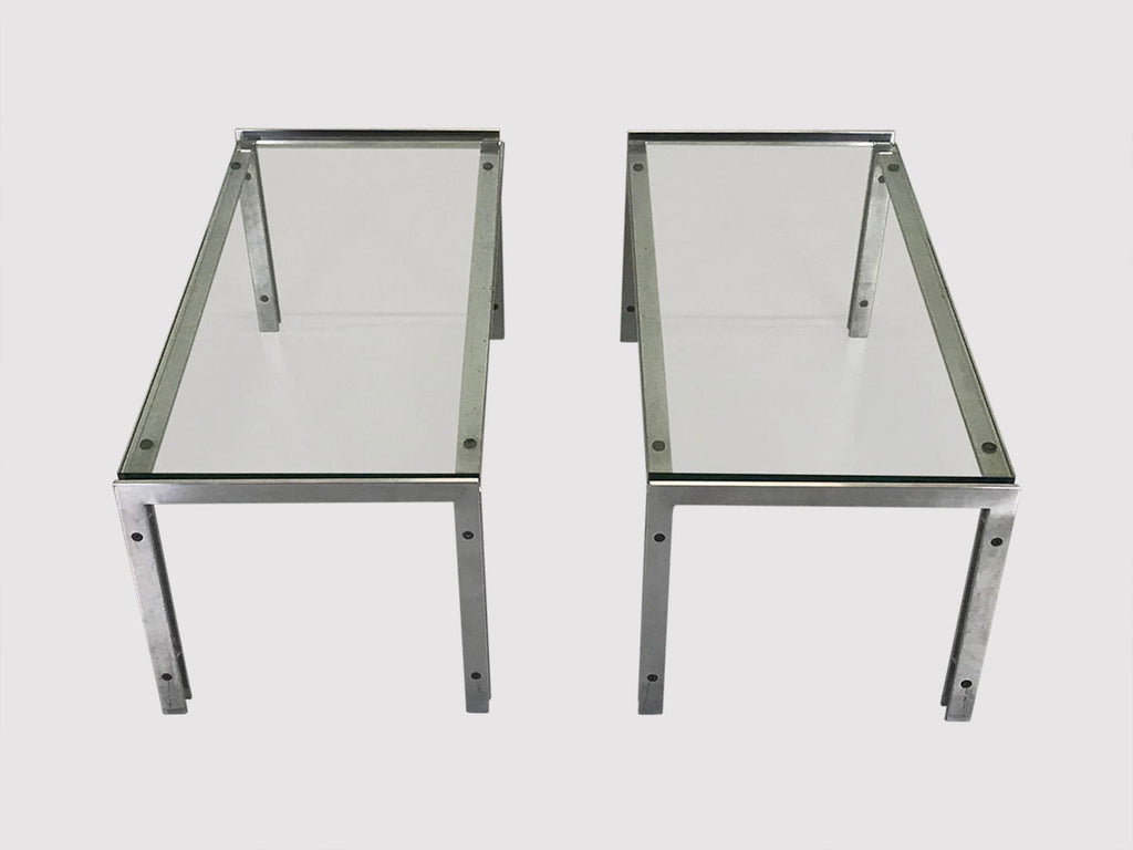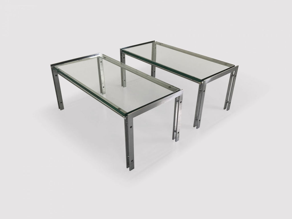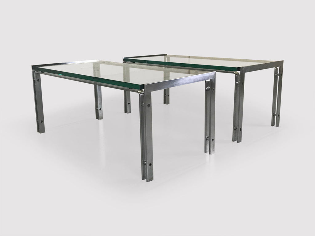 네덜란드 가구 브랜드 Metaform을 위한 Hank Kwint의 현대적인 디자인. 강철 슬레이트와 검은색으로 노출된 볼트 사이에 열린 공간이 있는 놀라운 기하학의 스테인리스 스틸 프레임. 두껍게 겹겹이 쌓인 유리판이 프레임 안에 놓여 있습니다. 그 결과 Poul Kjaerholm 및 Jorgen Kastholm의 스칸디나비아 모던 디자인과 유사한 현대적인 미니멀리스트 룩이 탄생했습니다. 이 특정 테이블 세트는 맞춤형 측정으로 제공되었습니다. 86 x 40cm 크기로 보조 테이블로 사용하거나 커피 테이블로 함께 사용할 수 있습니다. 테이블은 프레임에 약간의 마모가 있고 유리에 약간의 작은 칩이 있는 매우 좋은 빈티지 상태입니다.