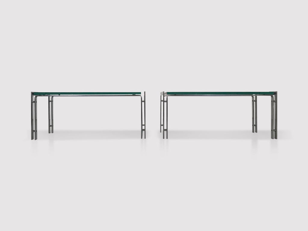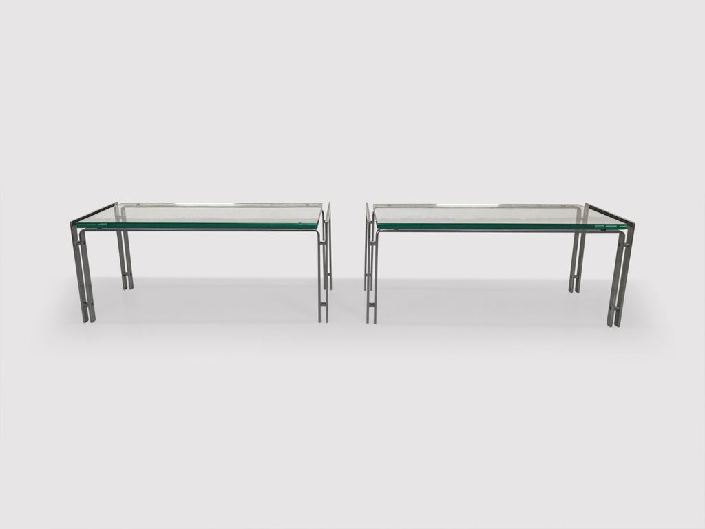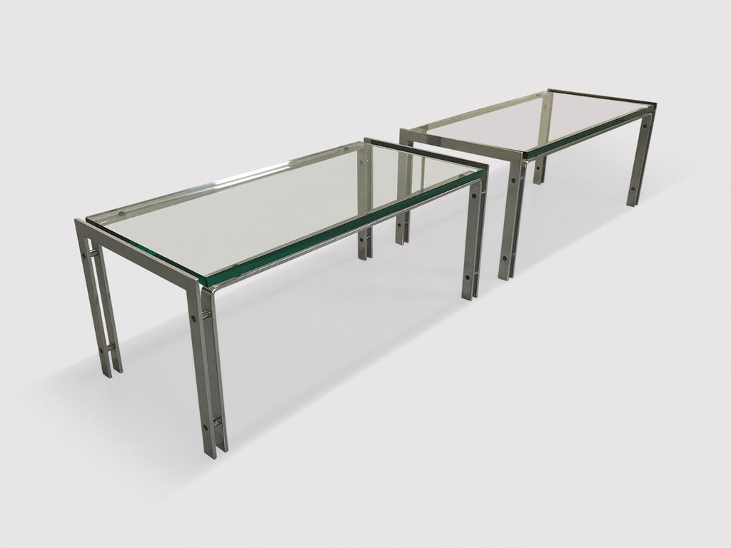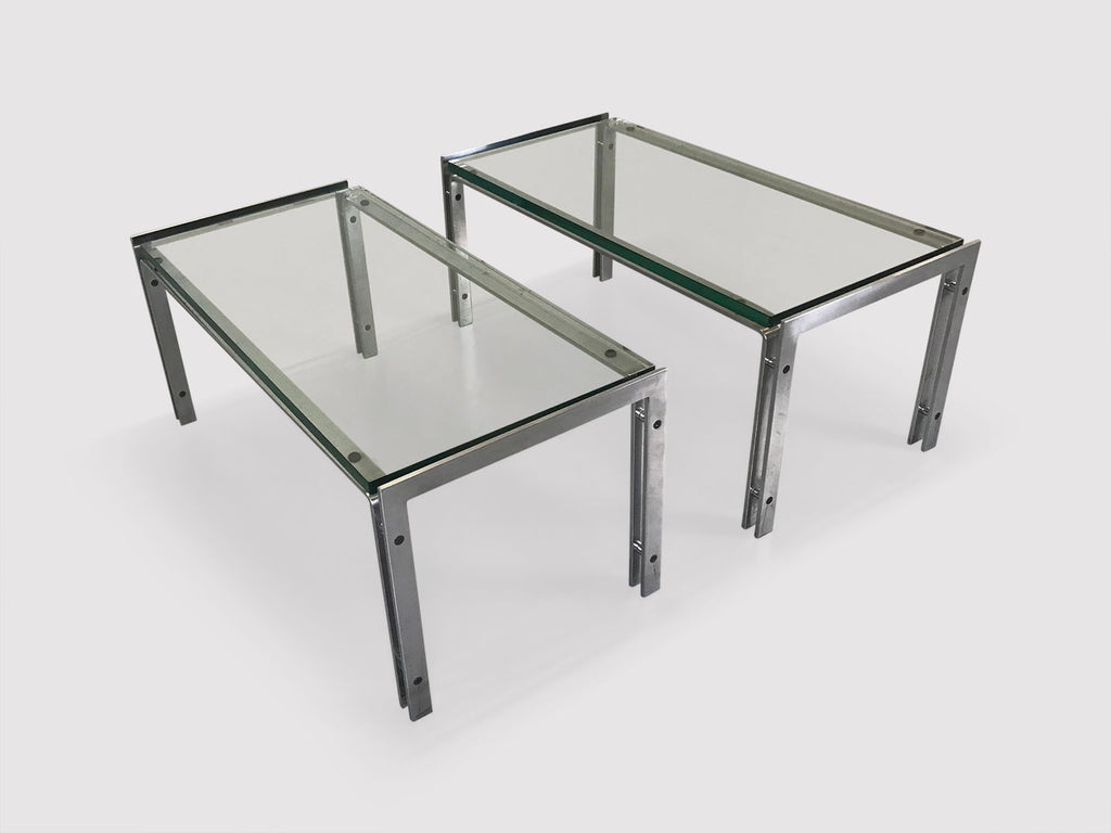 네덜란드 가구 브랜드 Metaform을 위한 Hank Kwint의 현대적인 디자인. 강철 슬레이트와 검은색으로 노출된 볼트 사이에 열린 공간이 있는 놀라운 기하학의 스테인리스 스틸 프레임. 두껍게 겹겹이 쌓인 유리판이 프레임 안에 놓여 있습니다. 그 결과 Poul Kjaerholm 및 Jorgen Kastholm의 스칸디나비아 모던 디자인과 유사한 현대적인 미니멀리스트 룩이 탄생했습니다. 이 특정 테이블 세트는 맞춤형 측정으로 제공되었습니다. 86 x 40cm 크기로 보조 테이블로 사용하거나 커피 테이블로 함께 사용할 수 있습니다. 테이블은 프레임에 약간의 마모가 있고 유리에 약간의 작은 칩이 있는 매우 좋은 빈티지 상태입니다.