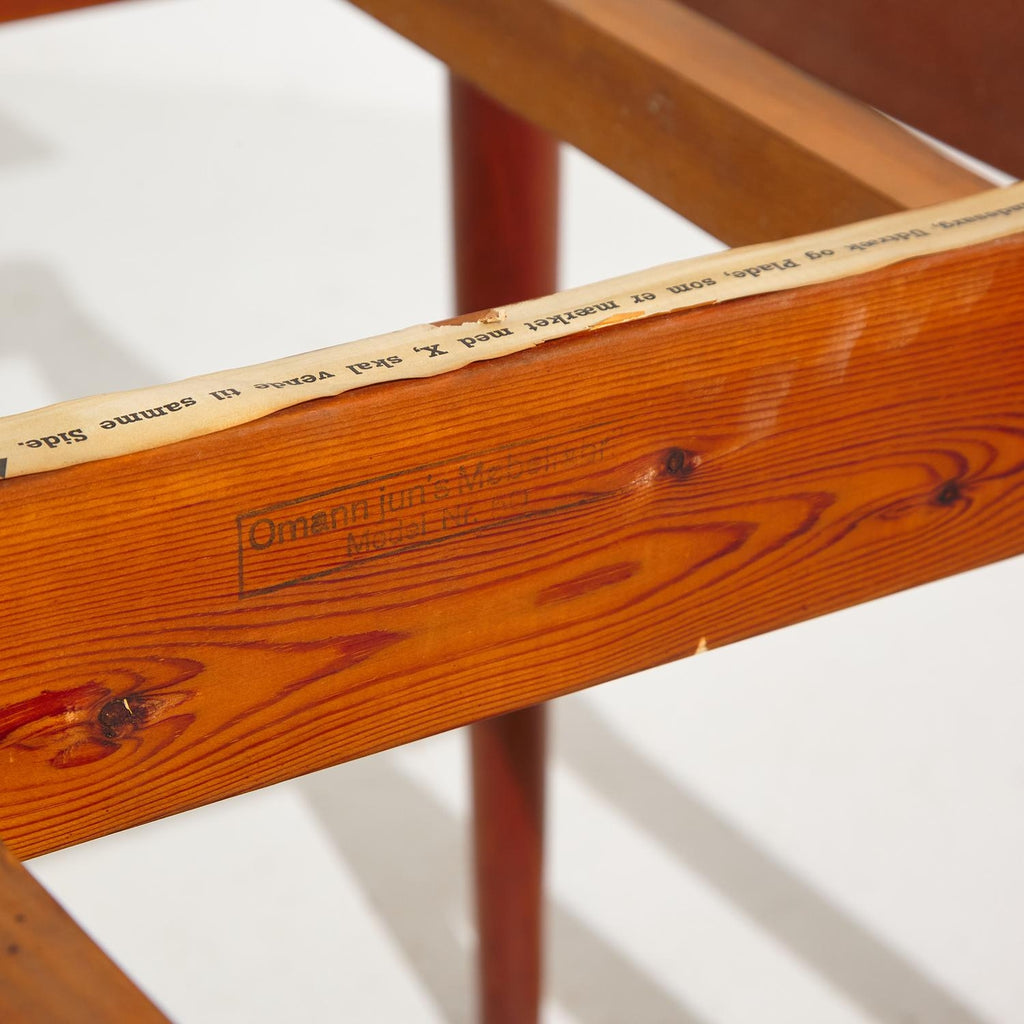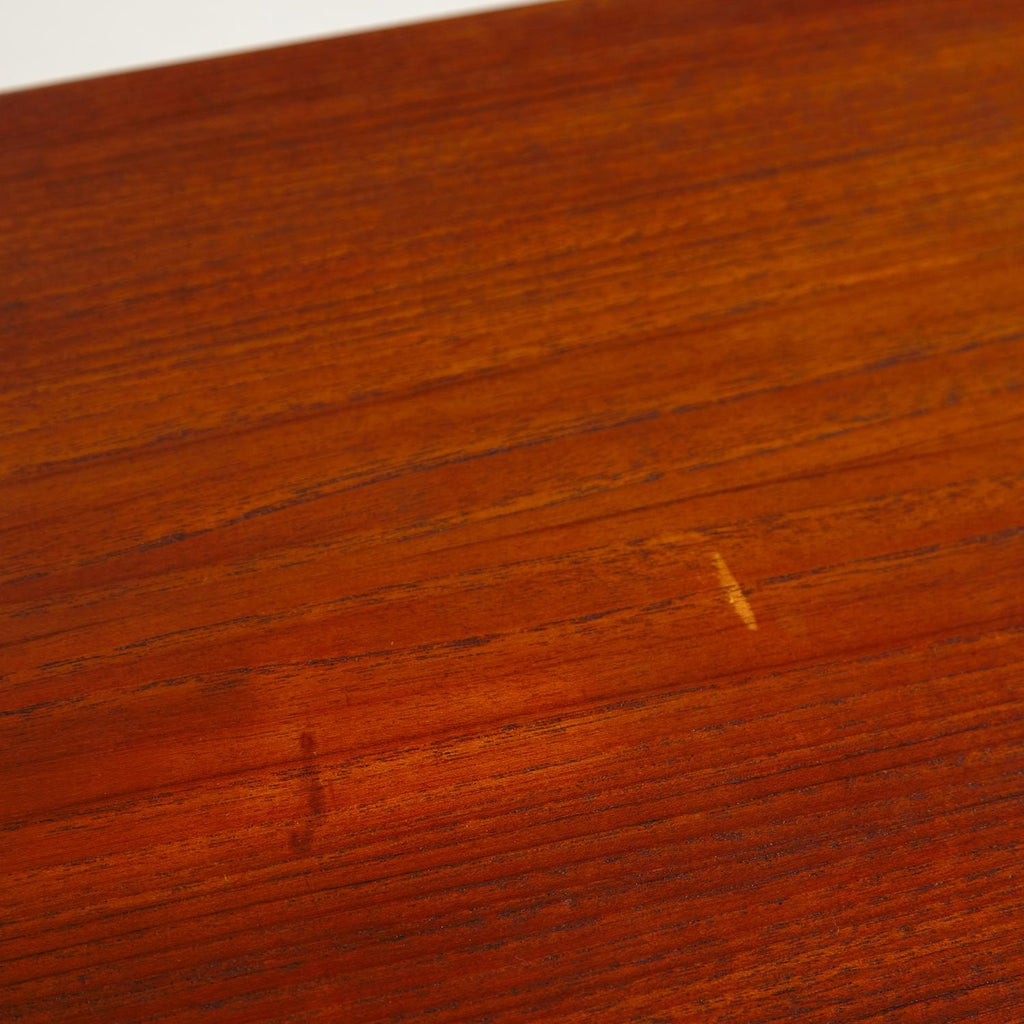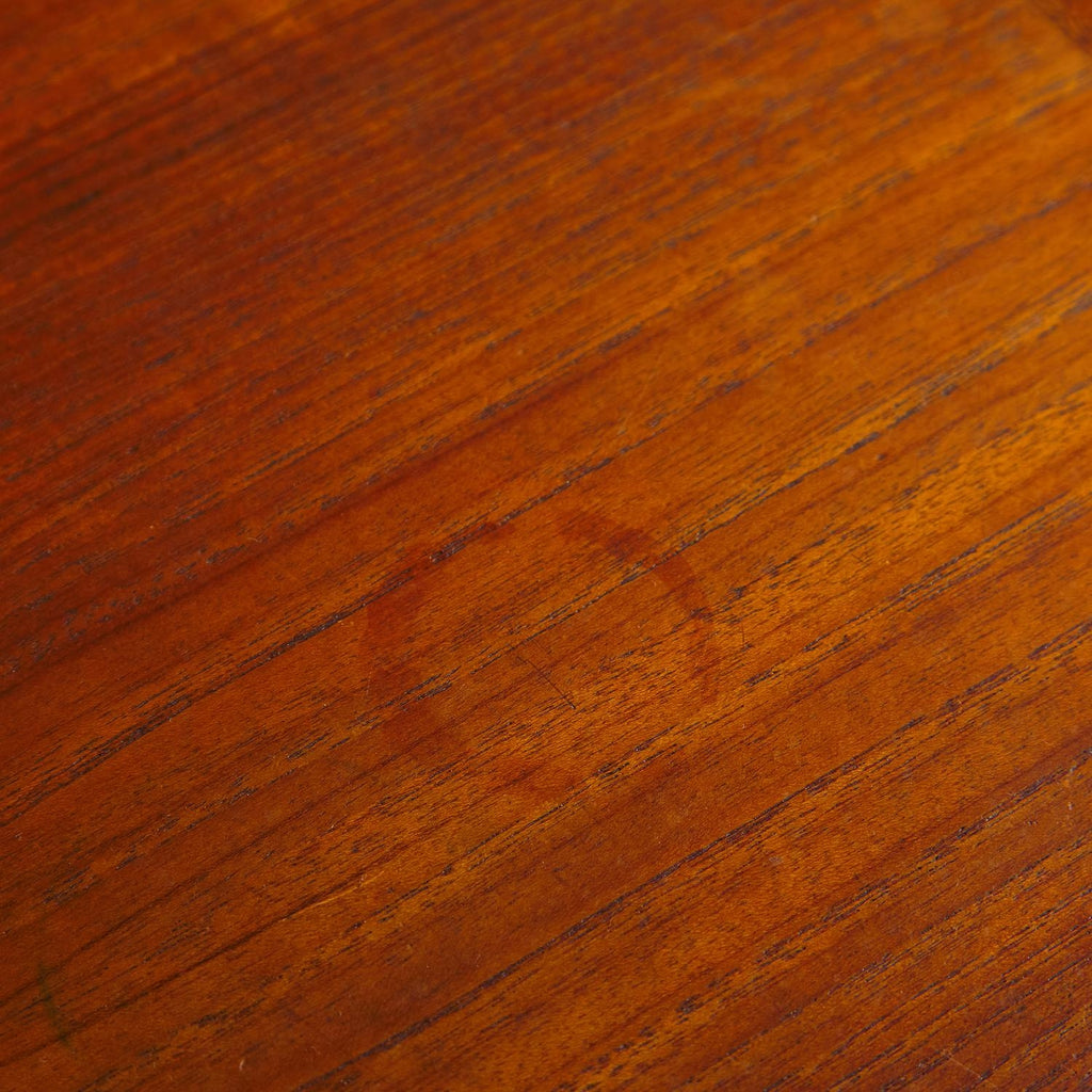 Gunni Omann이 Omann Jun을 위해 디자인한 2개의 확장 부품이 있는 1950년대의 독특한 모양의 '모델 50' 티크 식탁. 빈티지 상태의 나무 부품에 몇 가지 마모, 얼룩 및 긁힘이 있으며 약간의 사용 흔적이 있습니다.