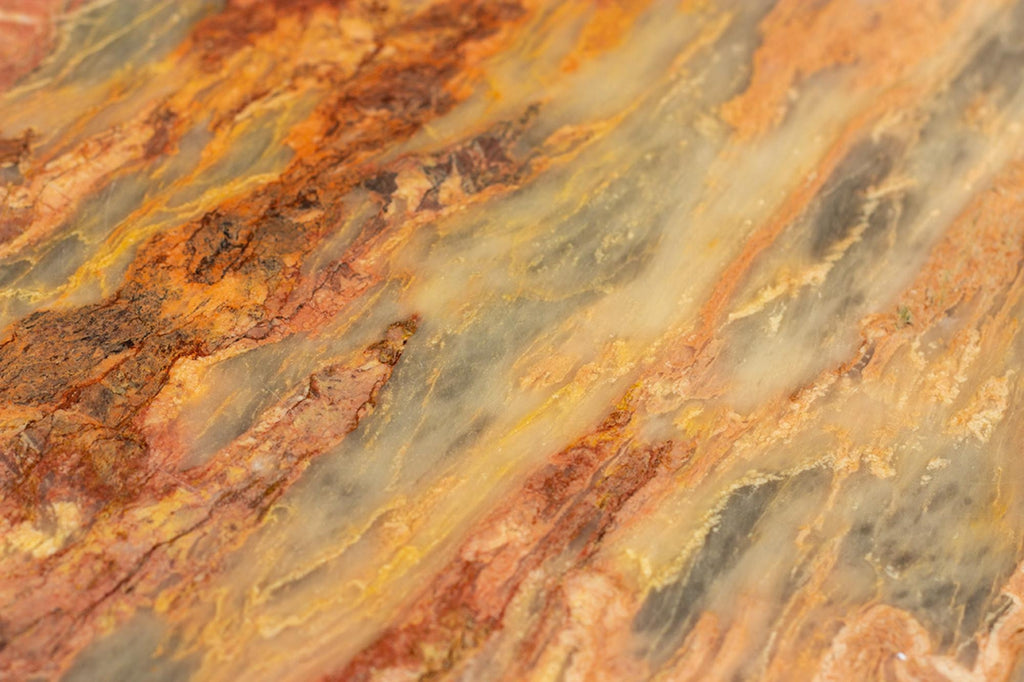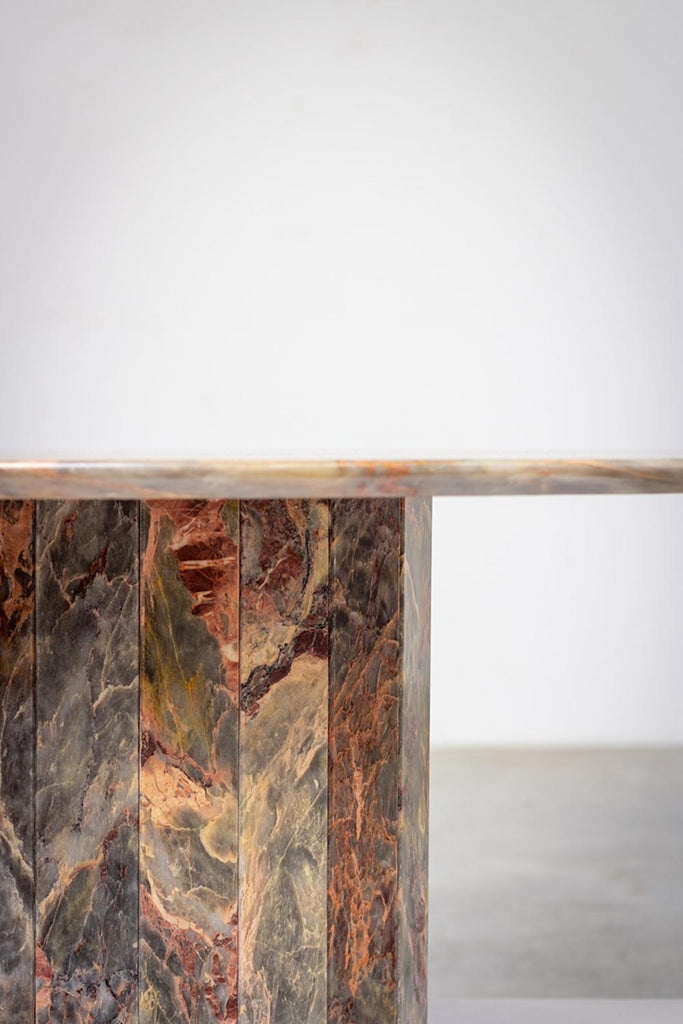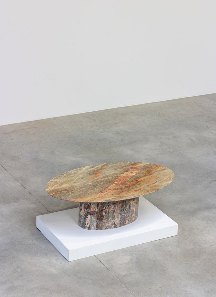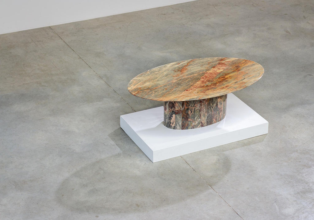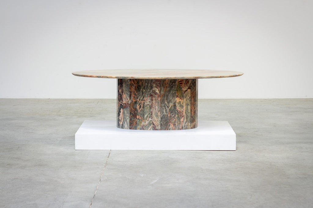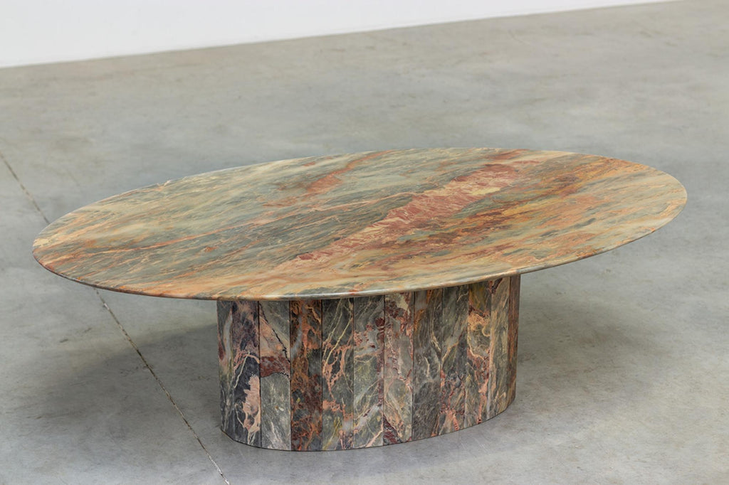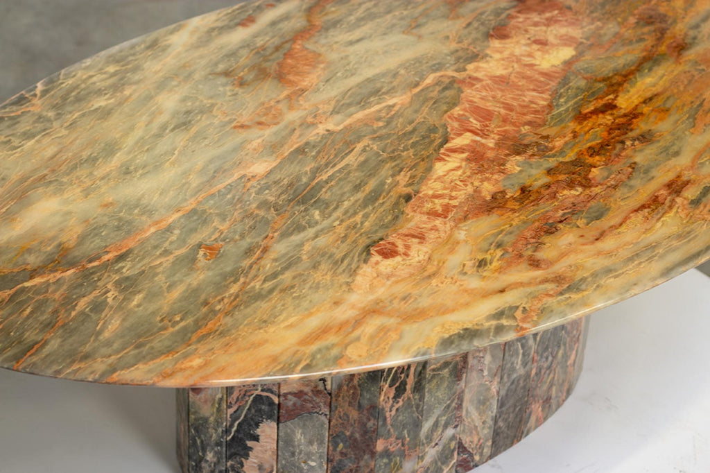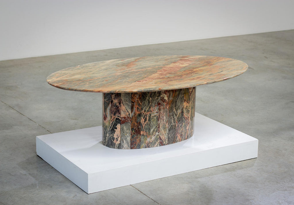 1970년경 제작된 커피 테이블 또는 낮은 테이블. 이 테이블에는 거대한 건축학적 타원형 오닉스 받침대와 타원형 오닉스 테이블 상판이 있습니다. 미학은 건축 양식에 대한 참조를 포함하는 포스트모던 디자인의 전형입니다. 커피 테이블은 현대적인 거실에 매우 잘 어우러 집니다.