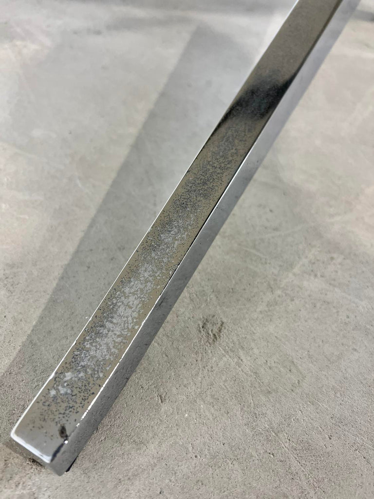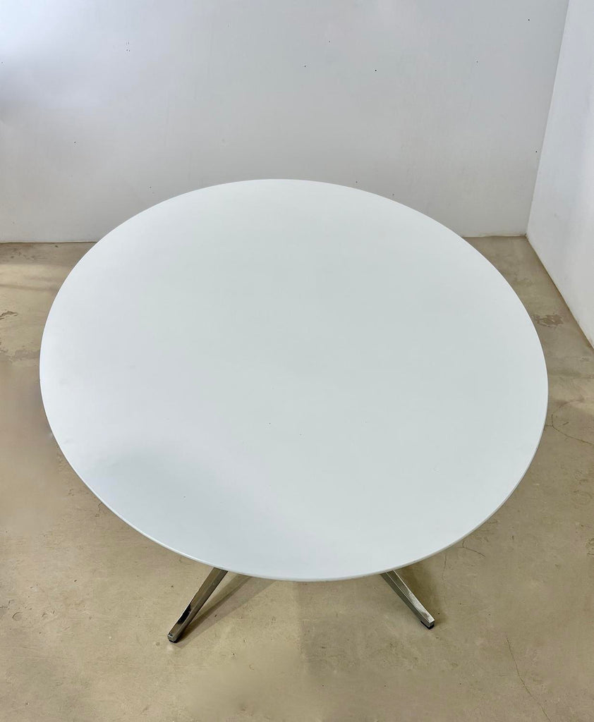 나무 테이블, 흰색, 크롬 도금된 금속 다리.