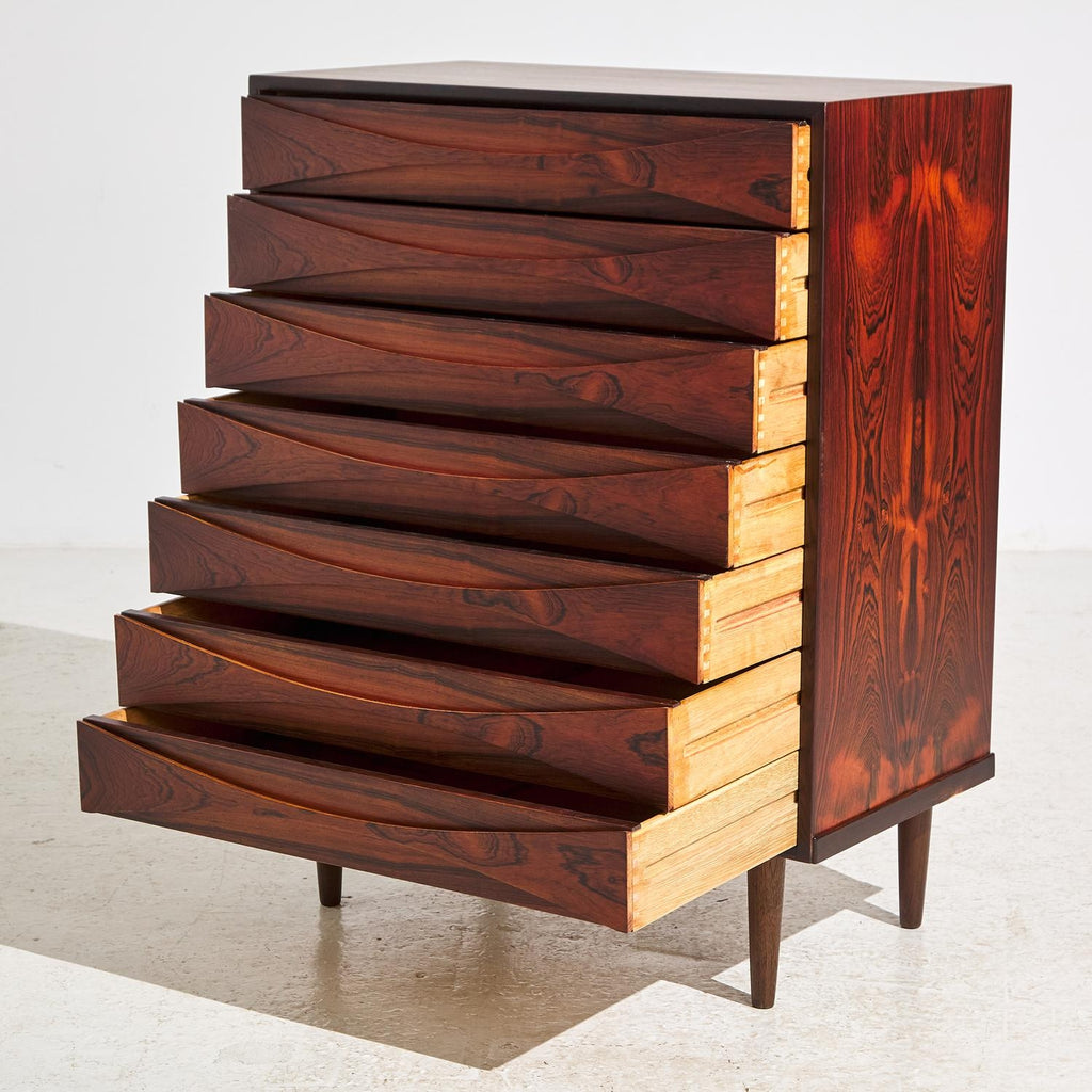 Arne Vodder가 NC Møbler를 위해 디자인한 1950년대의 7단 서랍과 독특한 손잡이가 있는 덴마크 로즈우드 드레서입니다. 옷장의 나무 부분이 완전히 복원되었습니다.