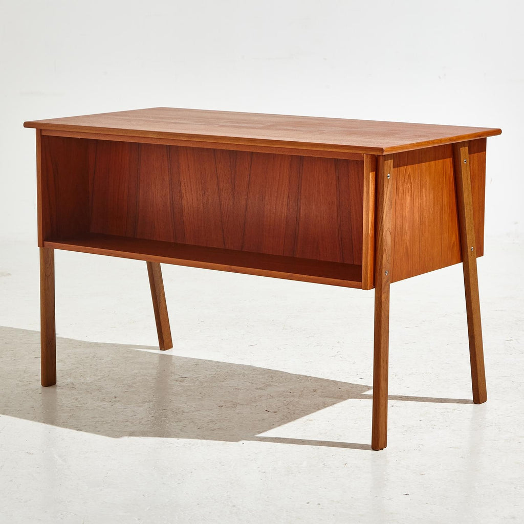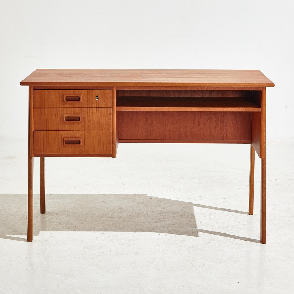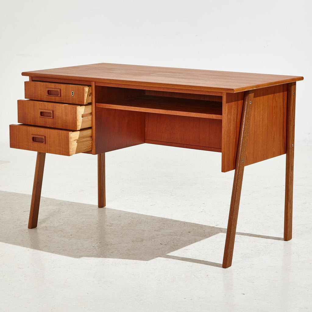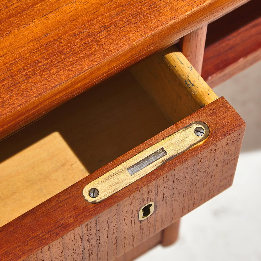 1970년대 3단 서랍이 있는 덴마크 티크 책상. 독특한 손잡이와 뒷면에 실용적인 수납 공간이 있습니다. 테이블의 나무 부분이 완전히 복원되었습니다. 서랍의 열쇠가 없습니다.