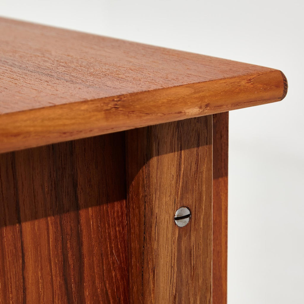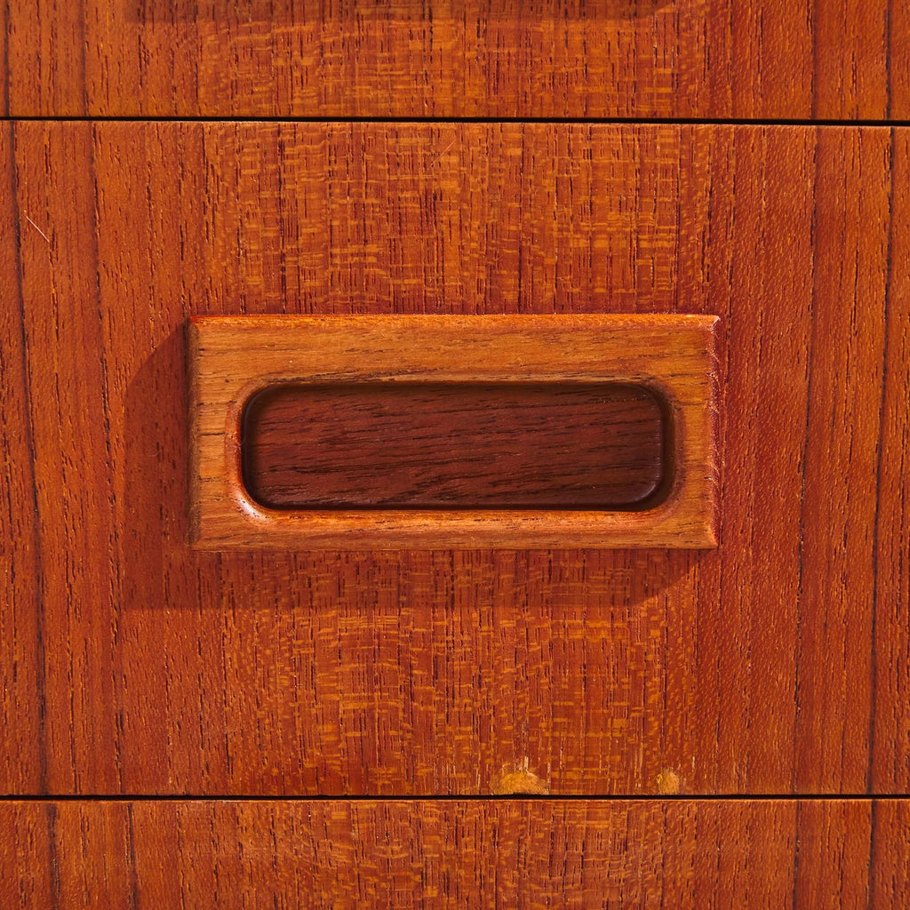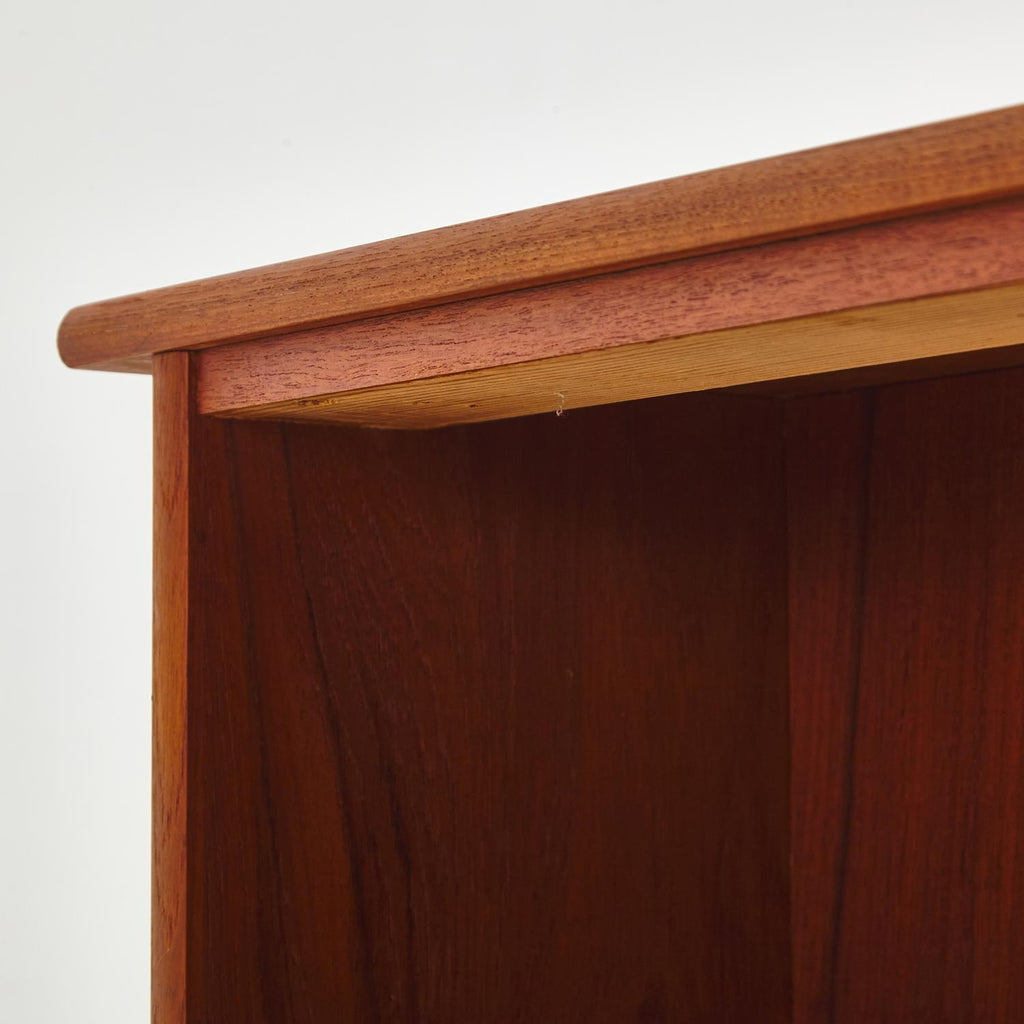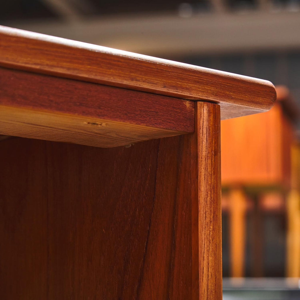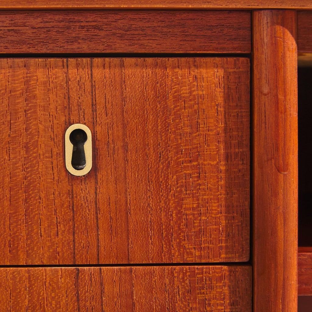1970년대 3단 서랍이 있는 덴마크 티크 책상. 독특한 손잡이와 뒷면에 실용적인 수납 공간이 있습니다. 테이블의 나무 부분이 완전히 복원되었습니다. 서랍의 열쇠가 없습니다.