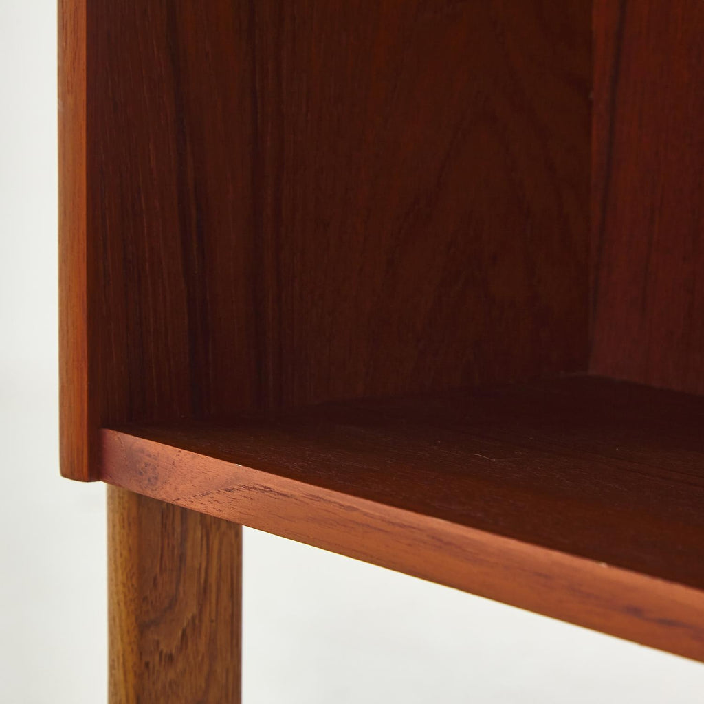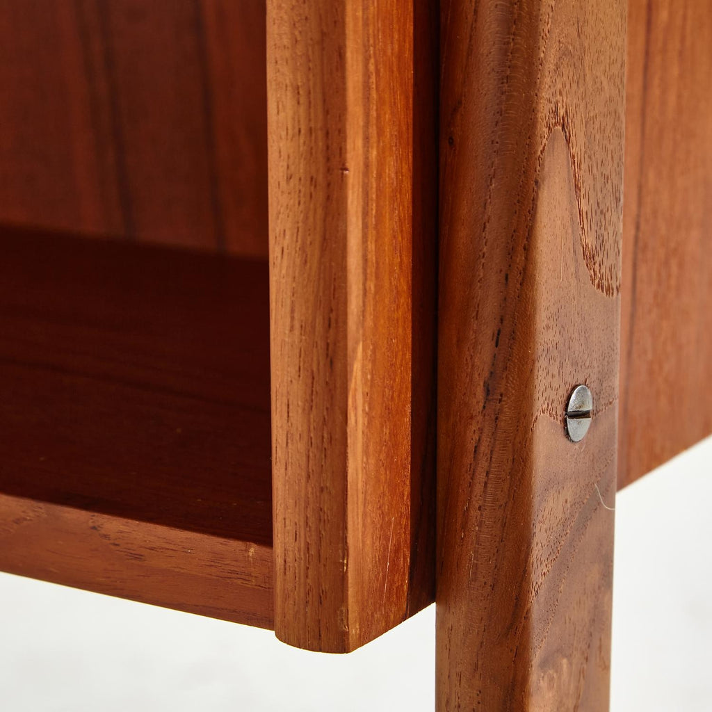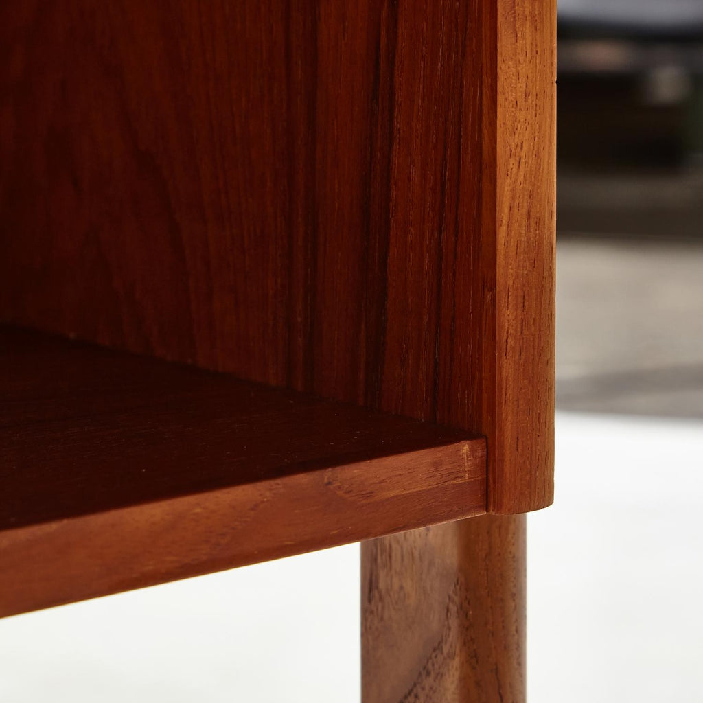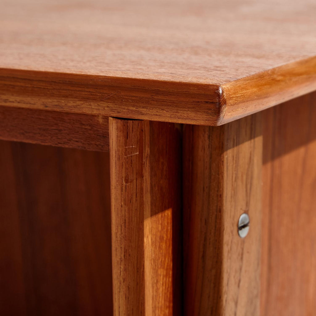 1970년대 3단 서랍이 있는 덴마크 티크 책상. 독특한 손잡이와 뒷면에 실용적인 수납 공간이 있습니다. 테이블의 나무 부분이 완전히 복원되었습니다. 서랍의 열쇠가 없습니다.
