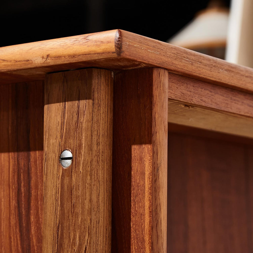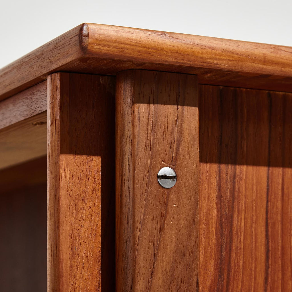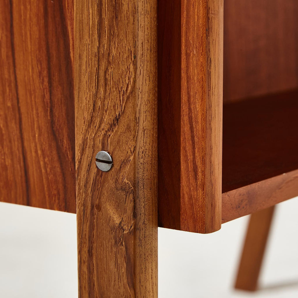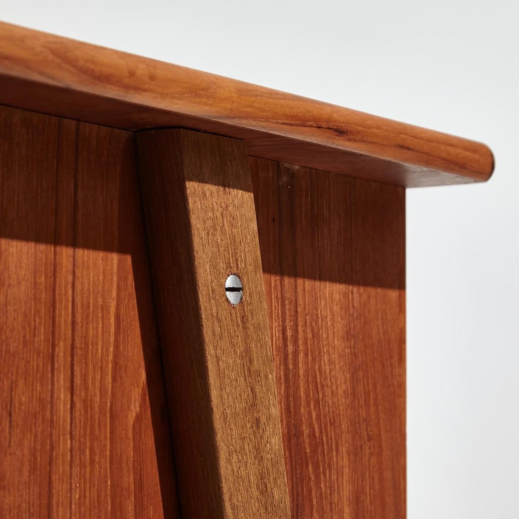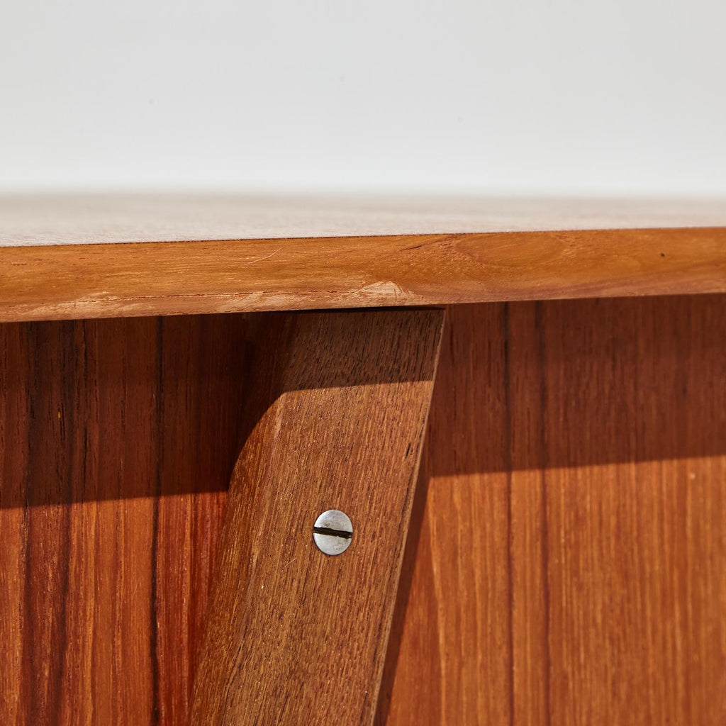 1970년대 3단 서랍이 있는 덴마크 티크 책상. 독특한 손잡이와 뒷면에 실용적인 수납 공간이 있습니다. 테이블의 나무 부분이 완전히 복원되었습니다. 서랍의 열쇠가 없습니다.