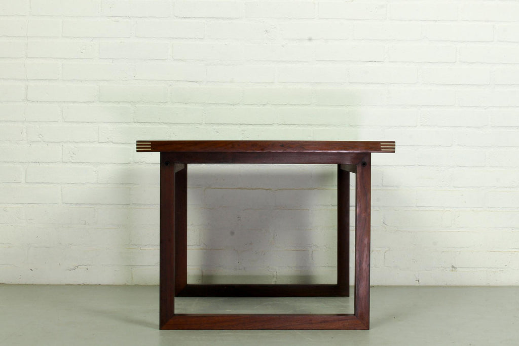 1960년경 덴마크 Heltborg Mobler를 위해 Rud Thygesen이 디자인한 썰매 다리 디자인 로즈우드 테이블. 대조되는 알루미늄 조인트가 정밀하게 노출된 뛰어난 구조.