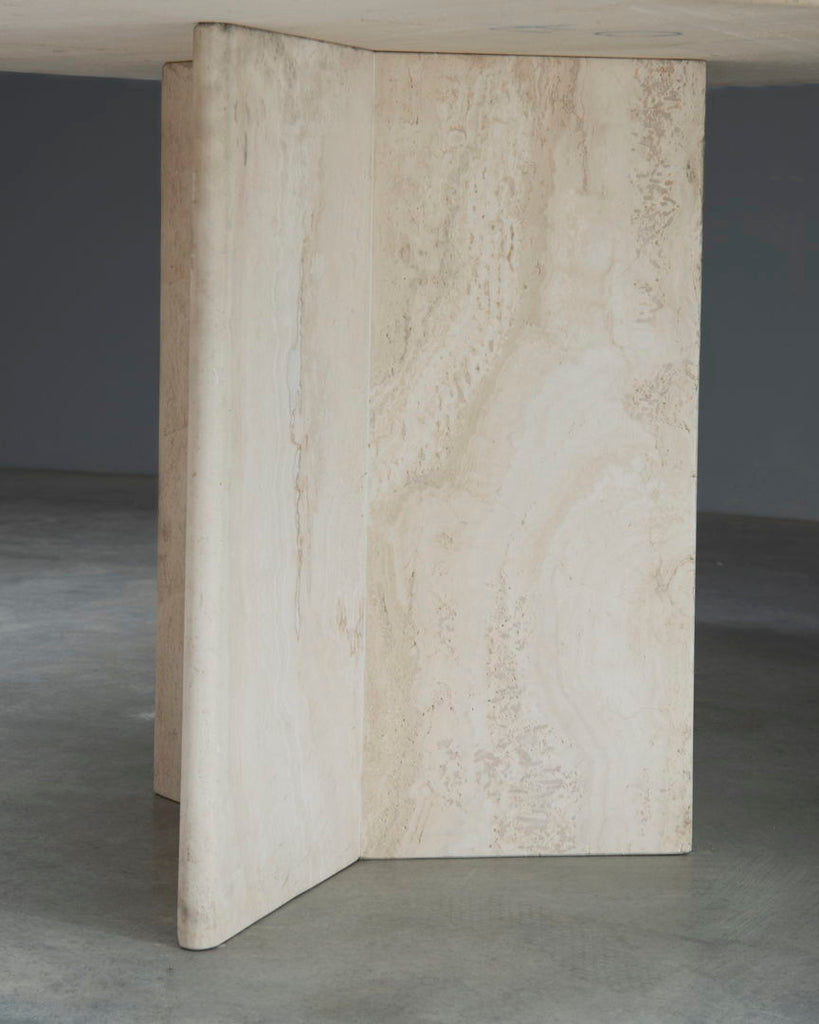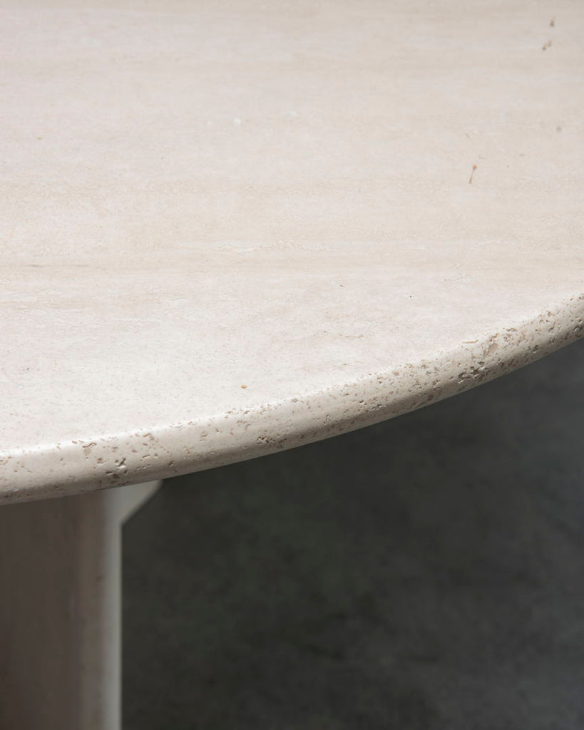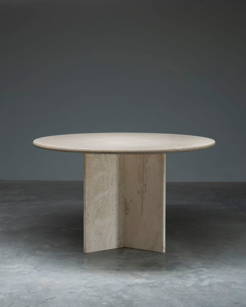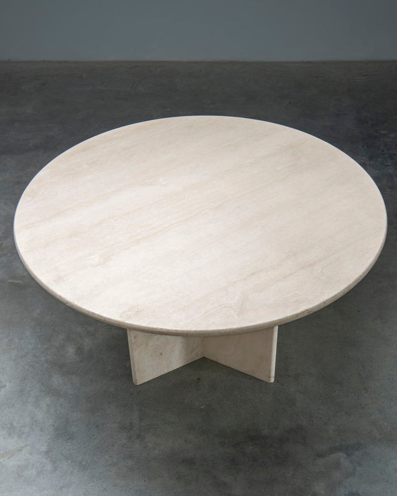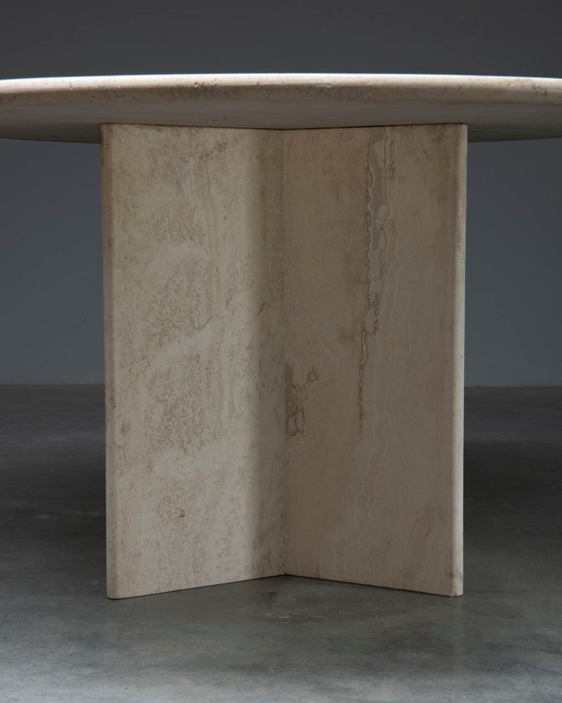A large round dining table in travertine, most likely made in Italy in the 1970s. The tabletop rests freely on the star-foot base.
