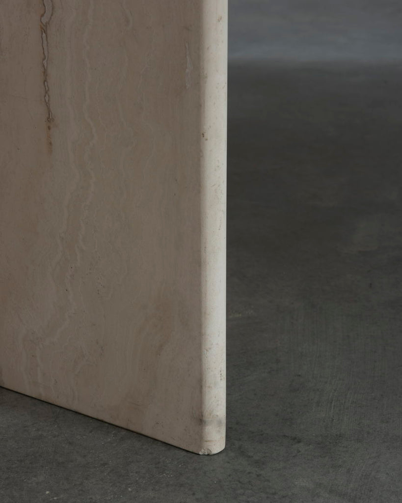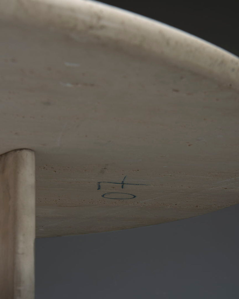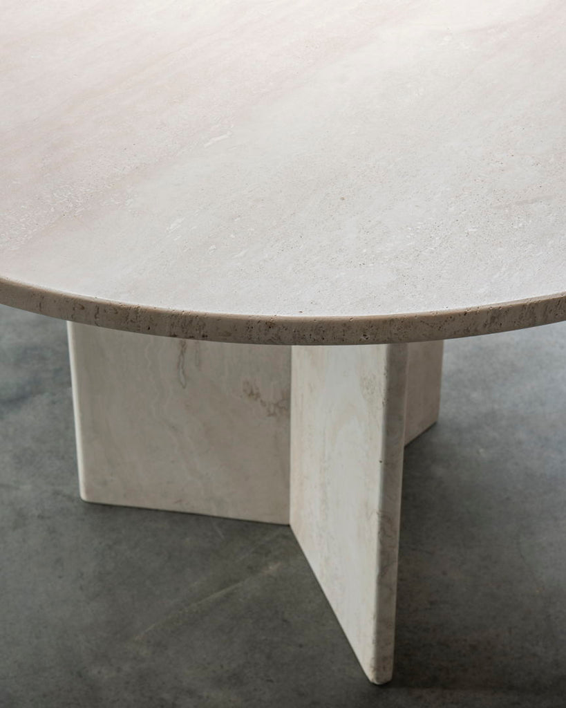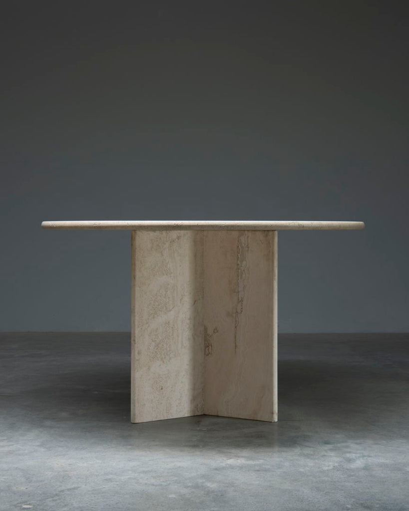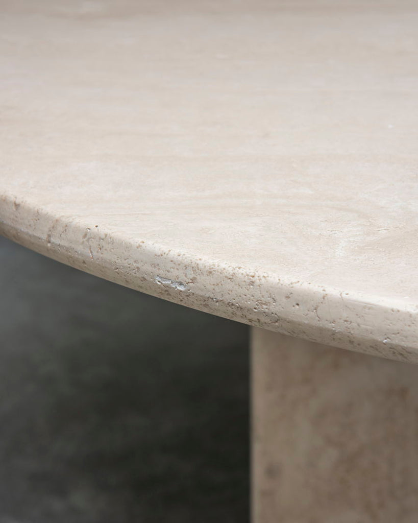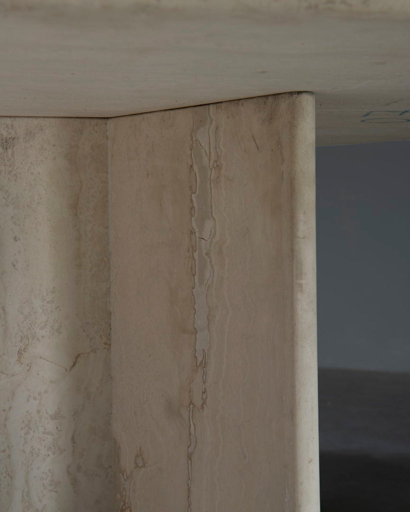 A large round dining table in travertine, most likely made in Italy in the 1970s. The tabletop rests freely on the star-foot base.