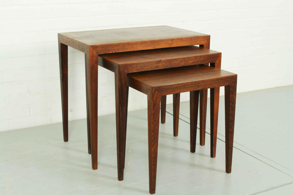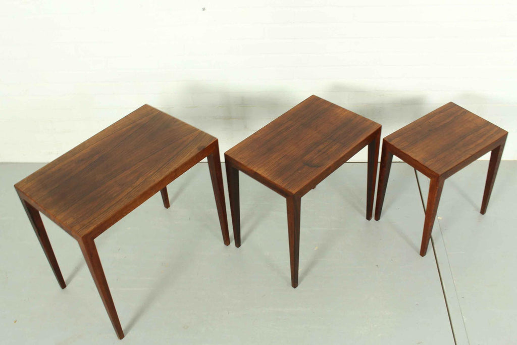 1950년대 덴마크 보벤캄프를 위해 Severin Hansen이 디자인한 로즈우드 네스팅 테이블. 아래에 표시 및 레이블이 지정됩니다. 상태 좋은 미들 테이블은 사진과 같이 약간의 사용감이 있습니다.