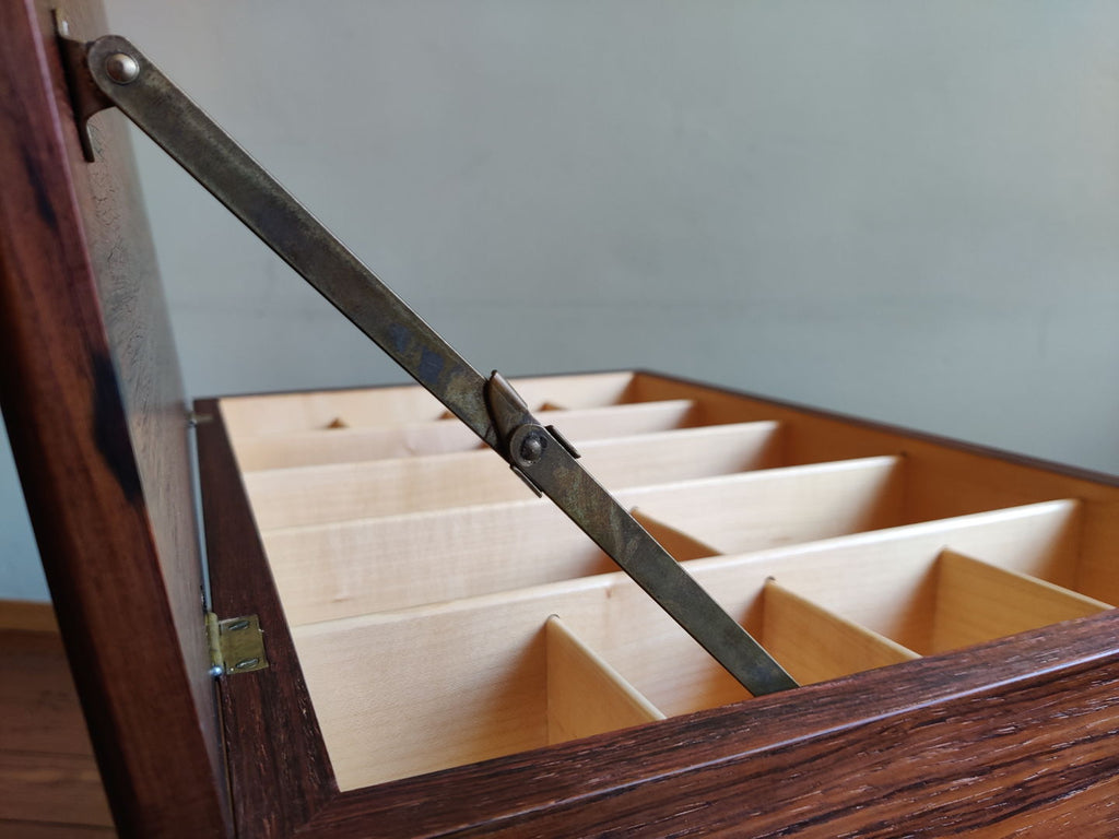 상태 매우 양호하며, 상단 가장자리 주변에 약간의 약간의 움푹 들어간 곳, 눈에 띄는 것은 없습니다. 상단 가장자리에 약간의 움푹 들어간 곳이 몇 군데 있습니다. 자세한 정보나 사진을 원하시면 언제든지 연락주시기 바랍니다. 품목은 독일 슈투트가르트에 있습니다. 다른 종류의 빈티지 디자인 가구를 찾고 계시다면 저희 매장을 방문하시거나 저희에게 연락해주세요.