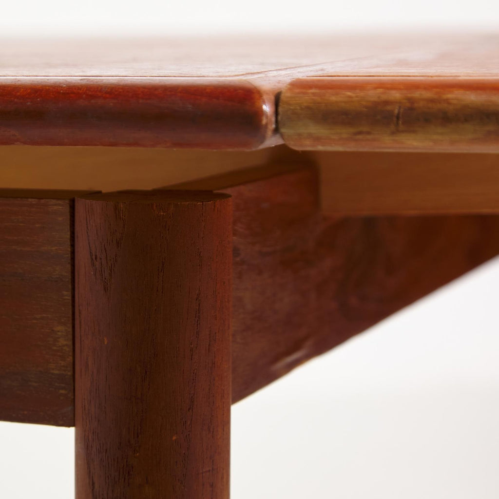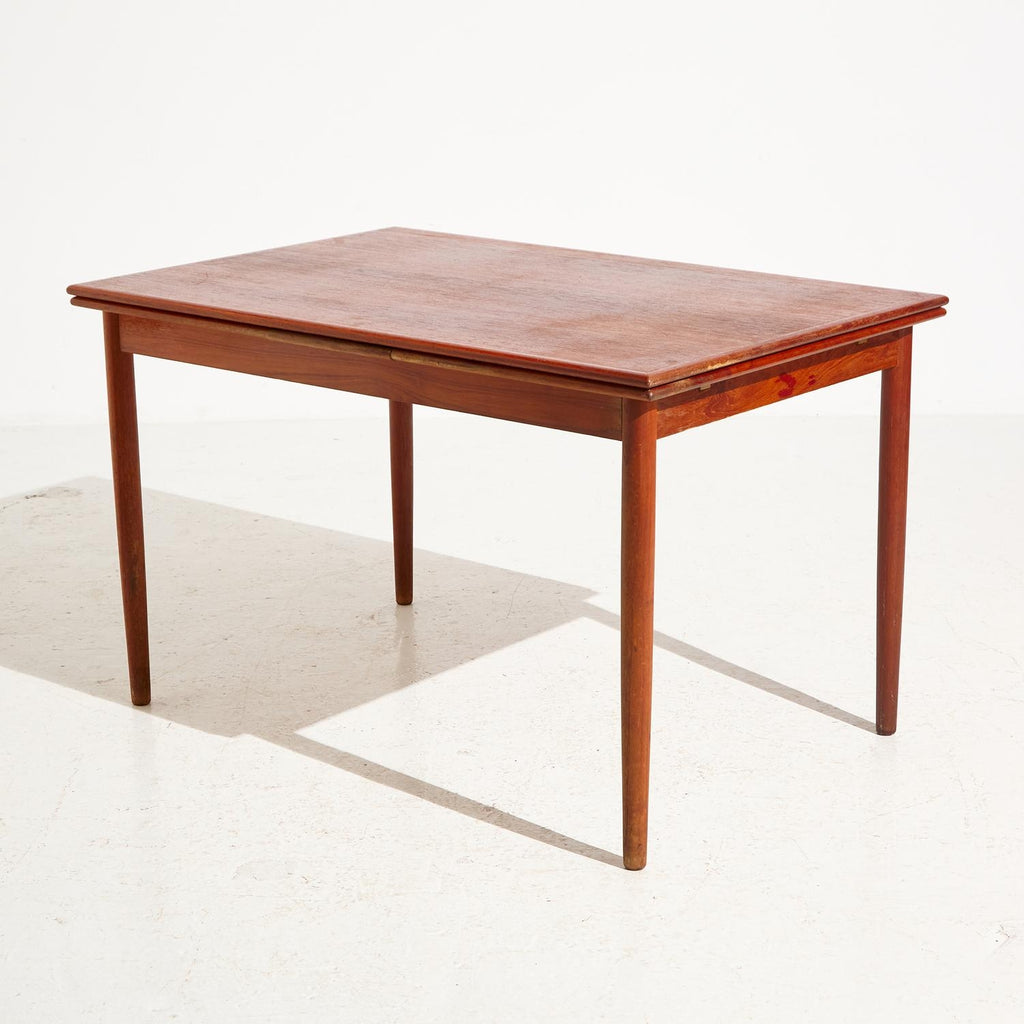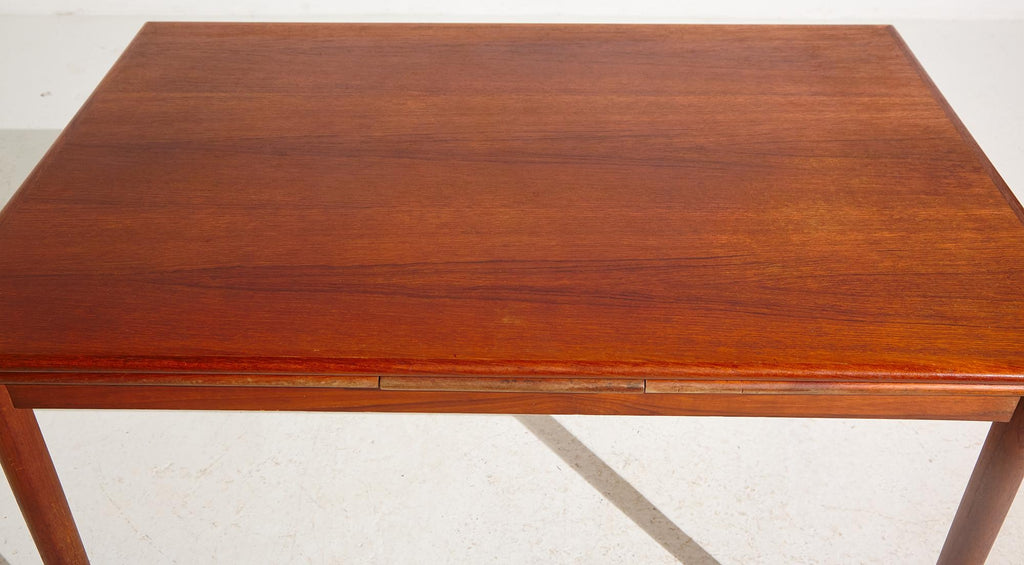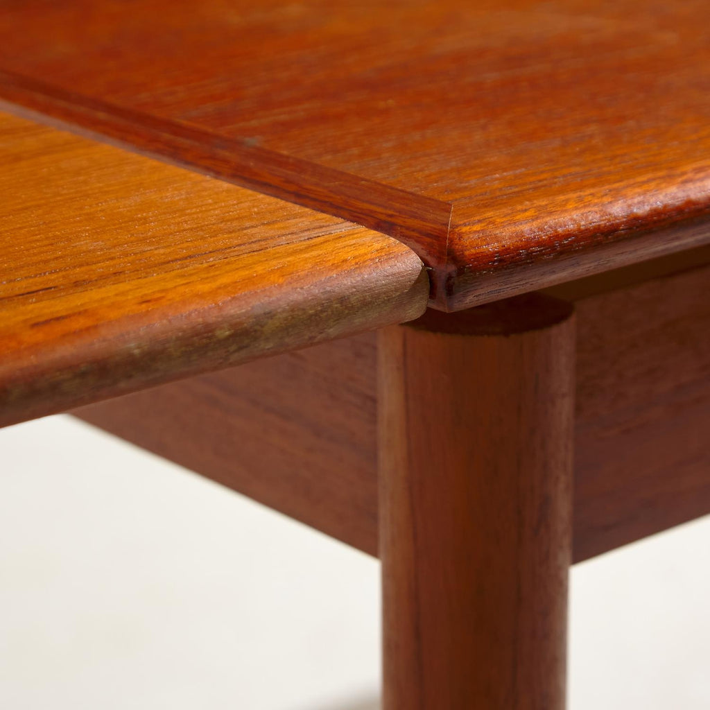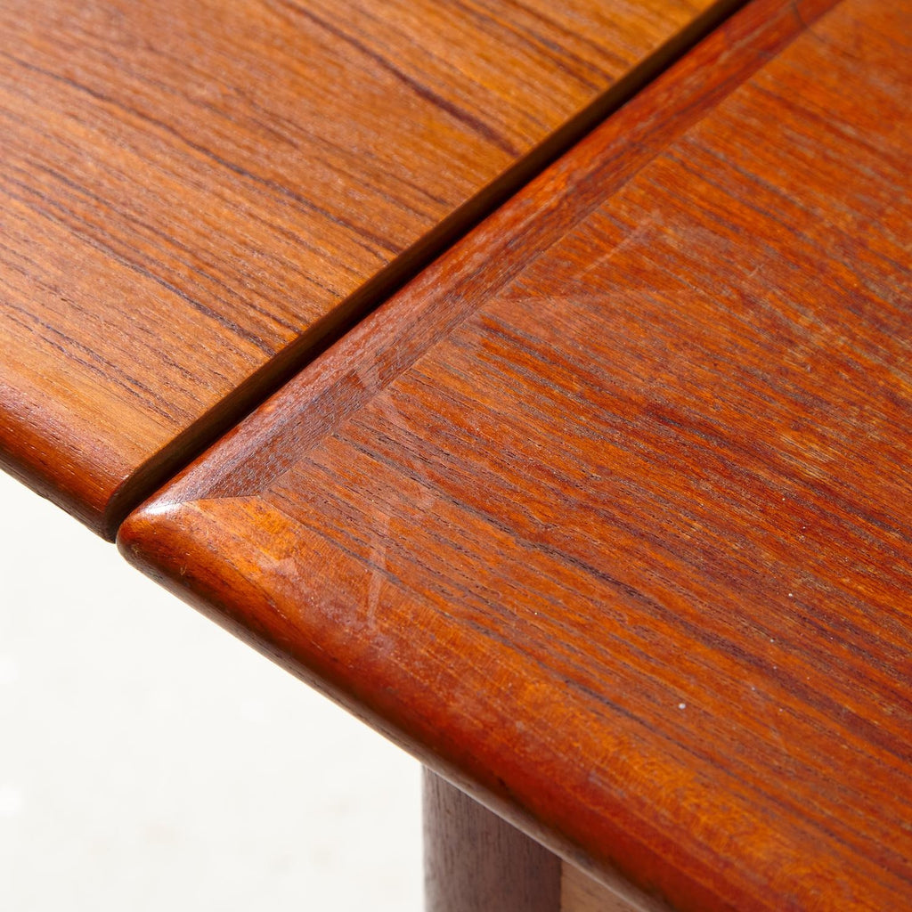 확장 부품 2개가 있는 1960년대 덴마크 티크 식탁. 나무 부분에 여러 표면 긁힘 및 마모가 있습니다. 약간의 사용 흔적이 있는 좋은 빈티지 상태입니다.