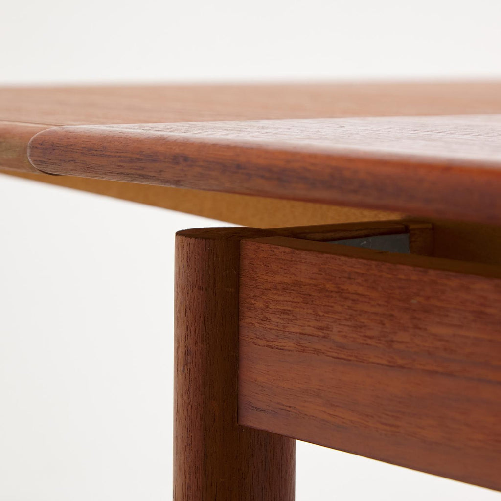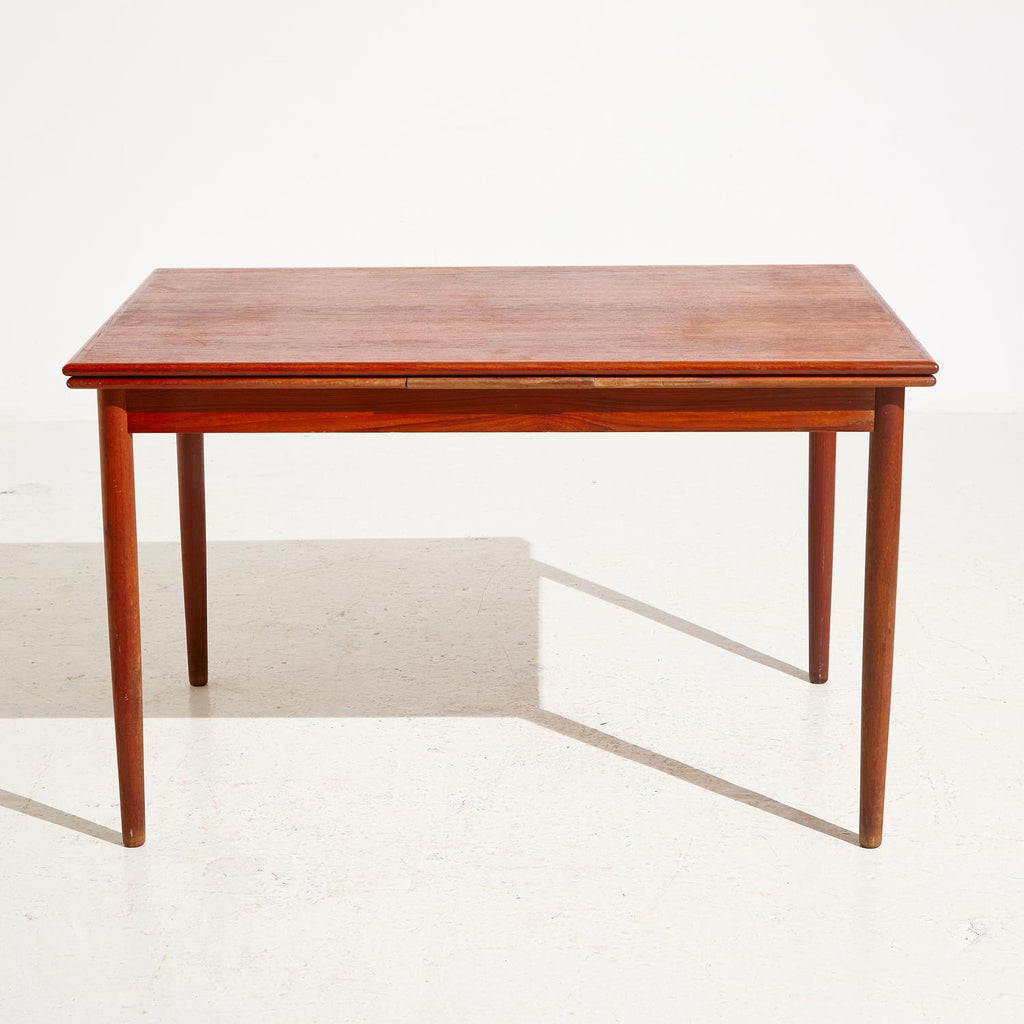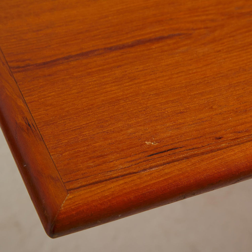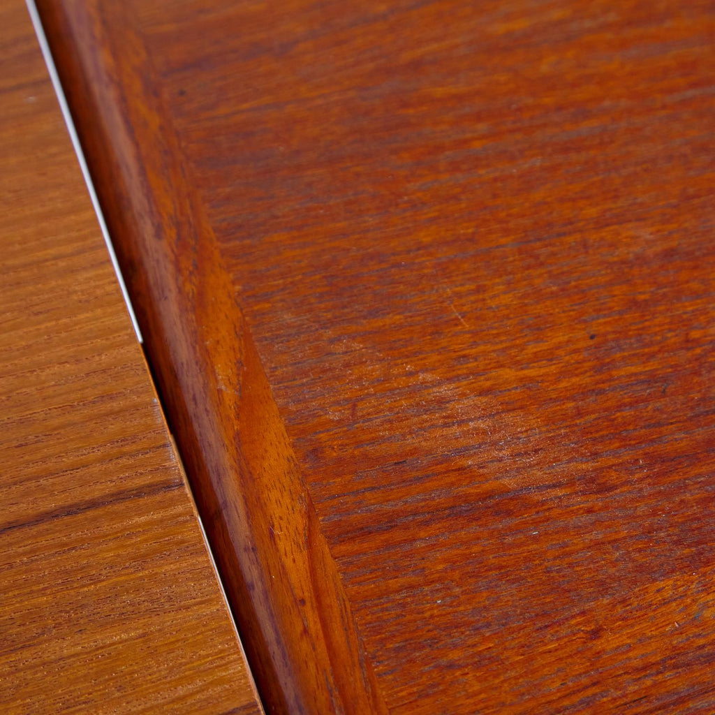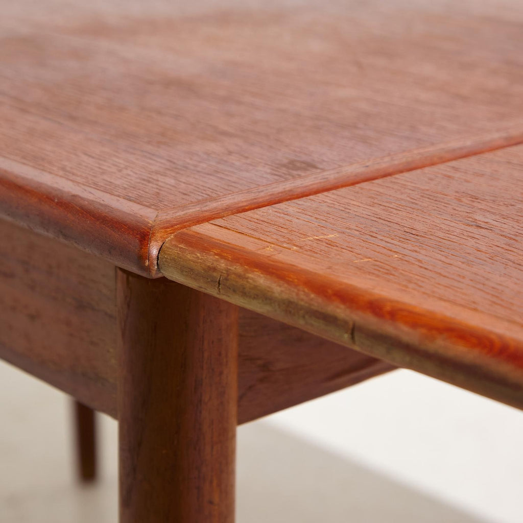 확장 부품 2개가 있는 1960년대 덴마크 티크 식탁. 나무 부분에 여러 표면 긁힘 및 마모가 있습니다. 약간의 사용 흔적이 있는 좋은 빈티지 상태입니다.