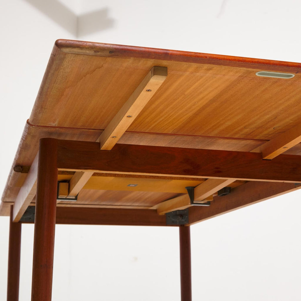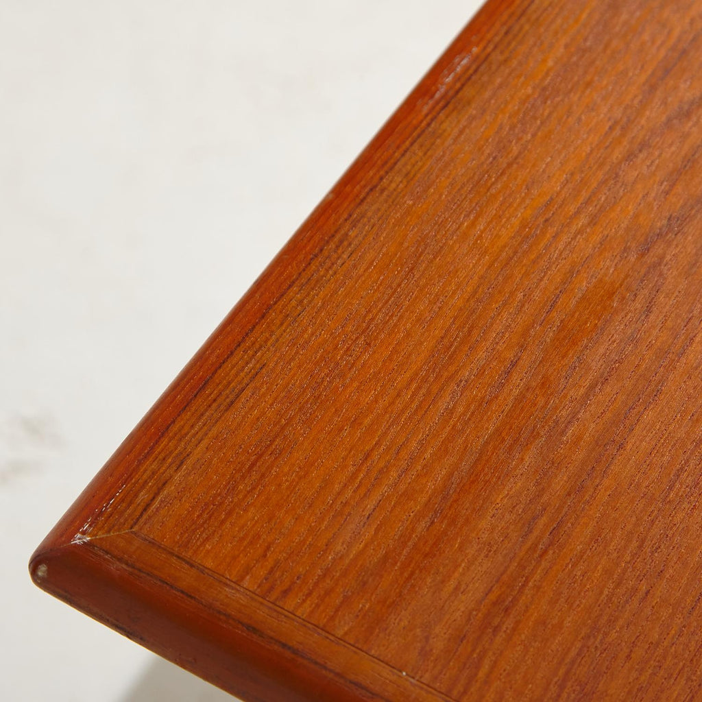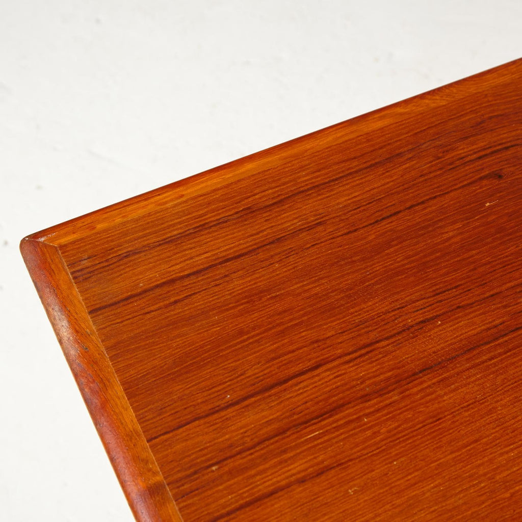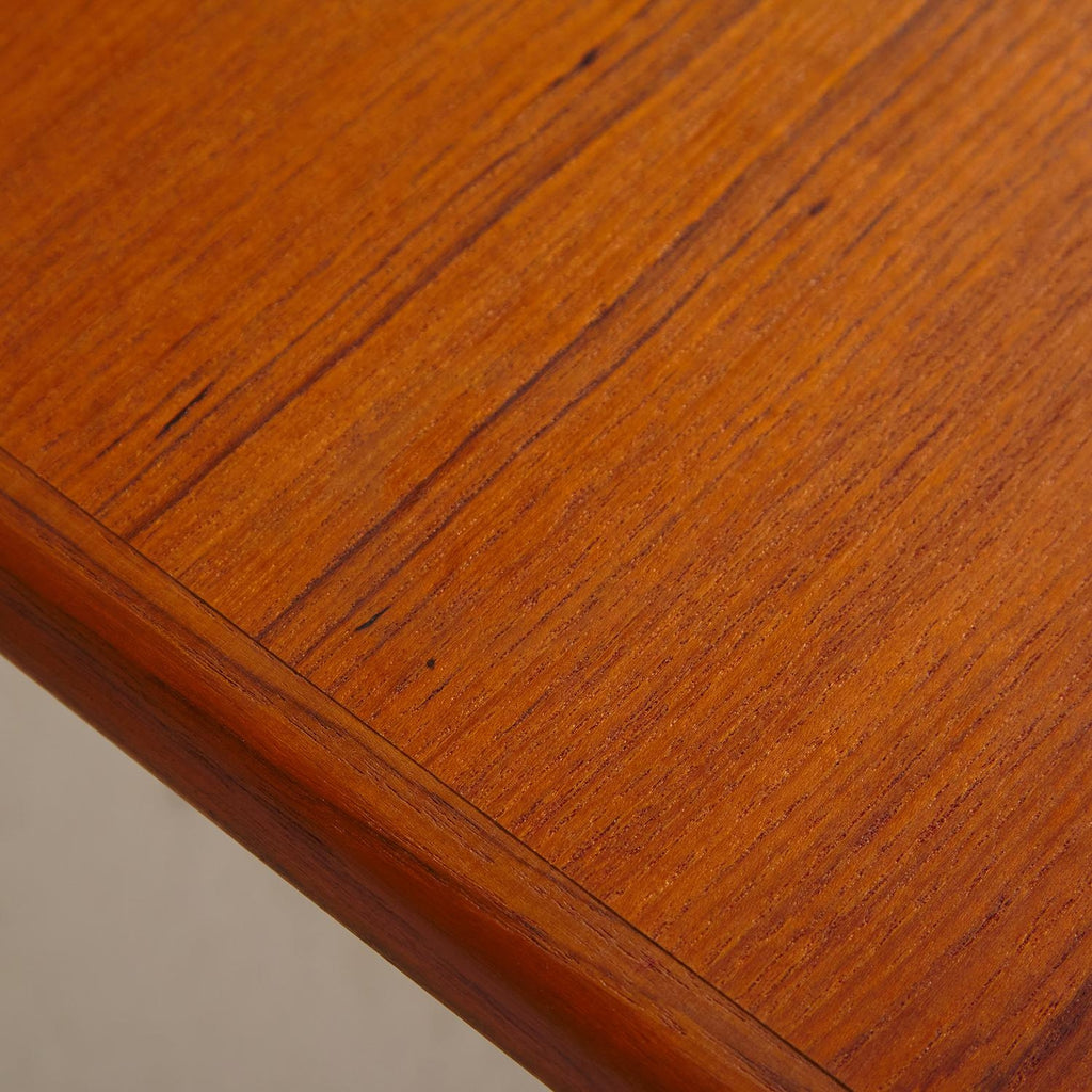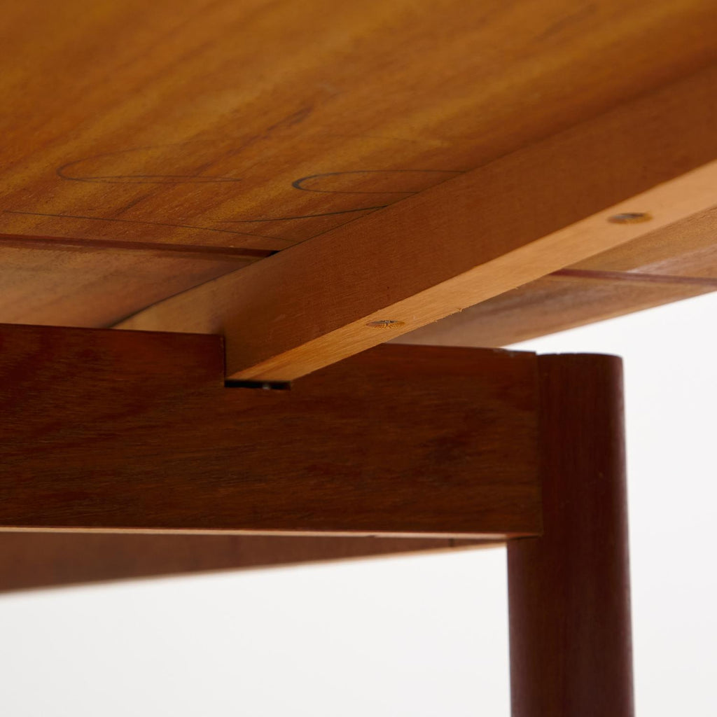 확장 부품 2개가 있는 1960년대 덴마크 티크 식탁. 나무 부분에 여러 표면 긁힘 및 마모가 있습니다. 약간의 사용 흔적이 있는 좋은 빈티지 상태입니다.