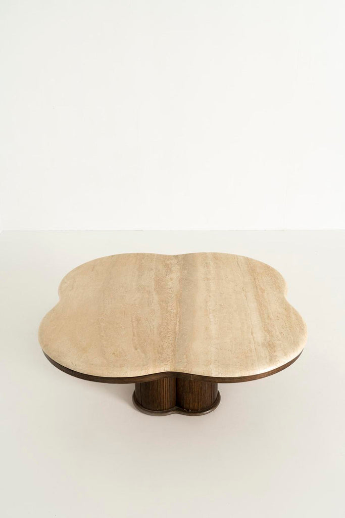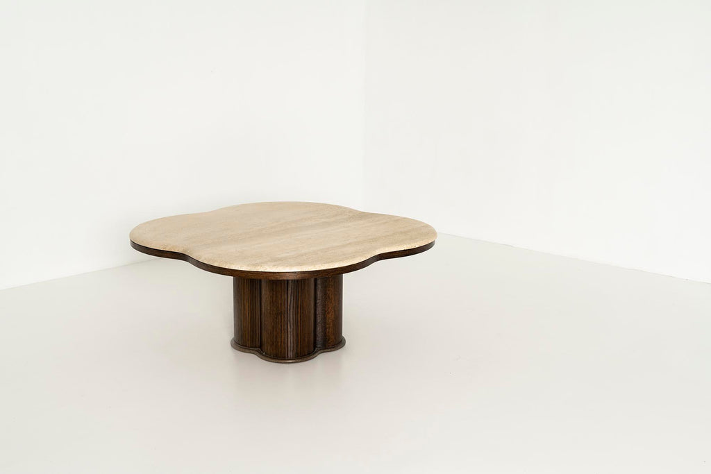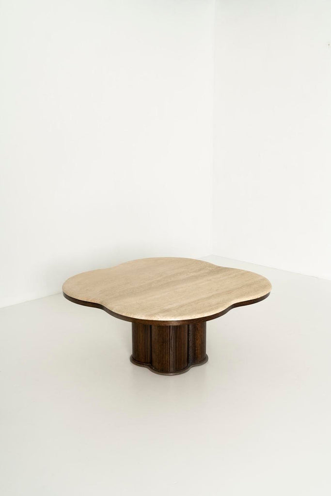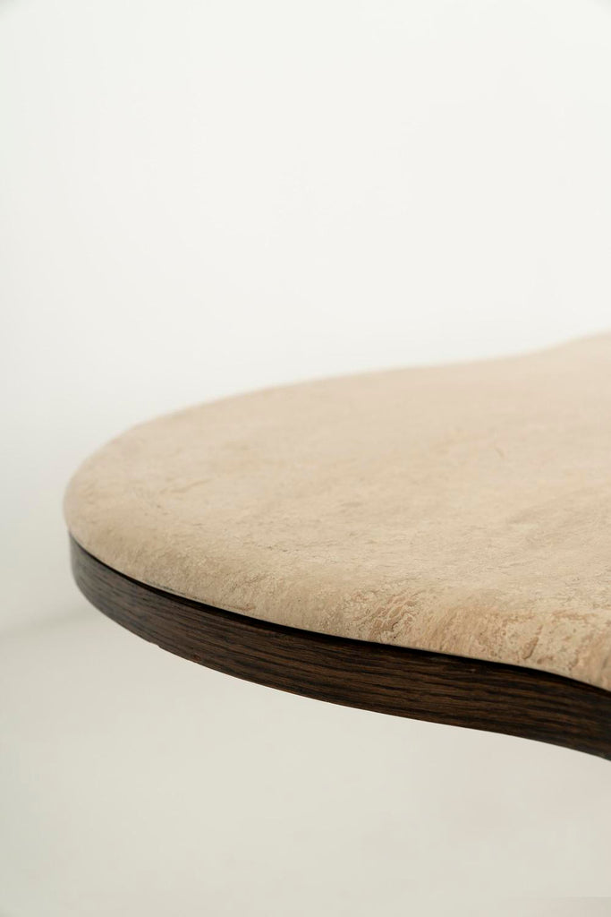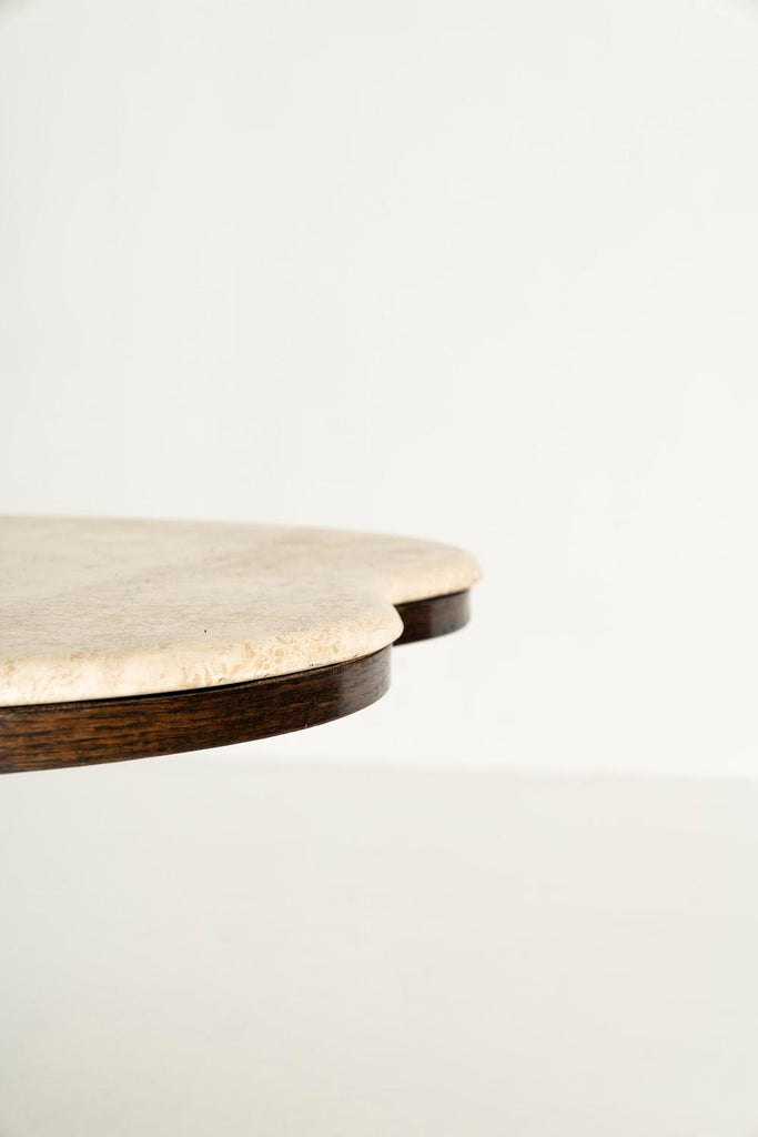 이 테이블은 나무 베이스와 트래버틴 상판을 갖추고 있습니다. 테이블은 클로버 모양입니다. 나무 받침대는 바닥에 완전히 가장자리가 있는 멋진 디테일이 특징입니다. 우리는 어두운 색상의 나무와 자연석 상판의 따뜻한 조합을 좋아합니다. 테이블은 특히 바닥에 일반적인 마모와 찢어진 상태로 양호한 상태입니다. 상단에는 칩이 없습니다.