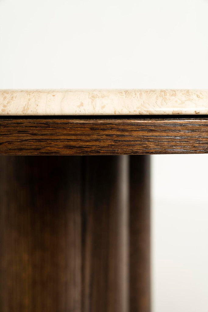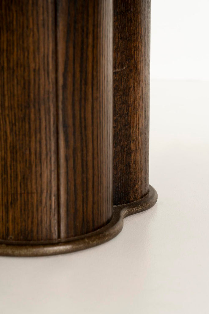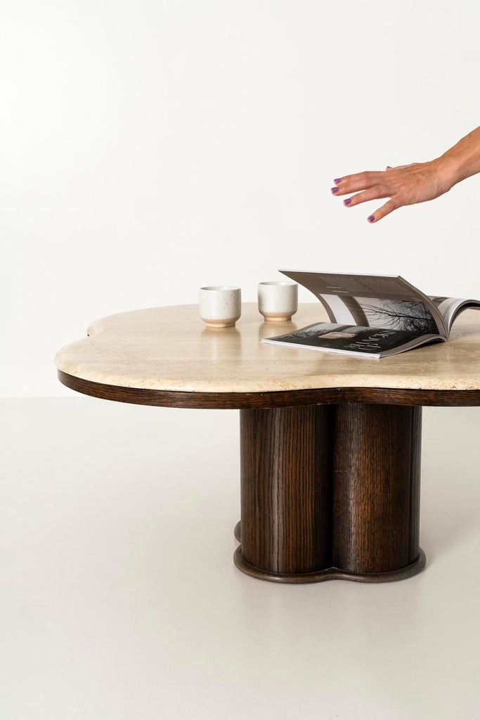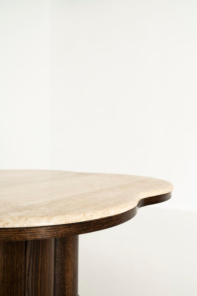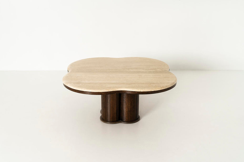 이 테이블은 나무 베이스와 트래버틴 상판을 갖추고 있습니다. 테이블은 클로버 모양입니다. 나무 받침대는 바닥에 완전히 가장자리가 있는 멋진 디테일이 특징입니다. 우리는 어두운 색상의 나무와 자연석 상판의 따뜻한 조합을 좋아합니다. 테이블은 특히 바닥에 일반적인 마모와 찢어진 상태로 양호한 상태입니다. 상단에는 칩이 없습니다.