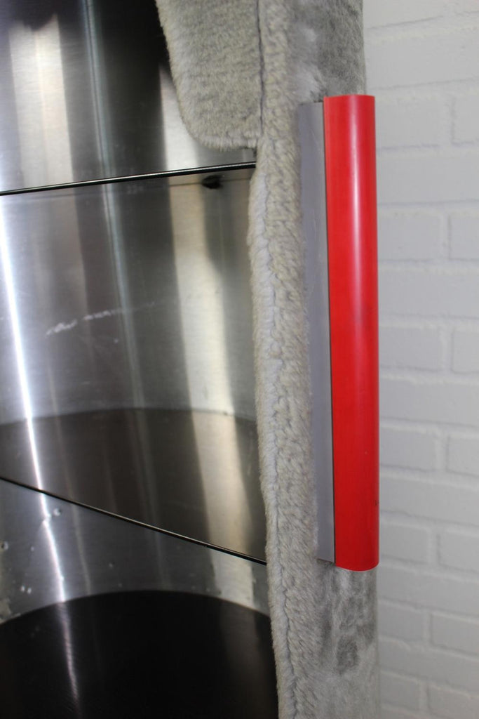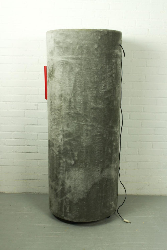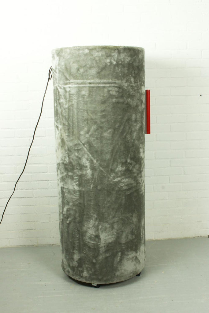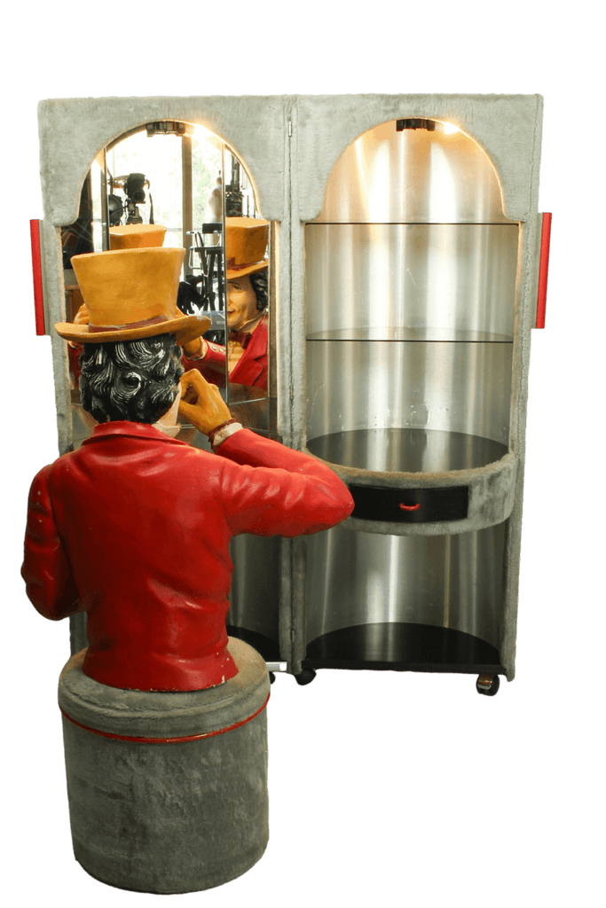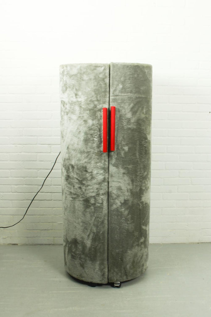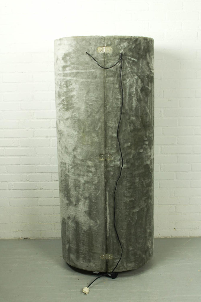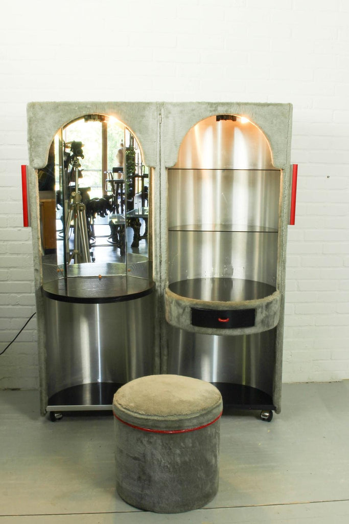 1970년대 이탈리아 루이지 마소니(Luigi Massoni)가 제작한 고급 라이트 그레이 테디 은폐 화장대. 매칭 스툴. 거울 인테리어. 훈제 유리 선반 2개와 작은 서랍, 양쪽에 조명이 있습니다. 치수: 높이 140cm, 너비 56cm (조니워커 동상 미포함)