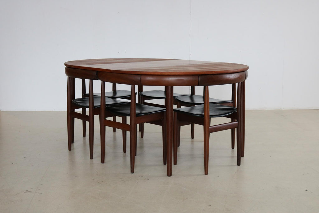 빈티지 식당 세트 | 테이블 | 의자 | 프렘 로일 | Hans Olsen이 Frem Rojle을 위해 디자인한 1960년대 덴마크 디자인 클래식 다이닝룸 세트. 의자가 테이블에 "떨어지는" 우아한 디자인. 테이블은 6개의 의자를 수용할 수 있도록 확장 가능합니다. 기간 | 60년대 디자인 | 한스 올센 | 프렘 로일 | 스웨덴 상황 | 좋은 | 가벼운 사용 흔적 | 더 단단한 좌석 크기 | 74.5 x 120 x 120(hxwxd) 51cm의 추가 접이식 잎; 세부 정보 | 티크; 가죽; 확장 가능; 의자 6개 세트 + 테이블; 모델 "Roundette"; 품목 번호 | 2004년
