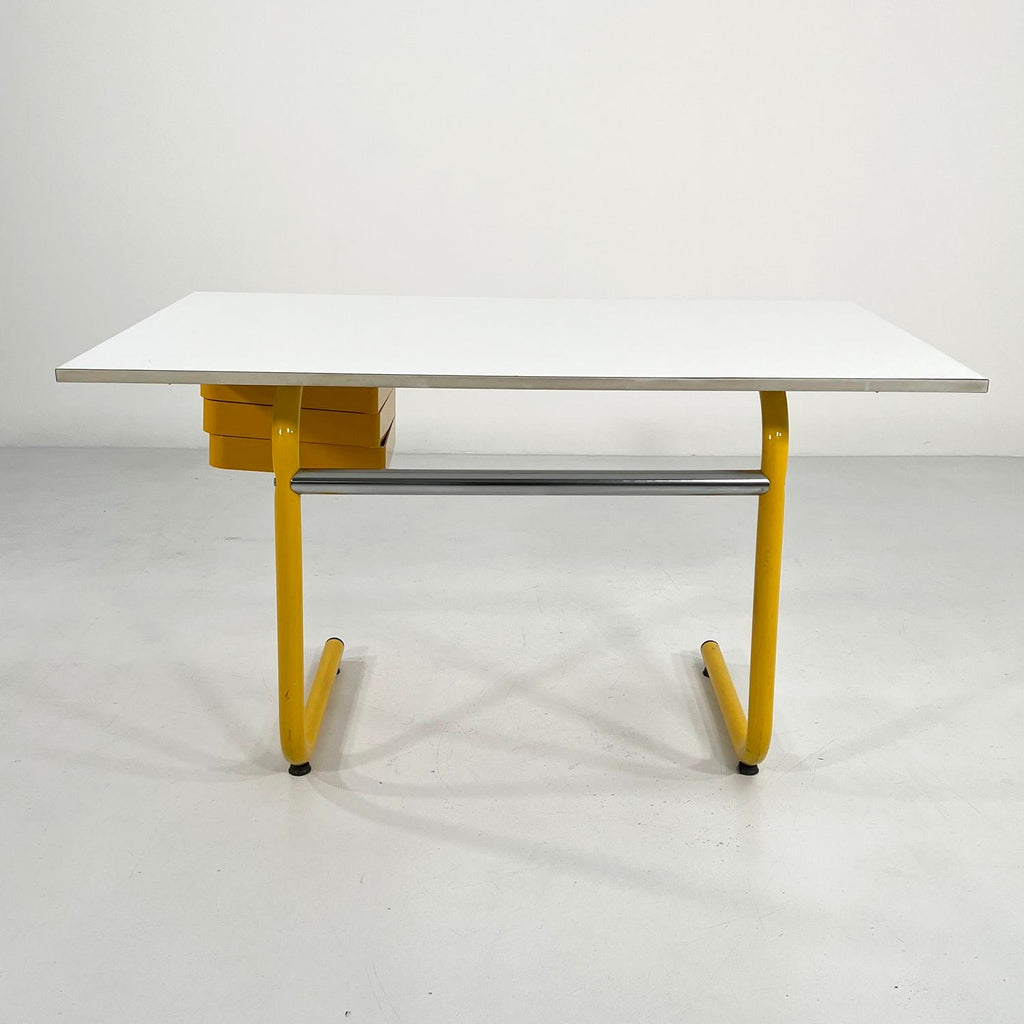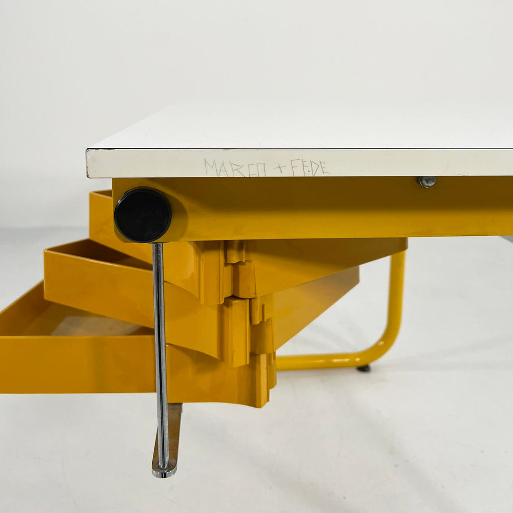 디자이너 - Joe Colombo 프로듀서 - Bieffeplast 모델 - 제도 테이블/책상 디자인 기간 - 70년대 치수 - 너비 125cm x 깊이 74cm x 높이 75cm 재료 - 라미네이트, 금속, 플라스틱 색상 - 노란색, 흰색 경년 및 사용에 따른 가벼운 마모. 테이블 보드 측면에 새겨진 연인 - 세부 사항의 사진을 참조하십시오.