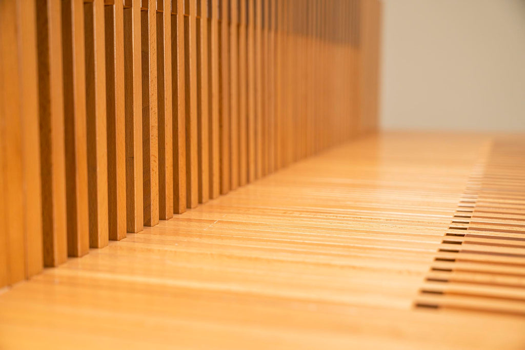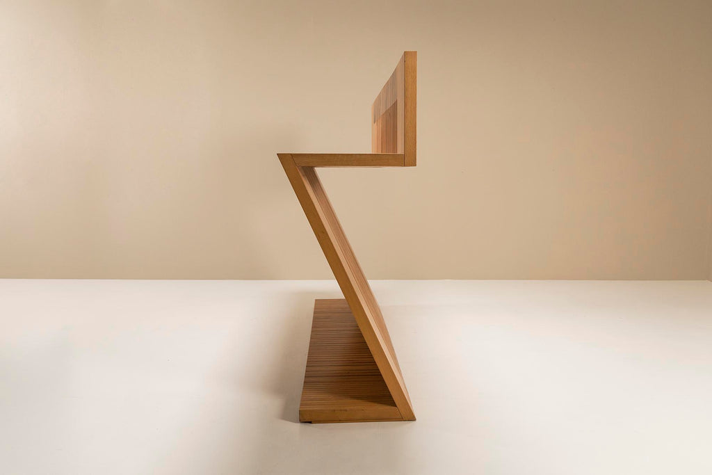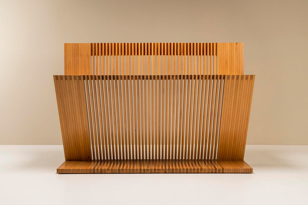 1980년대의 이 이탈리아 제품은 실제로 콘솔로 분류될 수 있을 뿐만 아니라 더 모호하고 혼합된 특성을 가지고 있습니다. Z자 모양과 높이로 인해 다양한 활용이 가능한 제품입니다. 따라서 콘솔 역할을 할 수 있지만 그 위에 앉거나 그 자체로 개체로 사용할 수도 있습니다. 측면에서 보면 게릿 리트벨트의 지그재그 의자가 연상되는 디자인입니다. 형태, 기능 및 구성 간의 순수한 합성 사례로 널리 알려진 의자. 아마도 이것은 디자이너에게도 영감을 주었고 이 디자인의 비율을 약간 흔들어서 작은 고개를 끄덕였습니다. 외부는 서로 단단히 연결된 2cm 두께와 4cm 너비의 참나무 칸막이로 구성됩니다. 외부에서 26센티미터를 측정한 후 슬랫을 번갈아 가며 배치하면 흥미로운 일이 발생합니다. 각 판 사이에는 빛이 비출 수 있는 똑같이 큰 개구부가 있고 양쪽에 아름다운 그림자 놀이가 만들어집니다. 참나무는 이제 색조를 만드는 호두 조각으로 강조됩니다. 너트 슬랫의 색상이 더 어둡기 때문에 개구부 사이의 그림자가 두꺼워진 것처럼 보입니다. 제품은 나무의 자연스러운 모습을 존중하는 방식으로 광택 처리됩니다. 앞서 언급했듯이 이 개체는 빛과 그림자의 유희에 적합하며 예를 들어 뒤에 광원이 있는 경우 놀라운 결과를 생성할 수 있습니다. 항목의 상태는 매우 양호하거나 거의 완벽합니다.